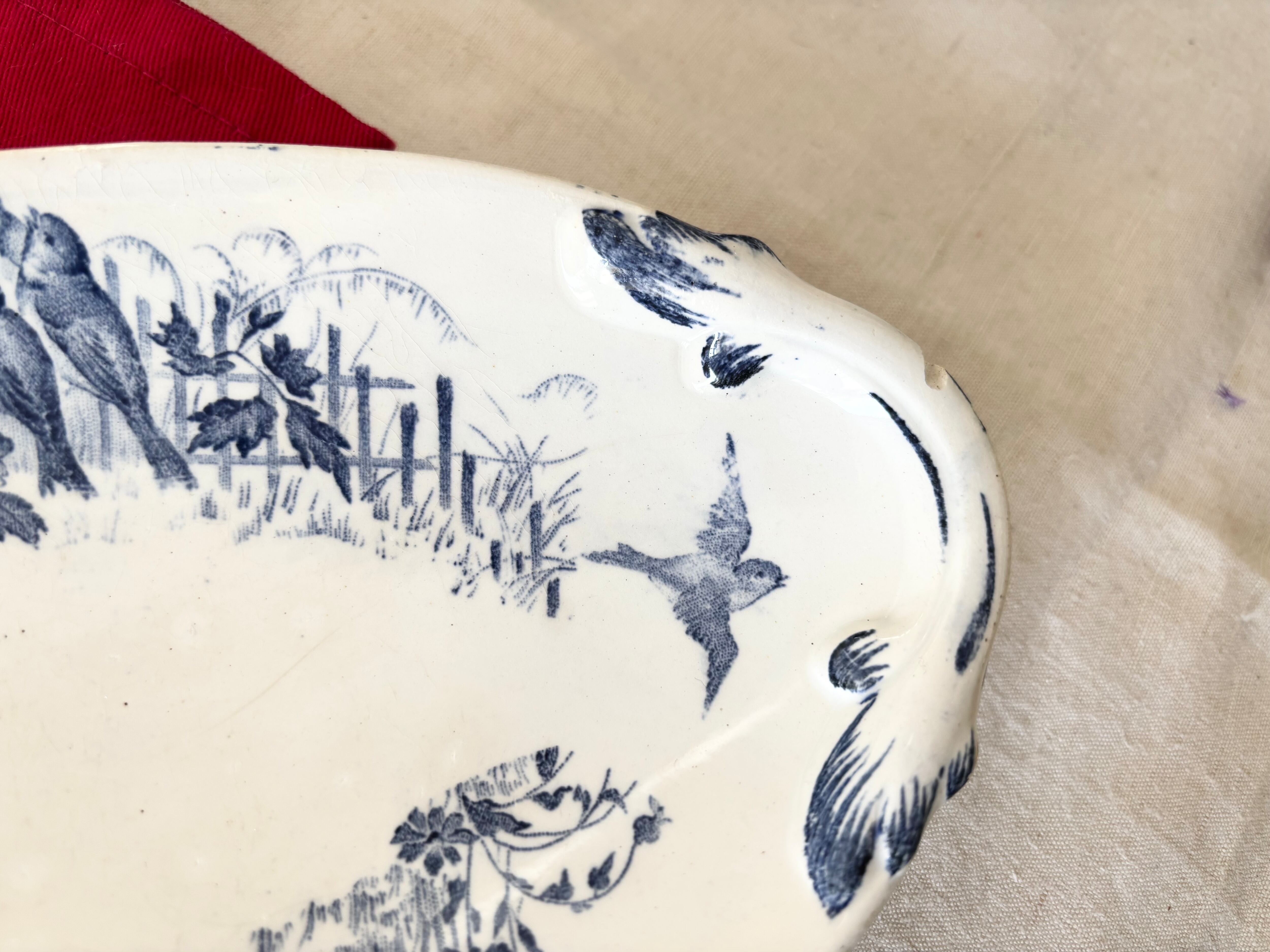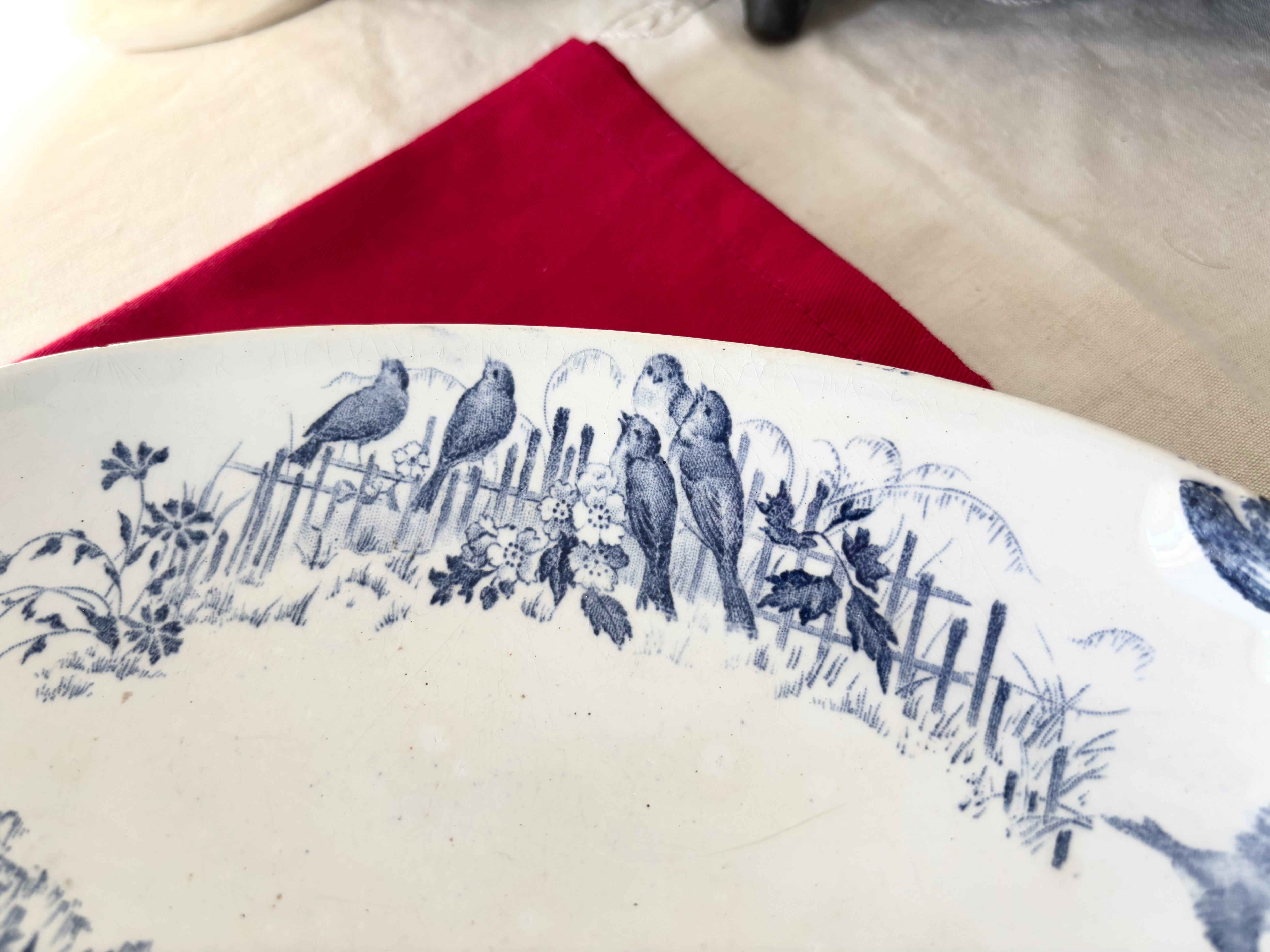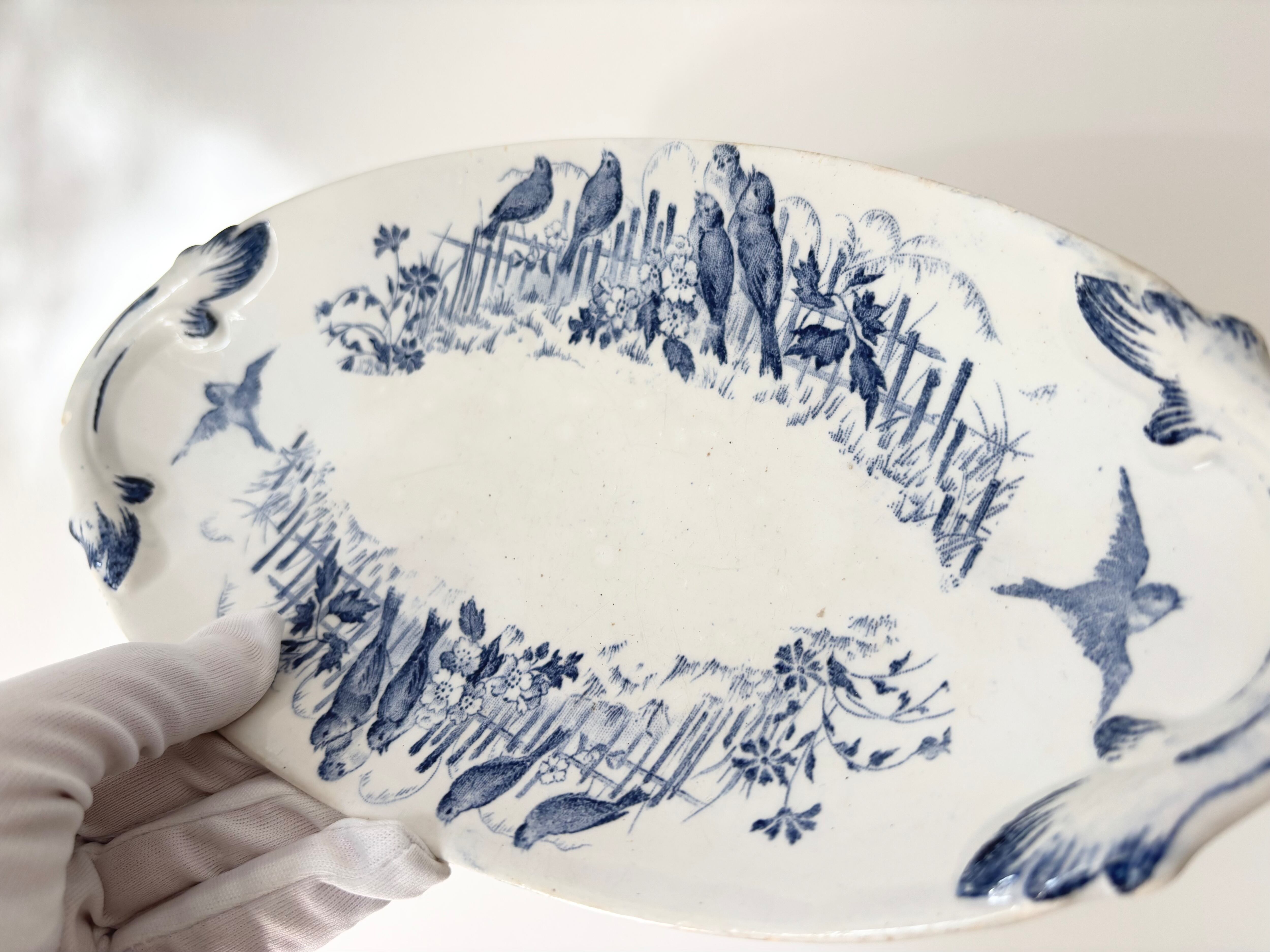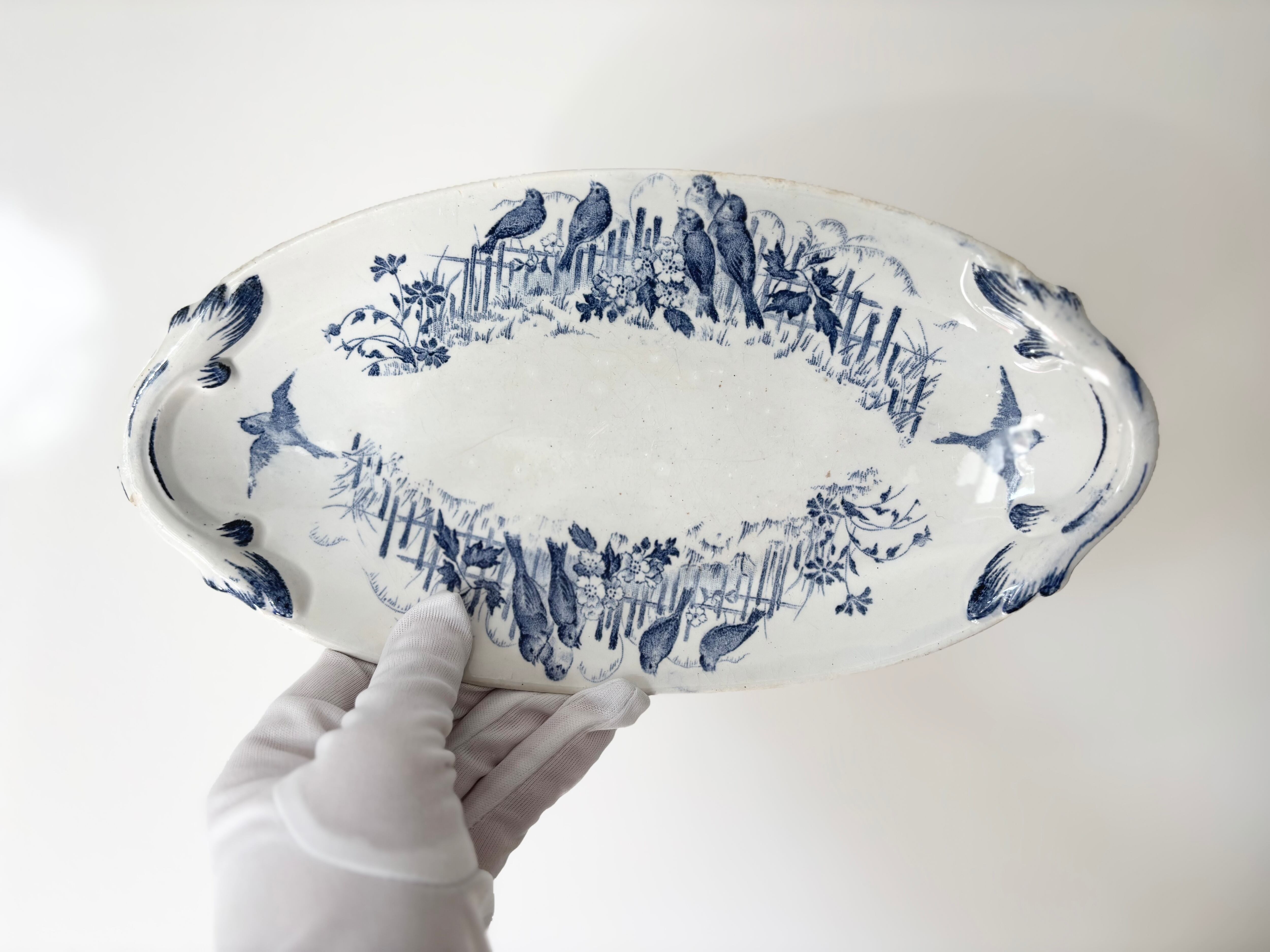 刻印より1884 - 1920年代に製作されたと判別できるこのアイテムは、生成りの白に、明るい藍色で、Bocage(田園風景)に戯れる、沢山の可愛い小鳥達が描かれています。