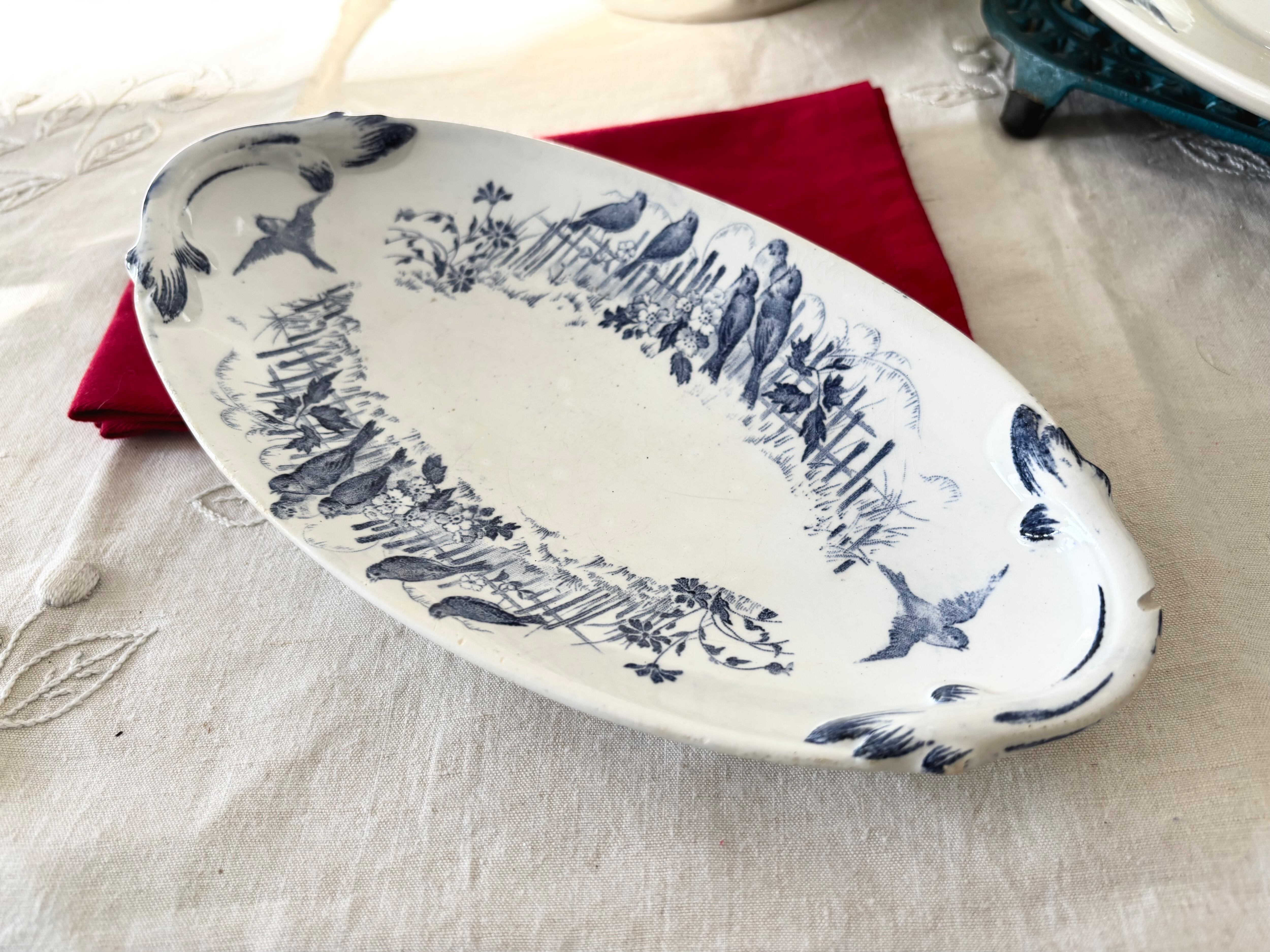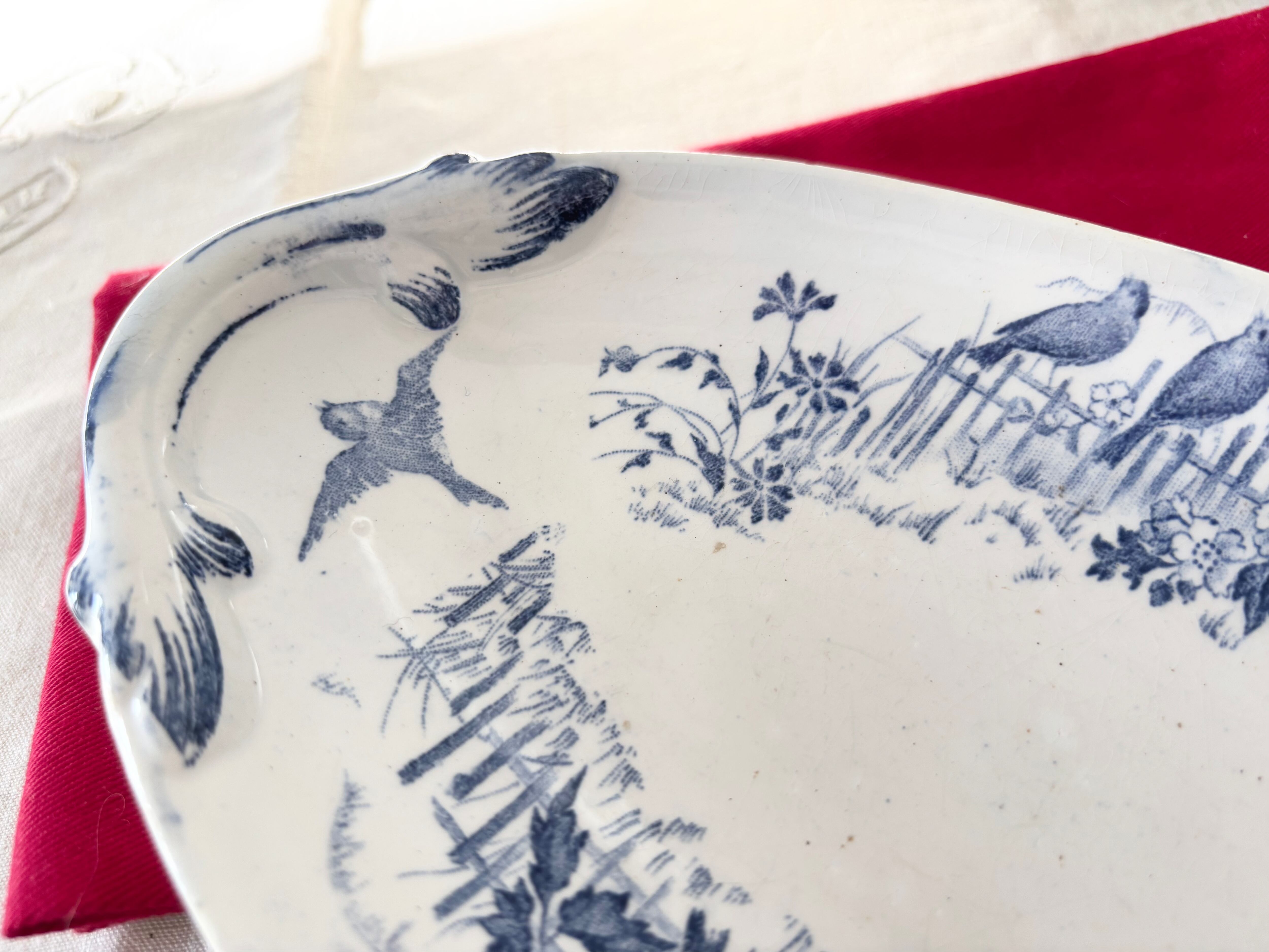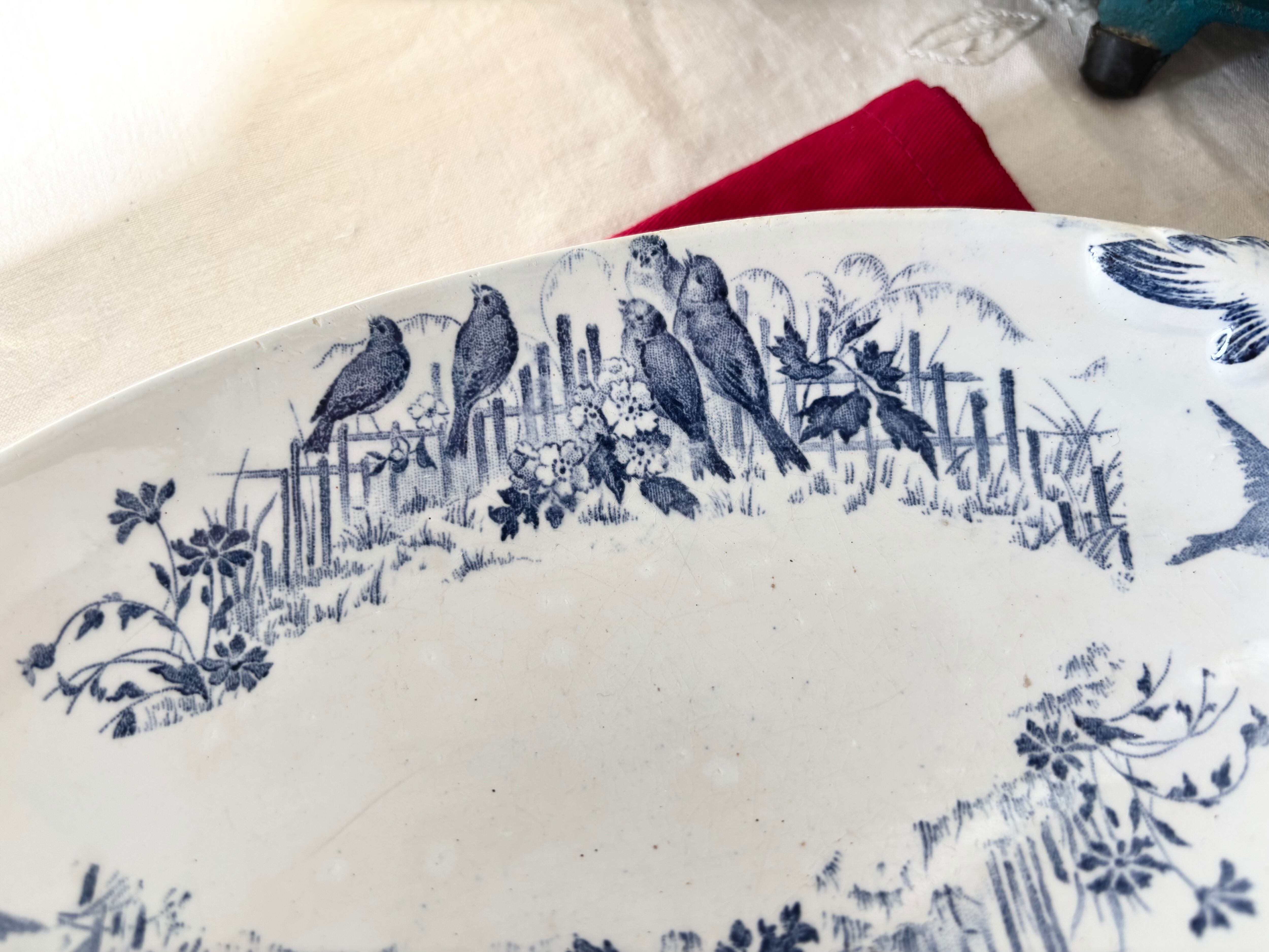 刻印より1884 - 1920年代に製作されたと判別できるこのアイテムは、生成りの白に、明るい藍色で、Bocage(田園風景)に戯れる、沢山の可愛い小鳥達が描かれています。