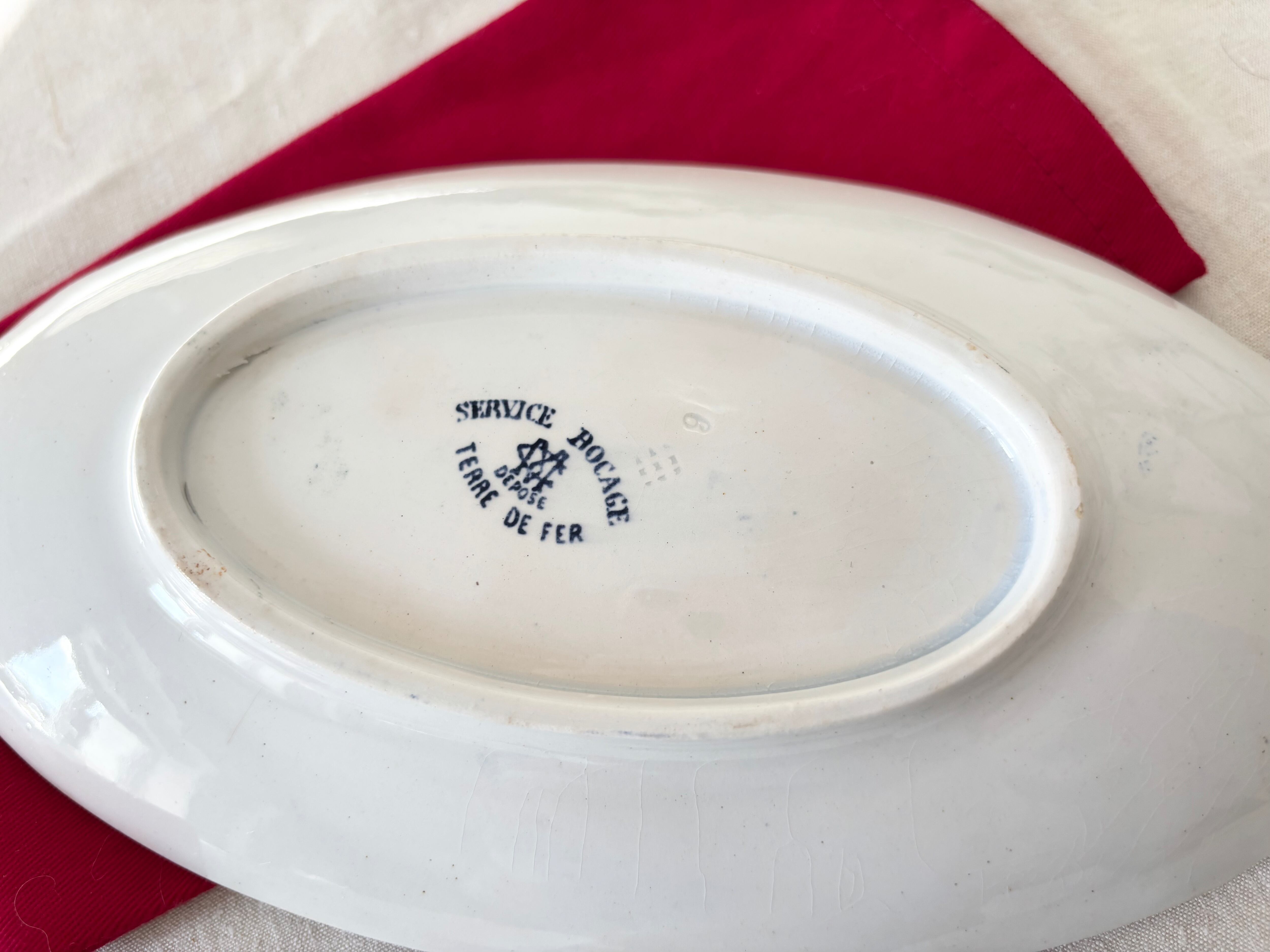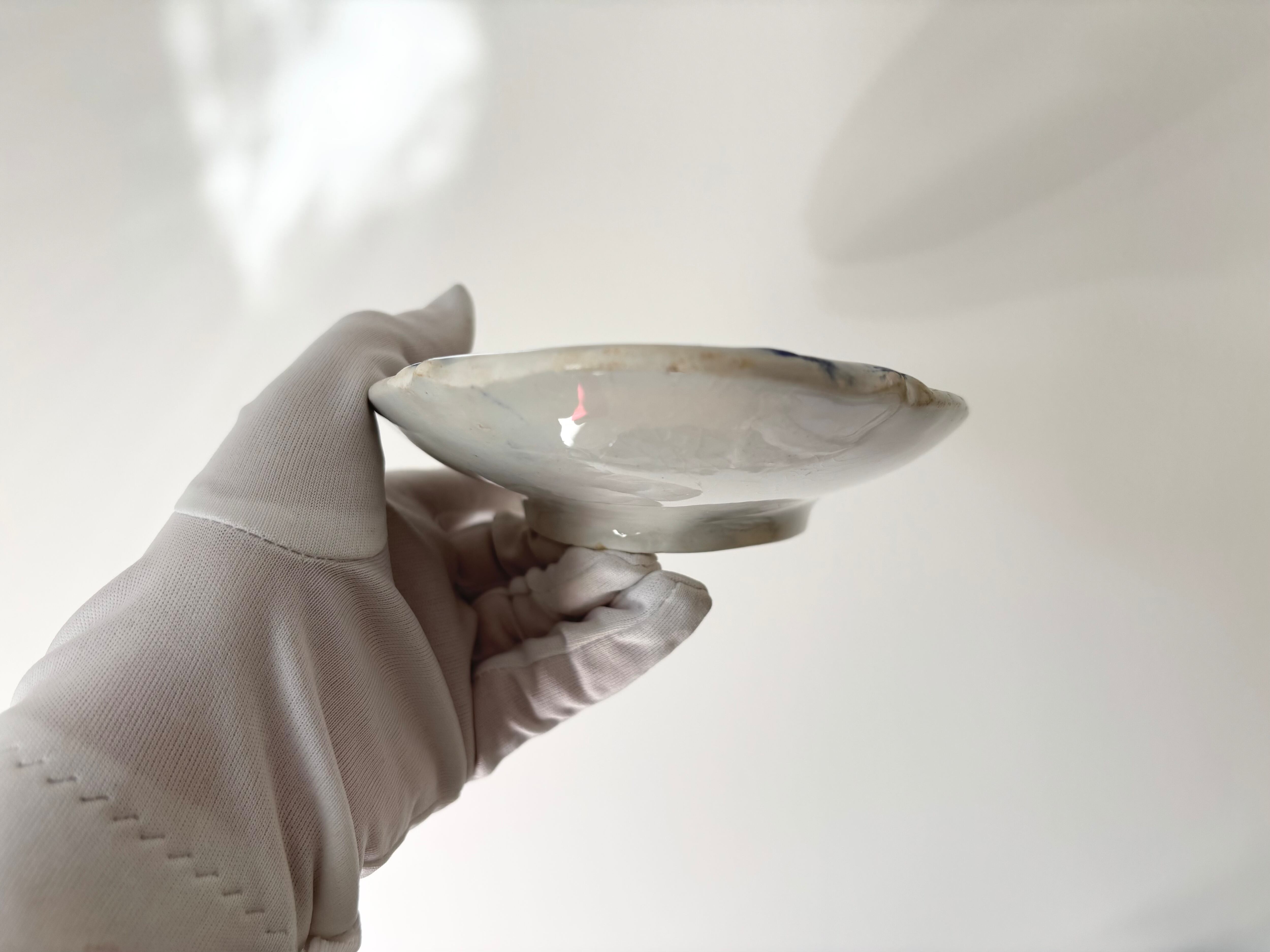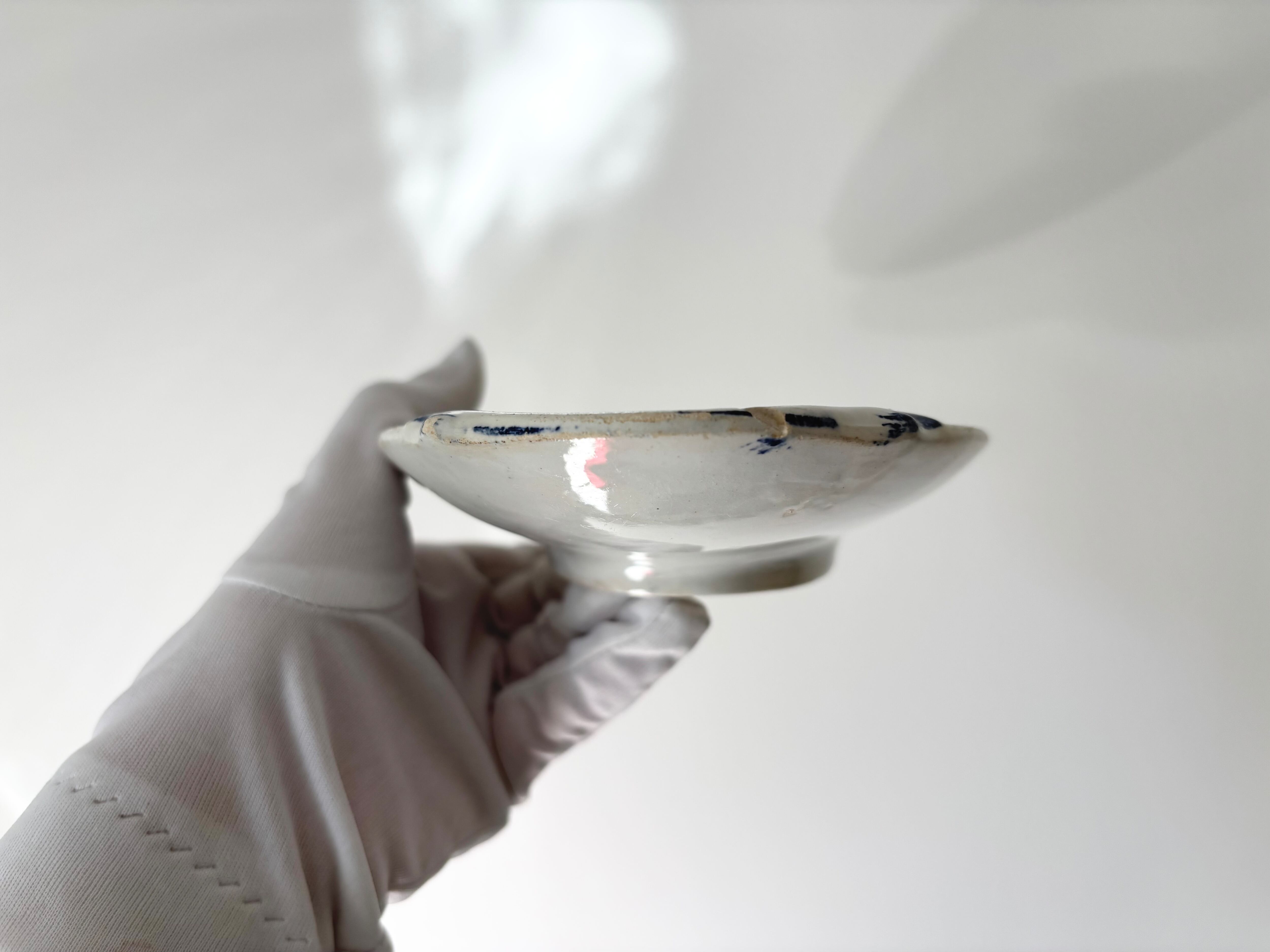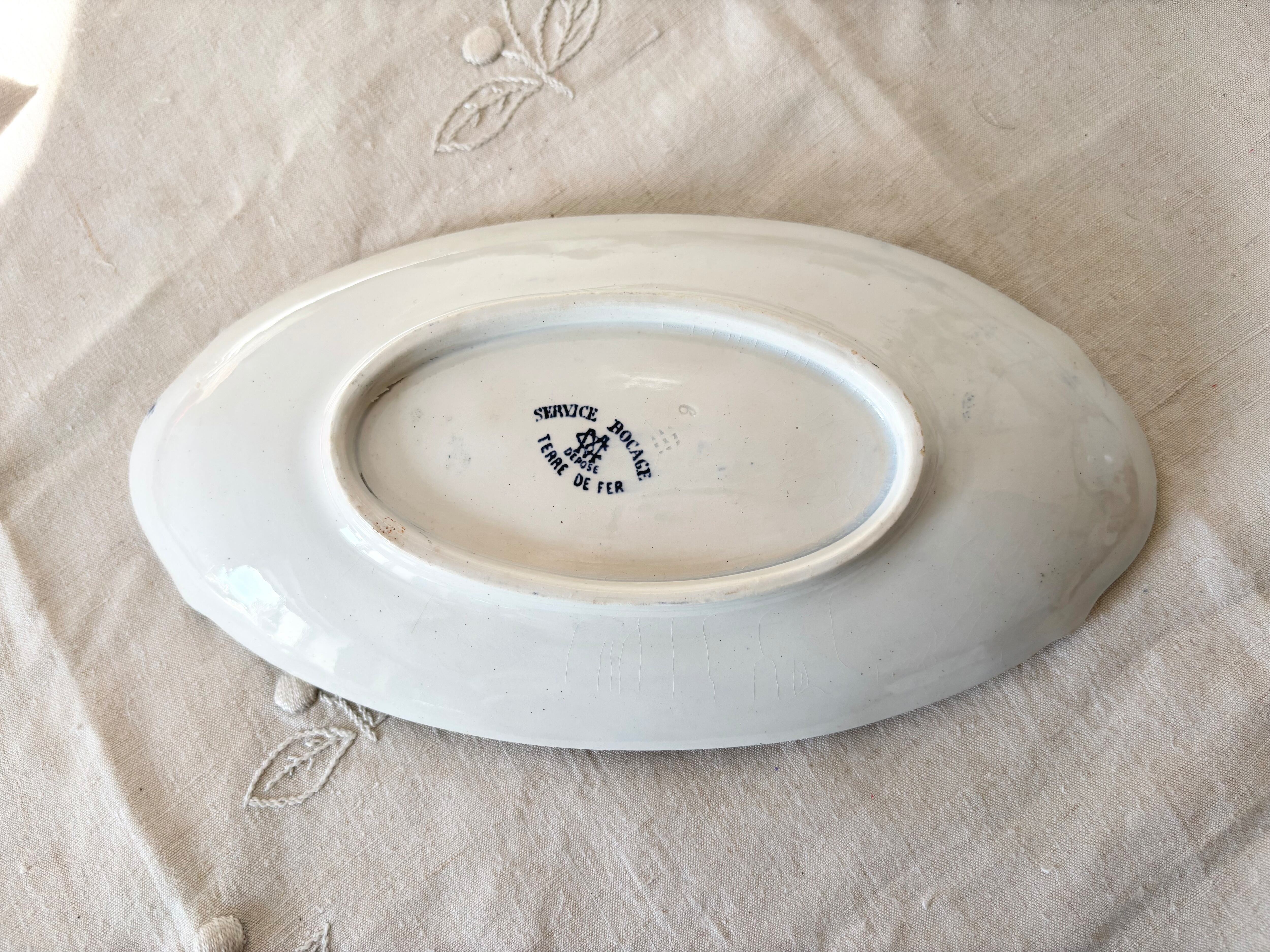 刻印より1884 - 1920年代に製作されたと判別できるこのアイテムは、生成りの白に、明るい藍色で、Bocage(田園風景)に戯れる、沢山の可愛い小鳥達が描かれています。