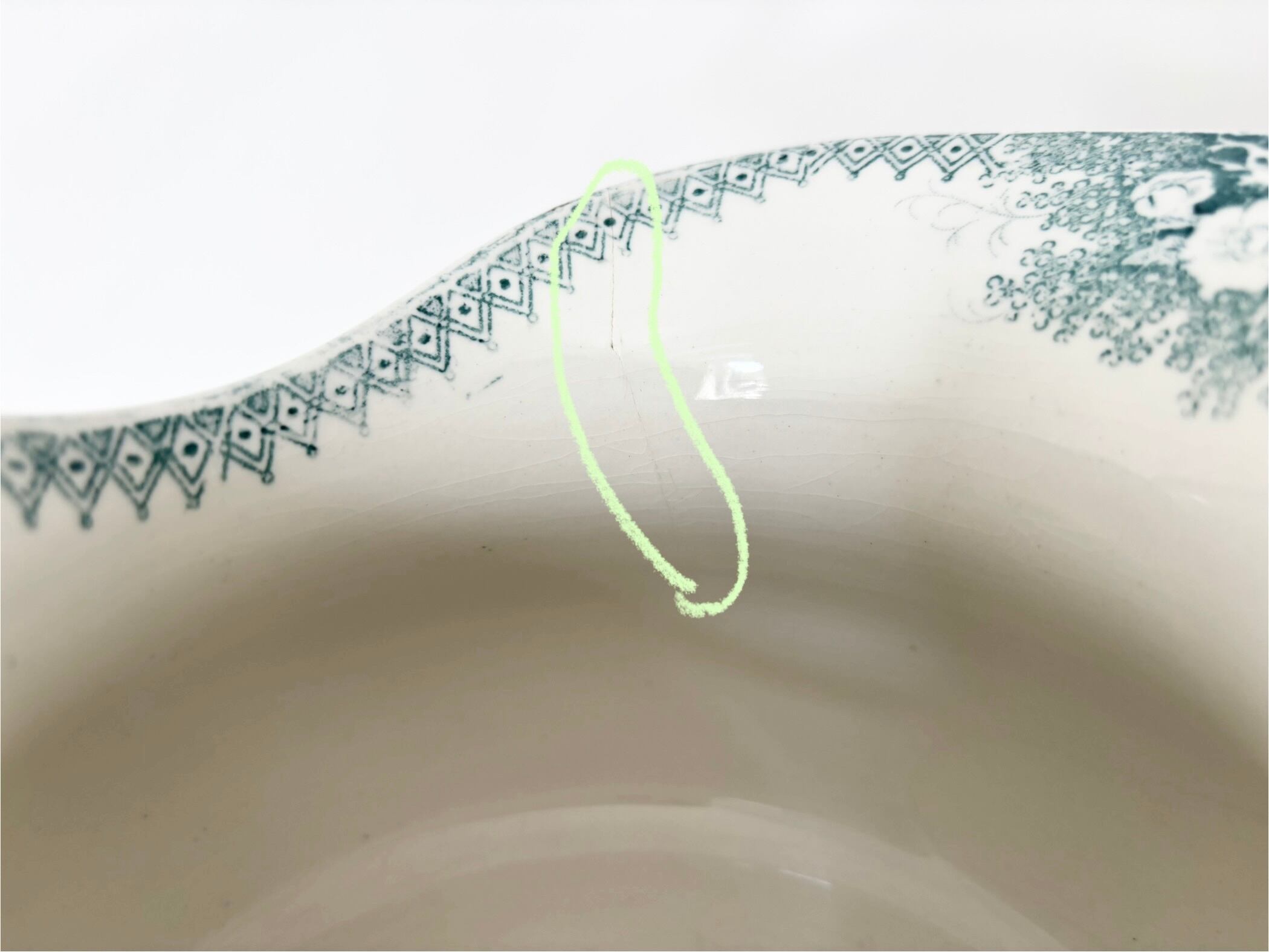 • 注ぎ口部分:外側から内側にかけて貫通しているヘアライン(ひび)が1か所あります。
