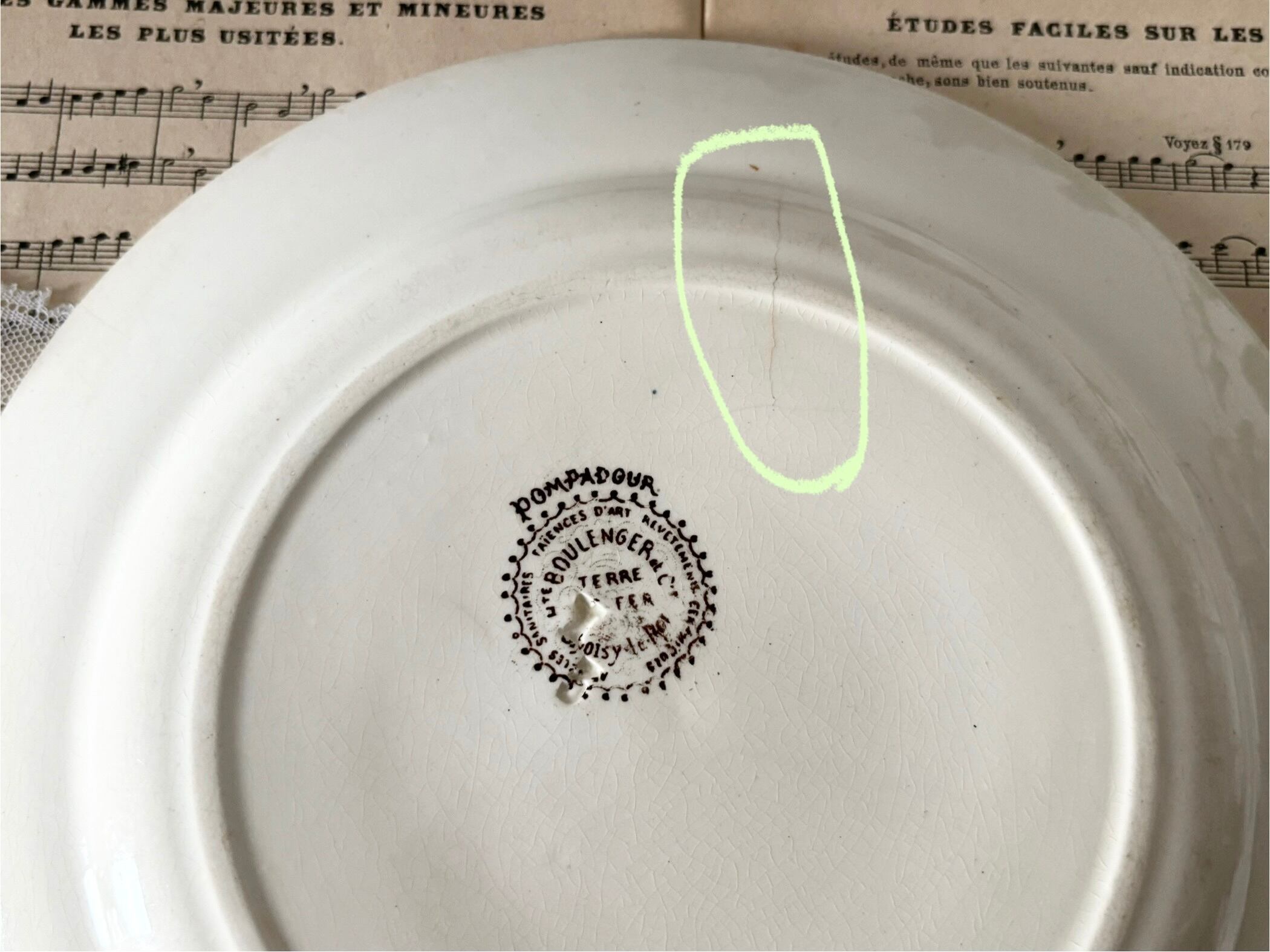 裏面には焼成時の支柱跡や凹凸があります。バックスタンプ「H. BOULENGER & CIE / CHOISY-LE-ROI / TERRE DE FER / POMPADOUR」ははっきりと残っています。