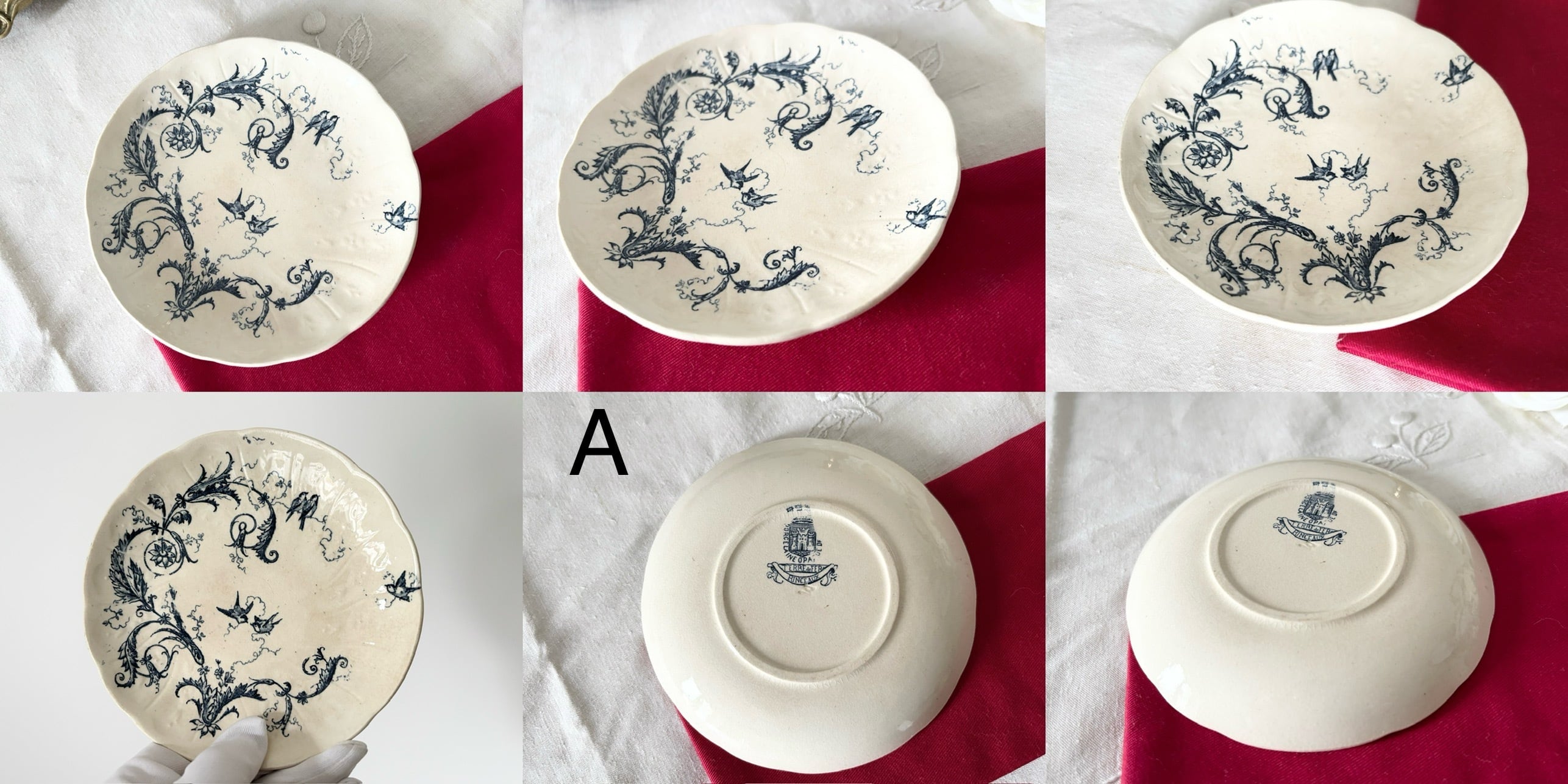 繊細なコバルトブルーの草花模様と、飛翔する小鳥たちの優美なデザインが印象的な逸品です。