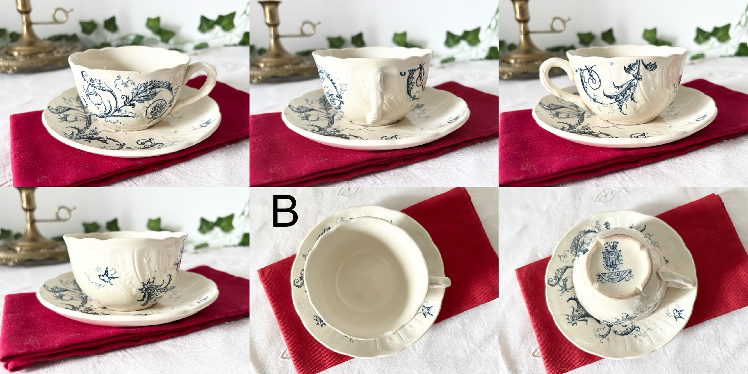 AB / 2個セット / GIEN / Terre de fer / Rinceaux / 19世紀 / 鳥 / 青 / カップ&ソーサー / フランス / アンティーク