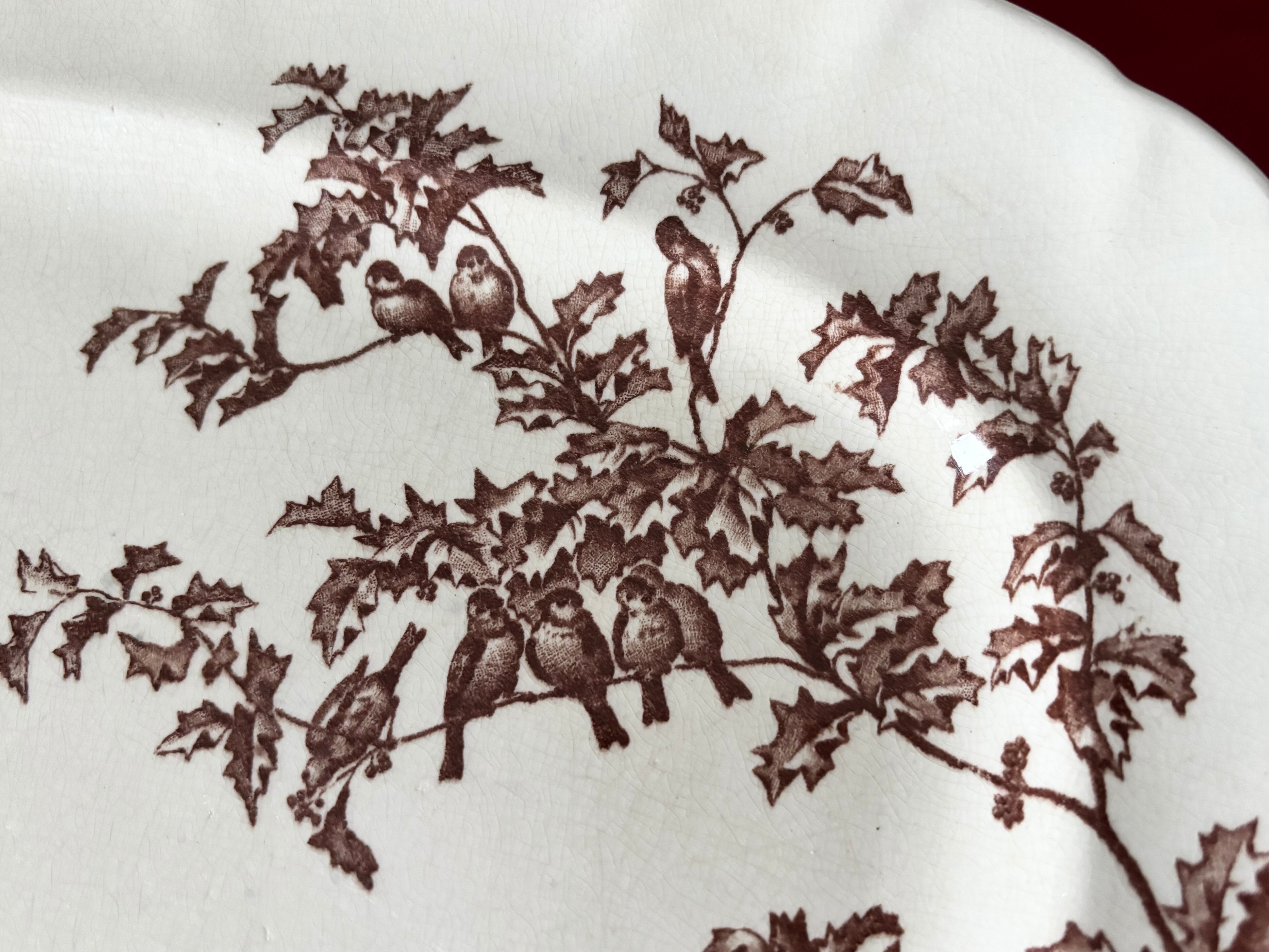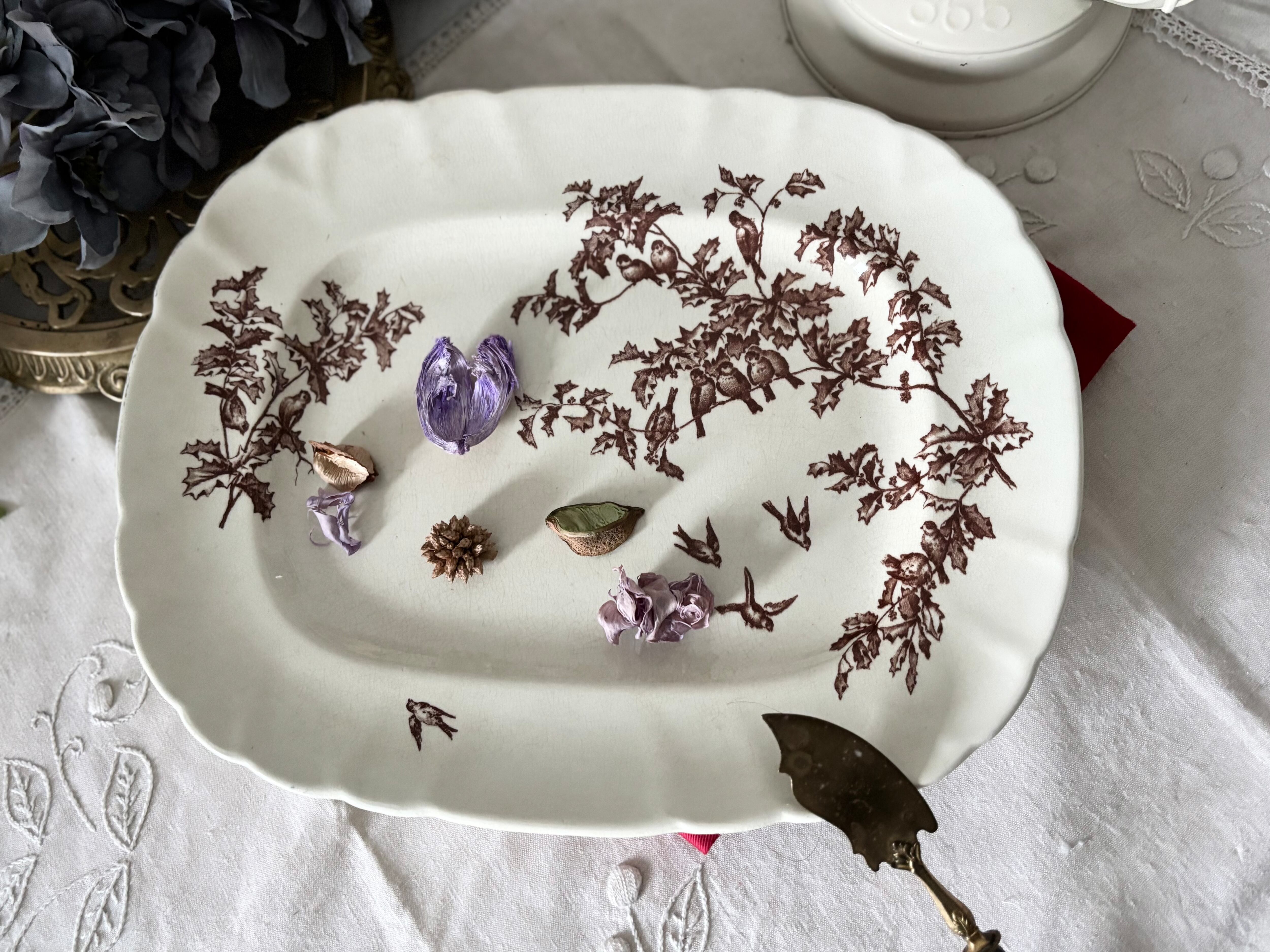 アイボリーがかった陶肌に、褐色(セピアブラウン)の小鳥達と木の枝の図柄が美しく描かれた、ナチュラルでクラシカルな雰囲気の一枚。