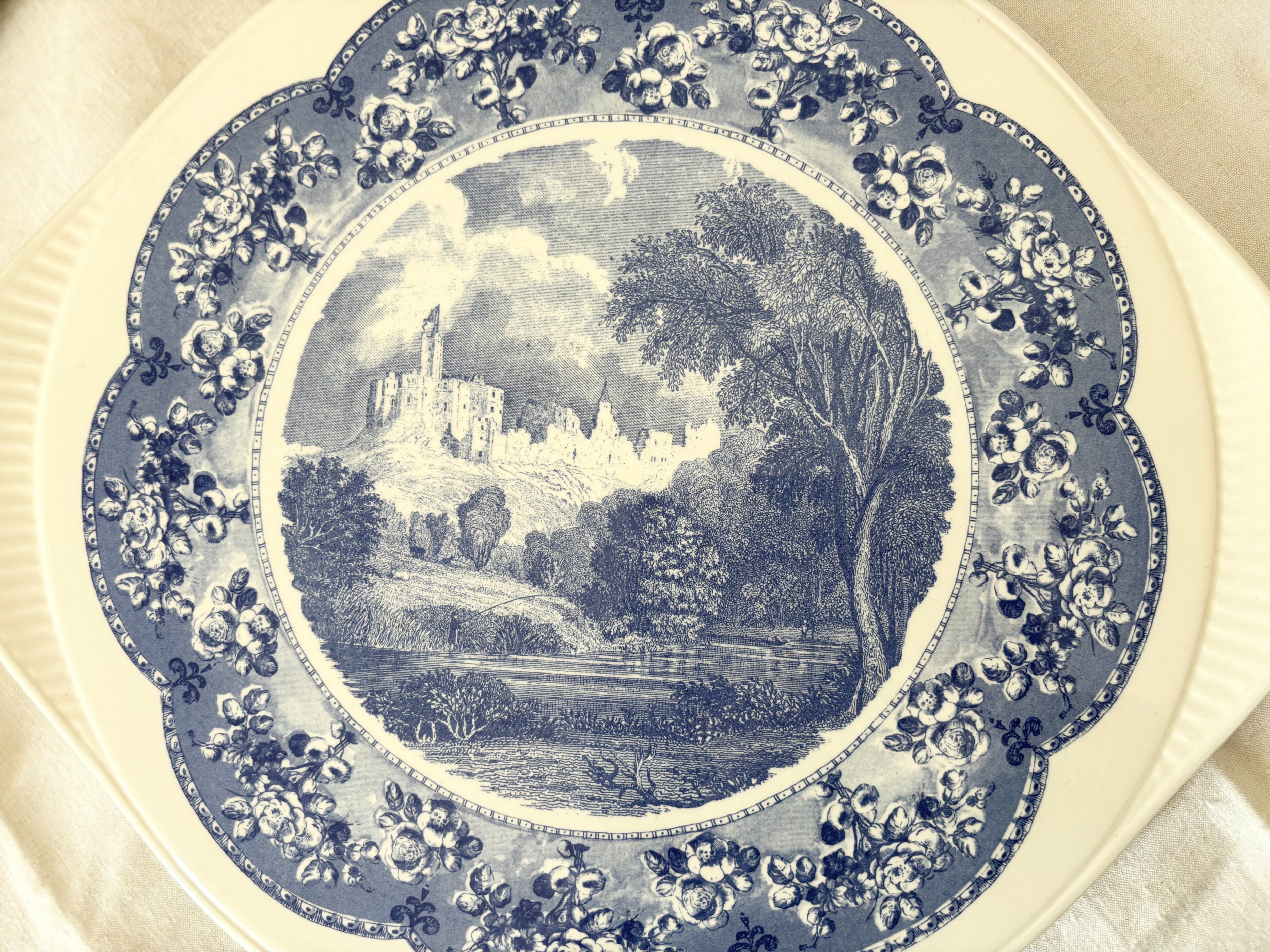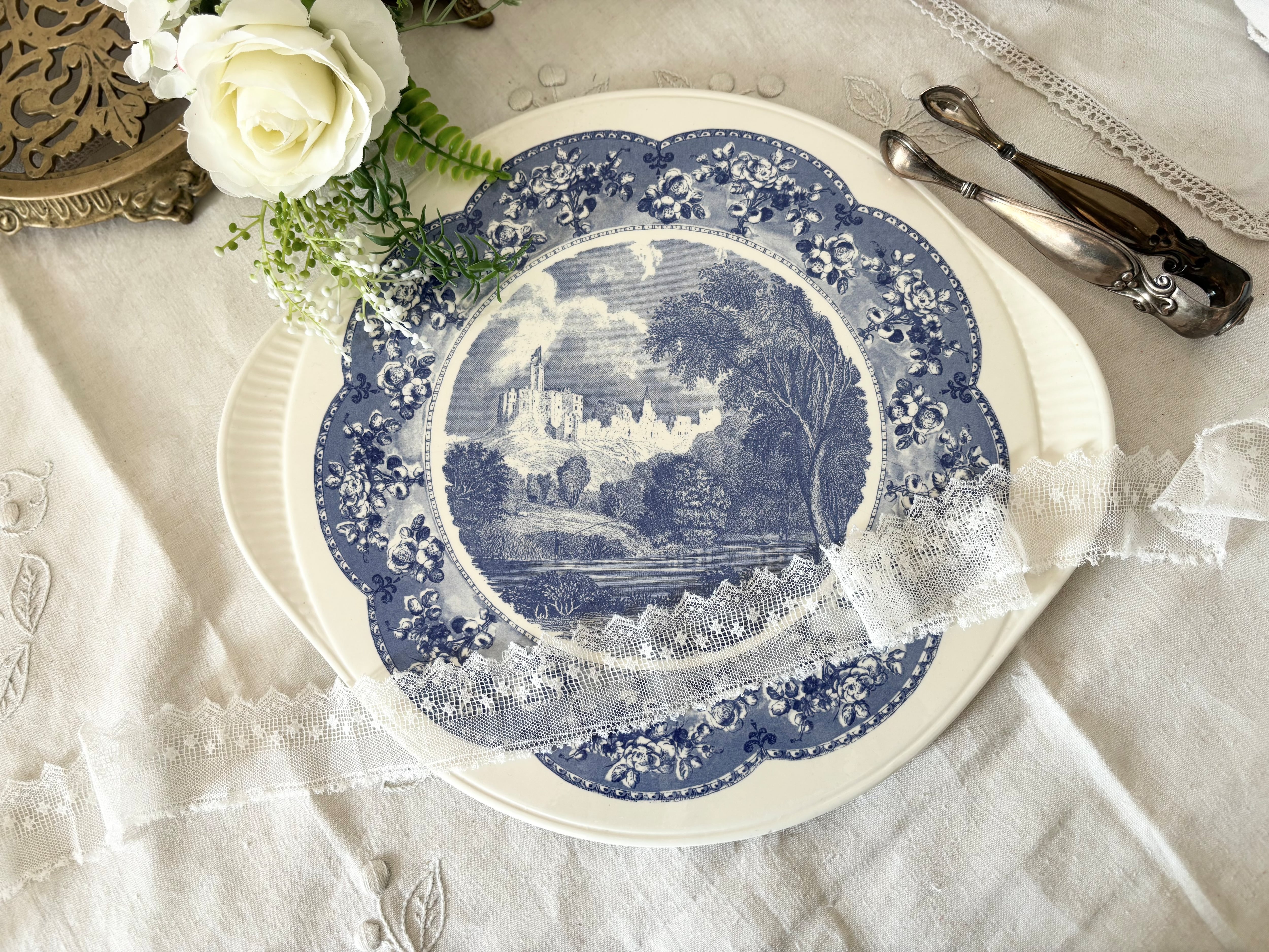 美品: アンティーク ブルー&ホワイト トリベット / 薔薇と城の風景 / 英国 アンティーク