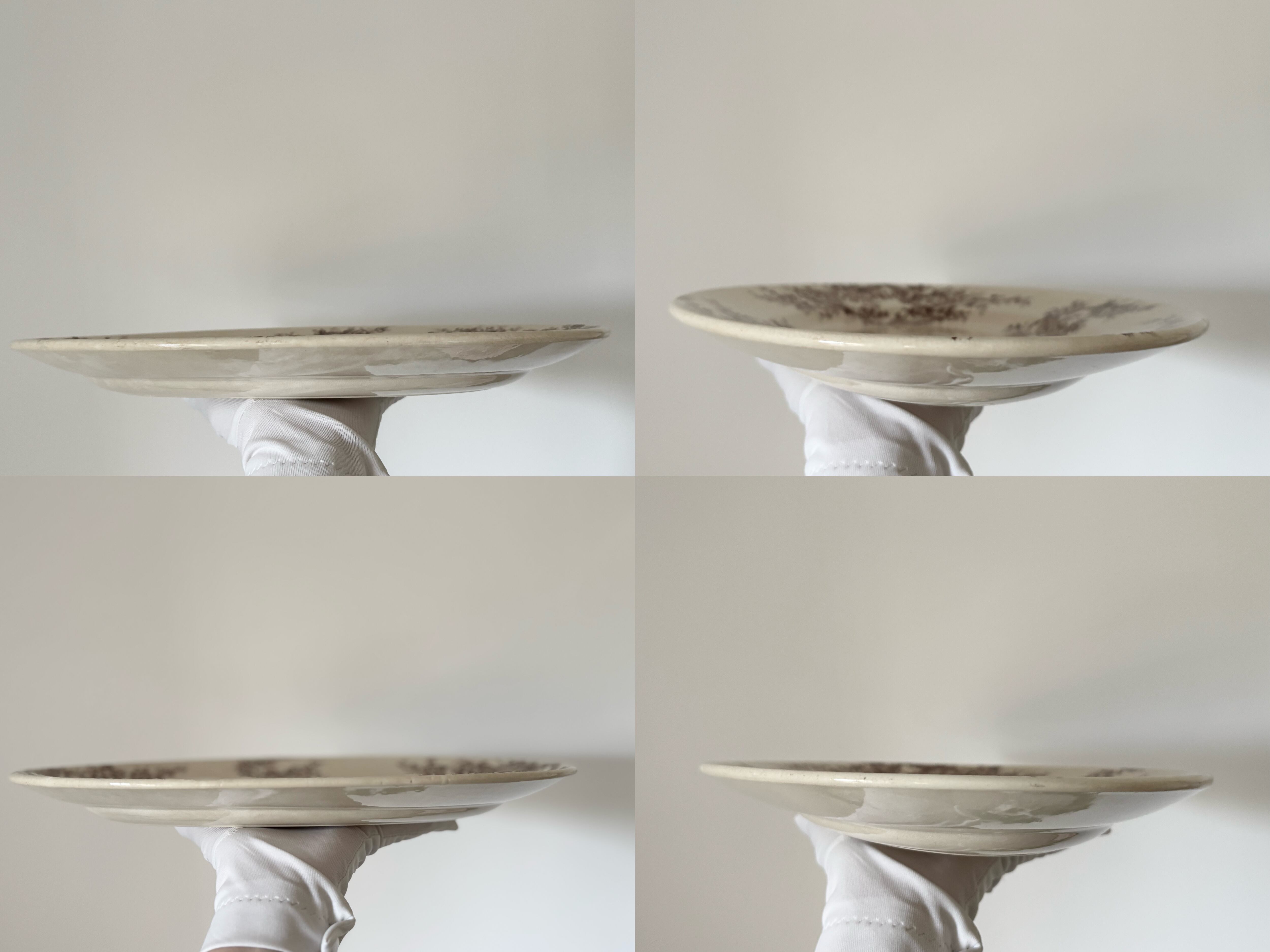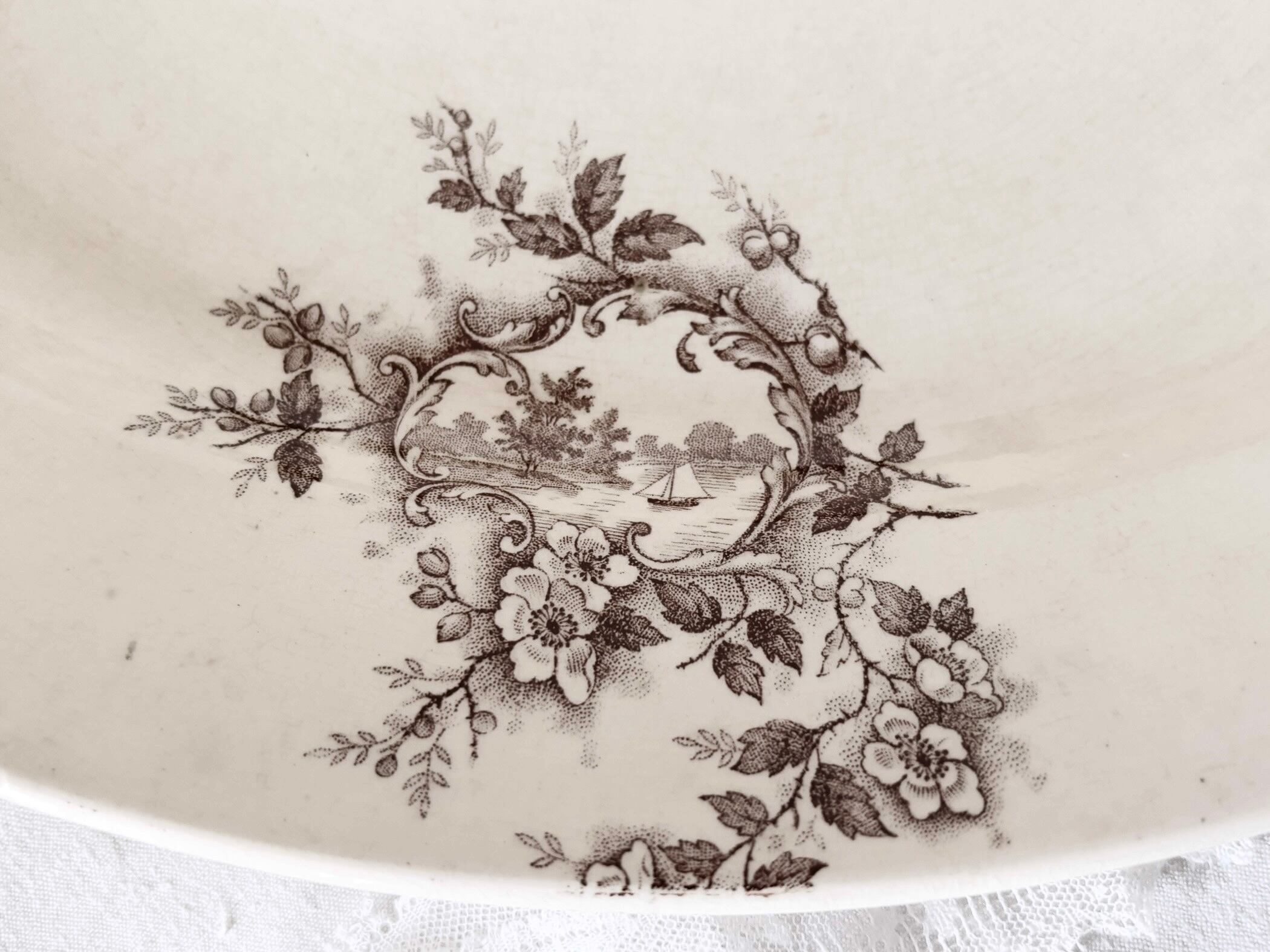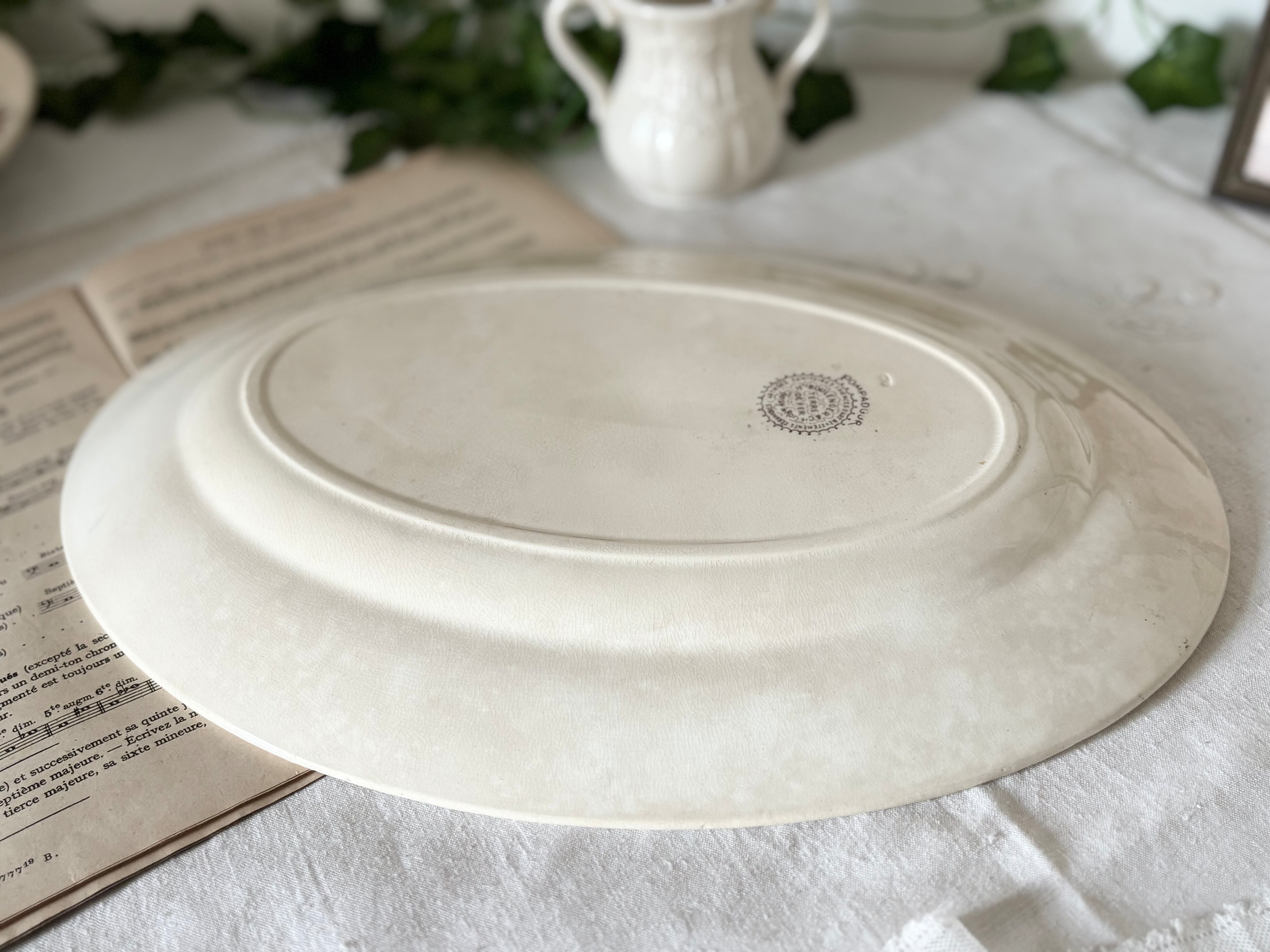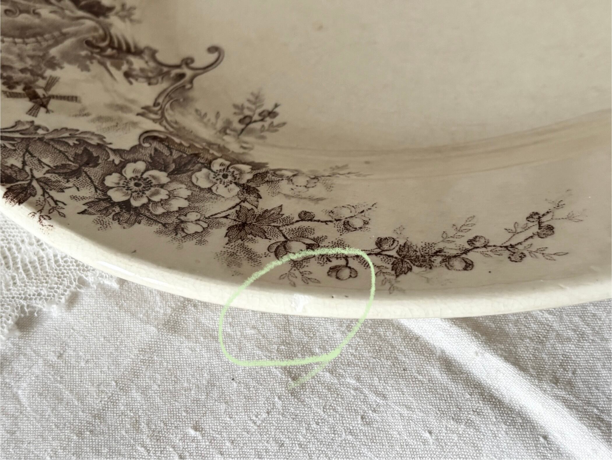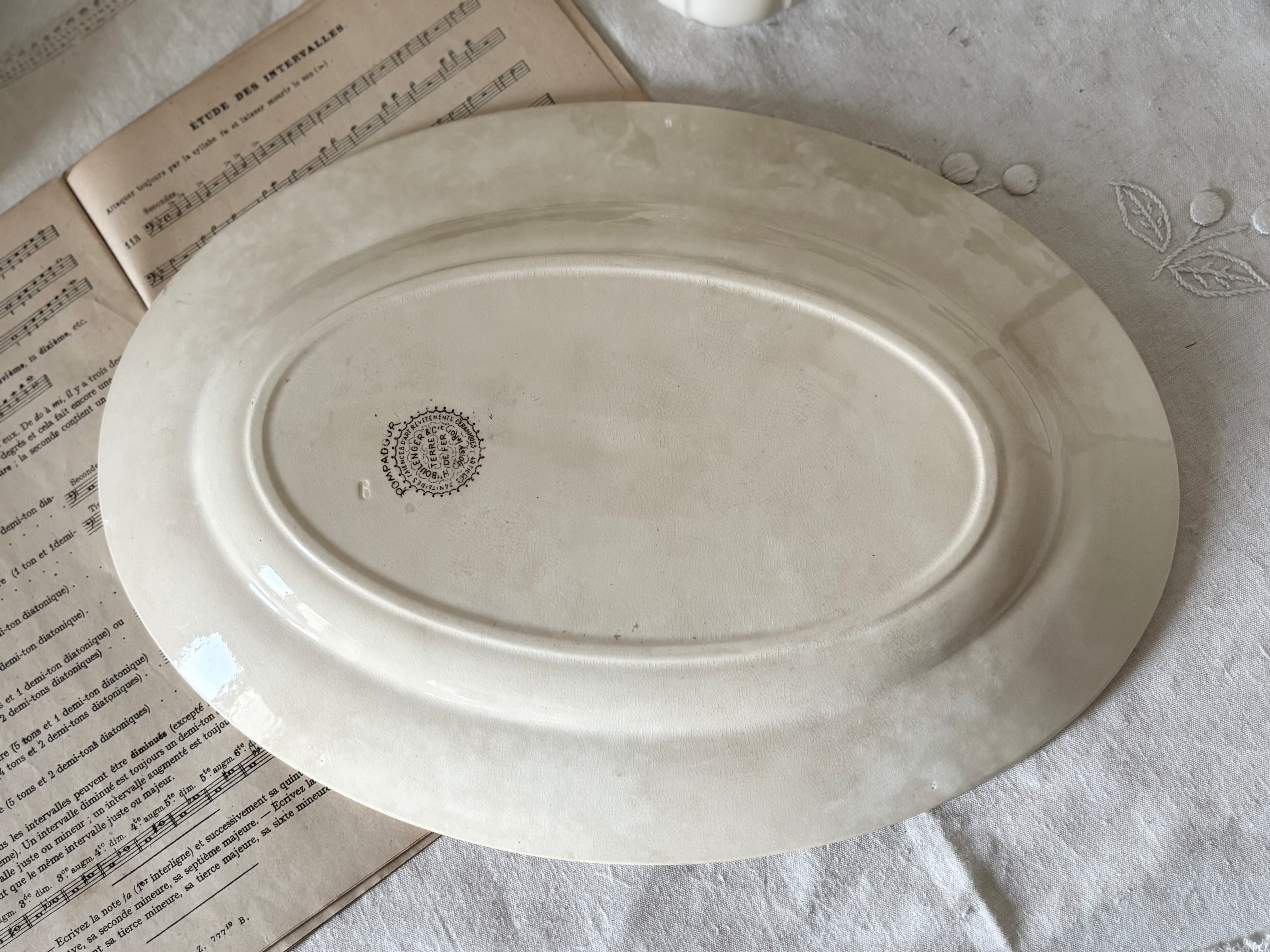36cm オーバルプレート / H Boulenger &Cie , Choisy- le-roi / Terre de fer / Pompadour / 帆船 風車 / France / Antique / vintage / ショワジールロワ / ブラウン/ フランス/ アンティーク