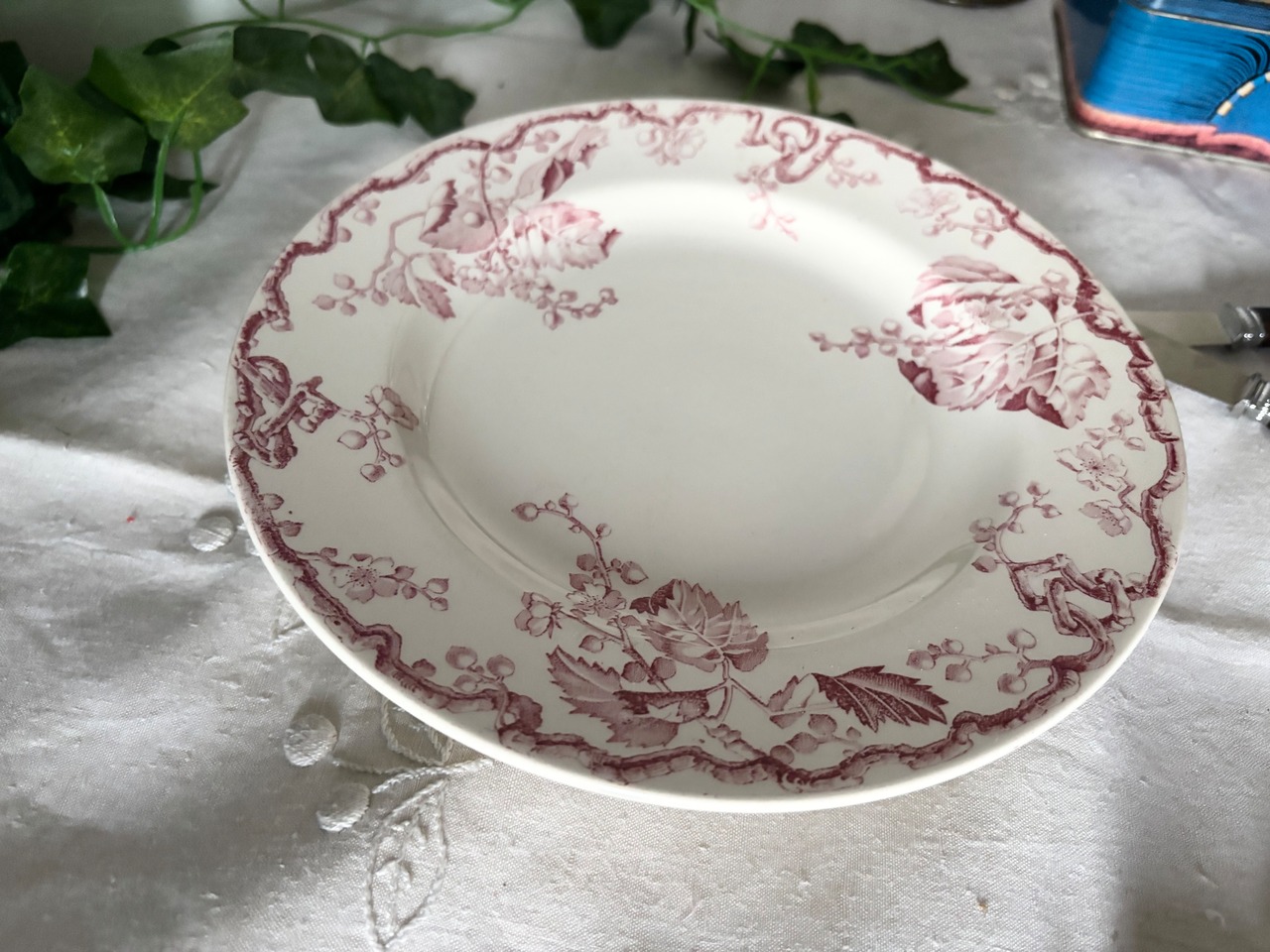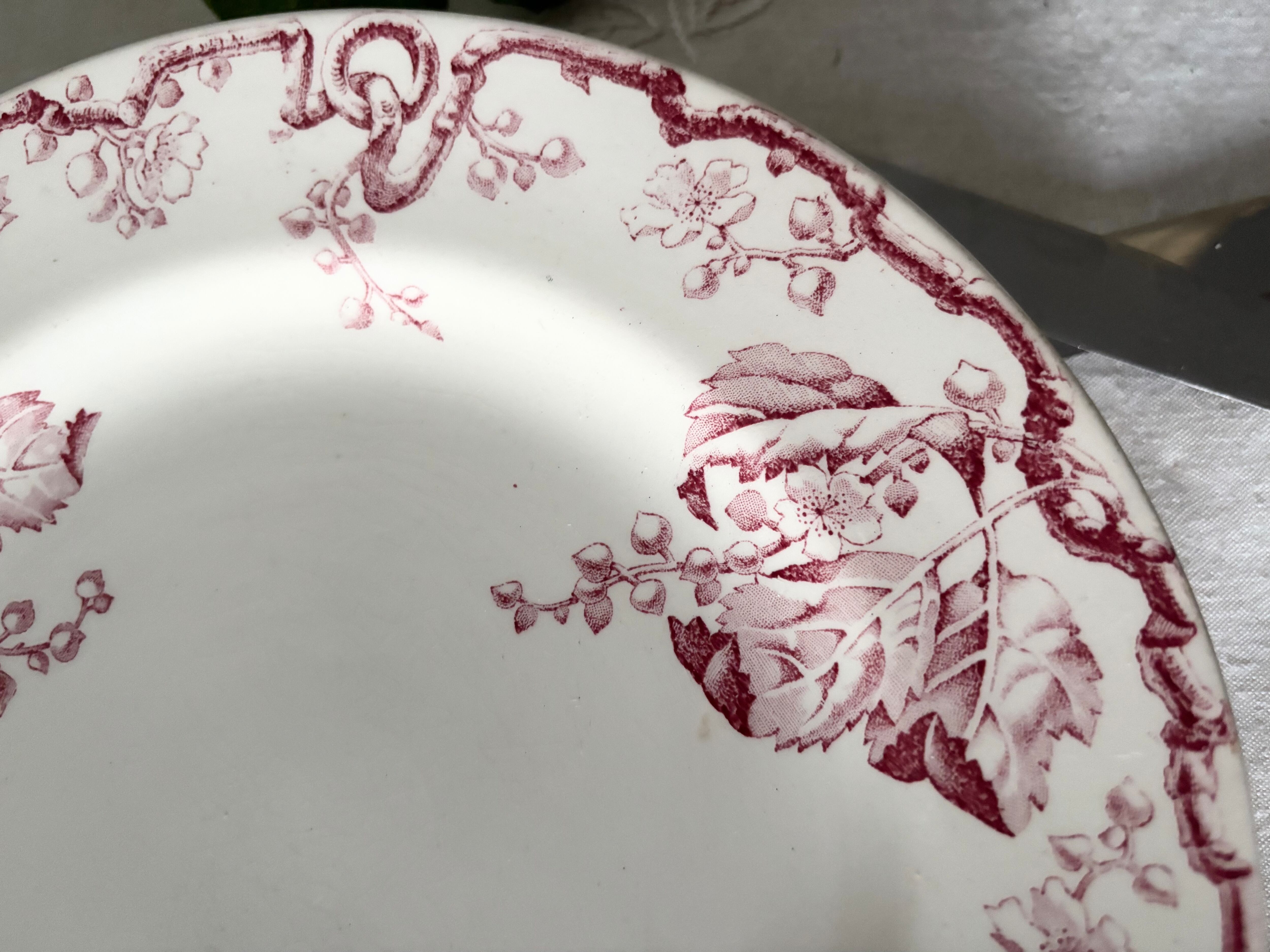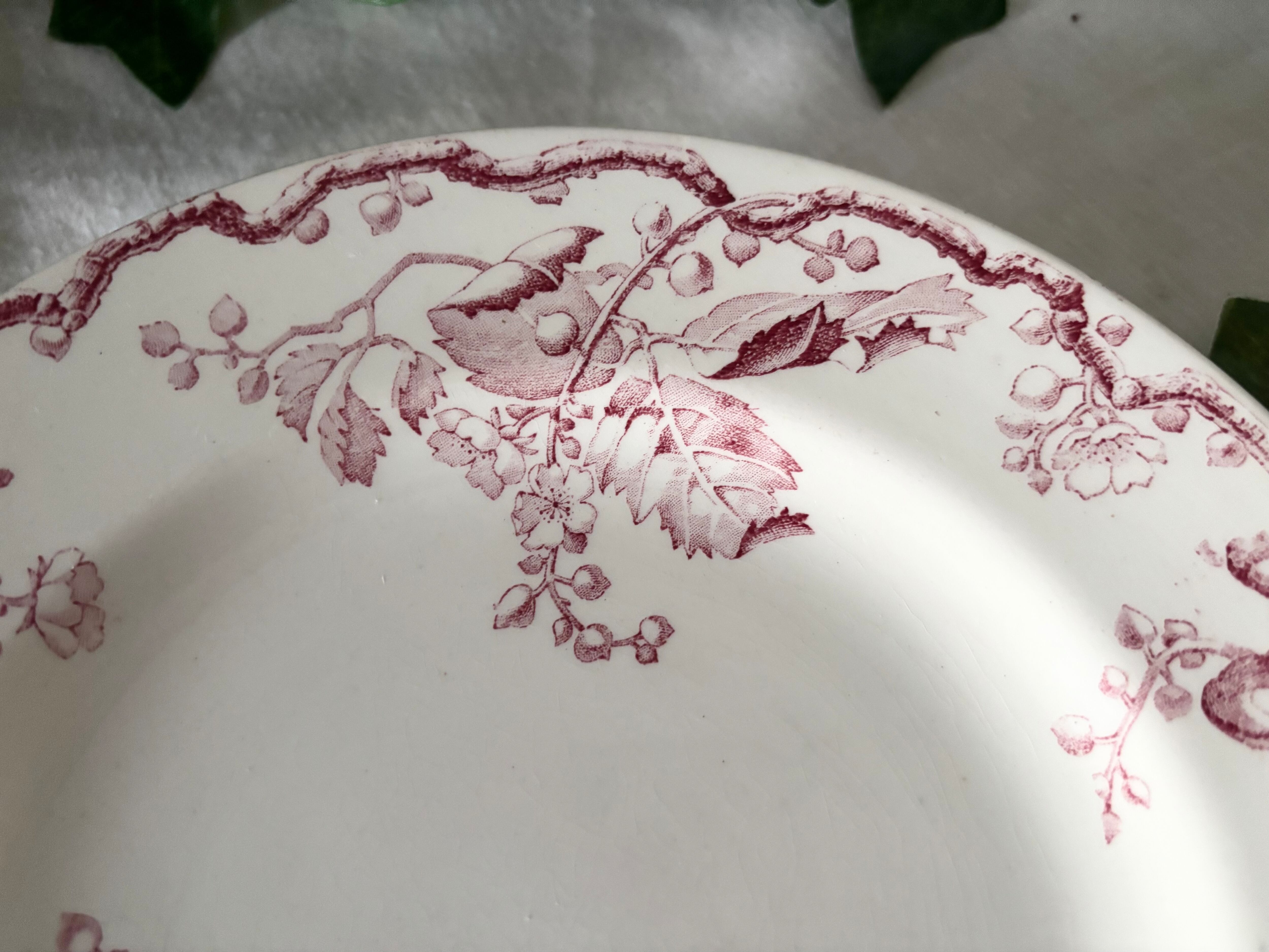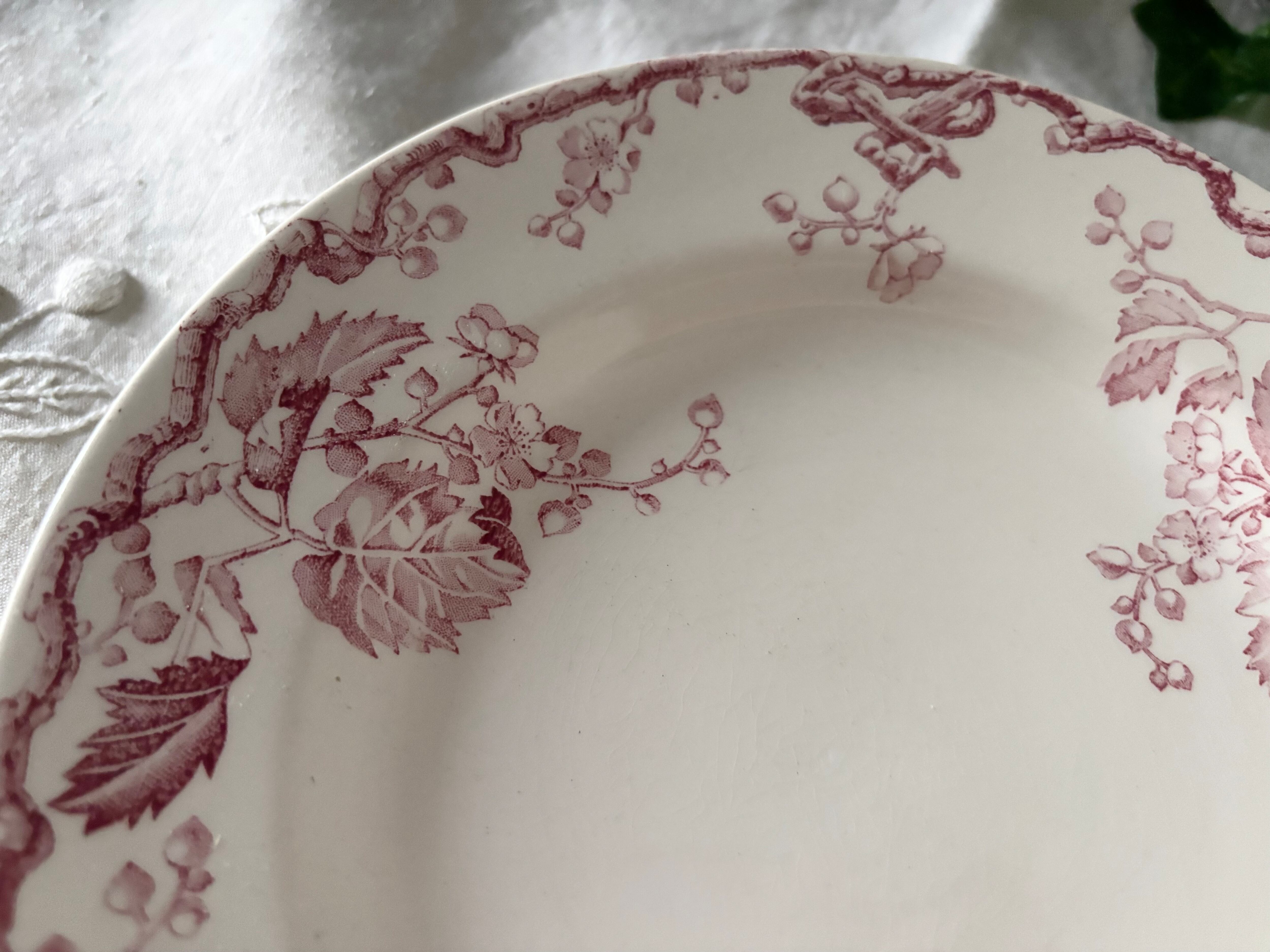 瑞々しい木の枝や葉が繊細に描かれたボルドー色の装飾は、100年以上の時を経てもなお凛とした存在感を放ち、テーブルに置くだけでアンティーク特有の深い雰囲気を添えてくれます。