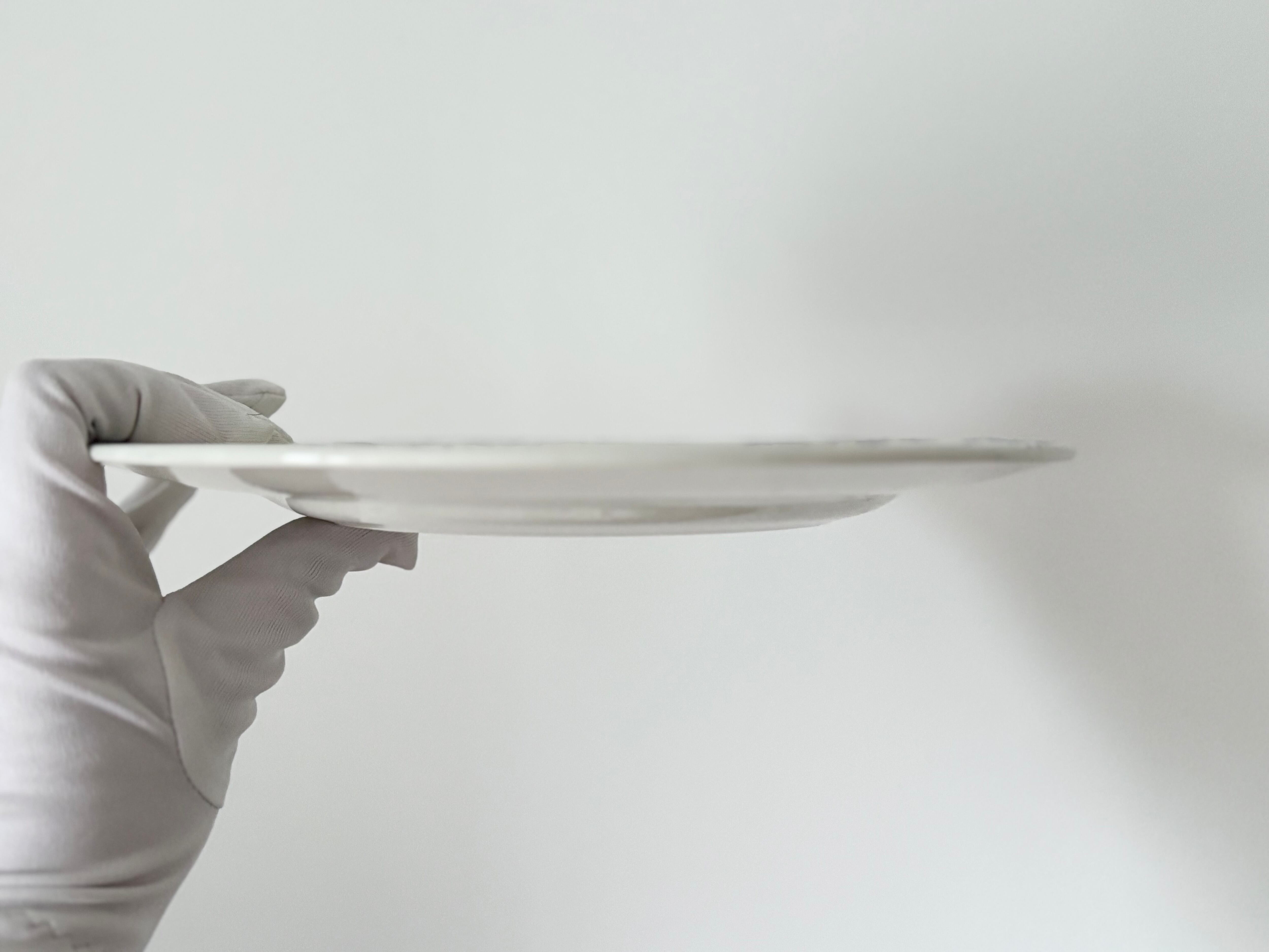 表面には、光の角度によって分かる程度のごくわずかなカトラリー跡が見られます。また、制作時に生じたと思われる微細な気泡状の点が、プレートの一角に確認できます。