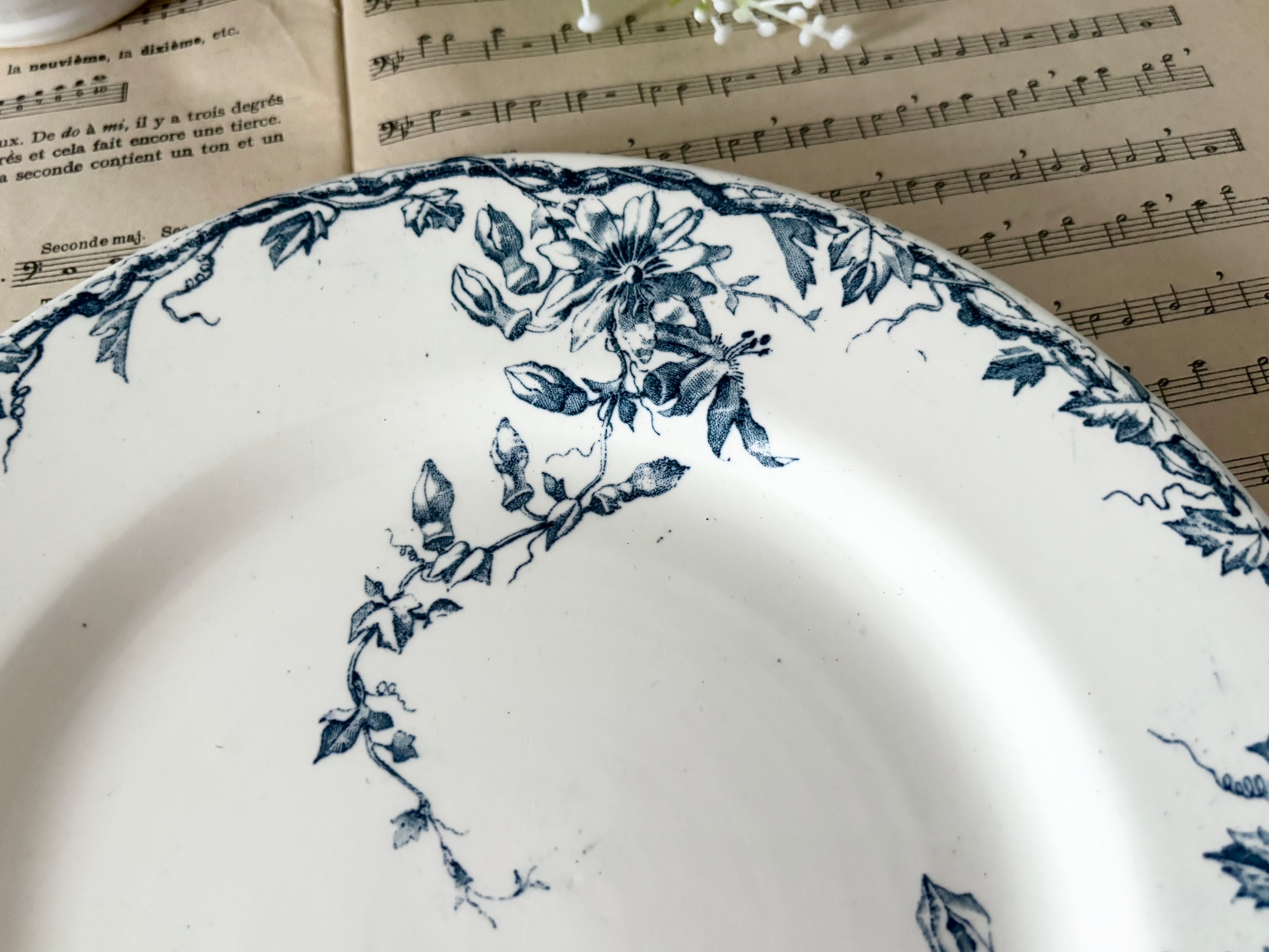 転写による絵柄には、アンティーク特有の軽いかすれや途切れ、わずかなにじみがございますが、モチーフ全体ははっきりと残っており、印象を損なうものではありません。