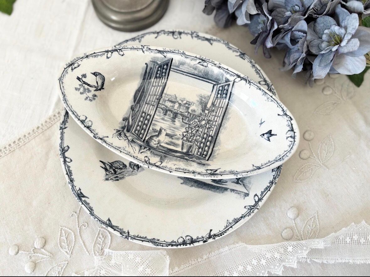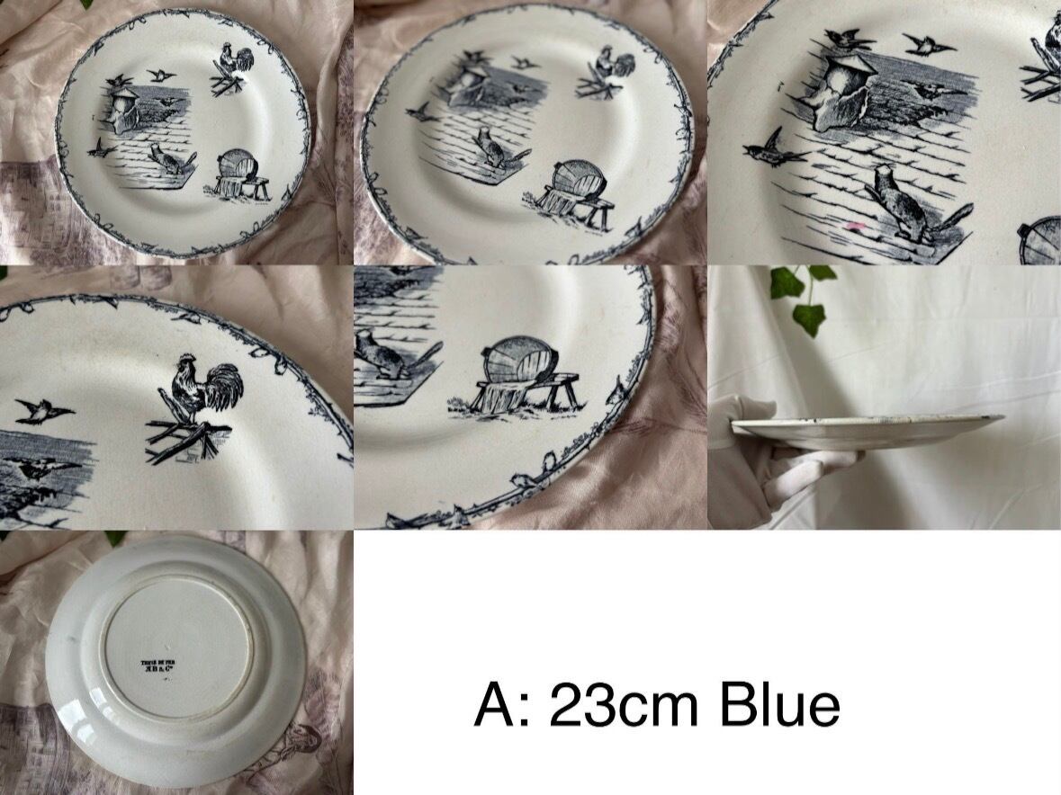 5:Antique French Transferware Plate HB & Cie Choisy le Roi, Cat Bird Farm Scene, Rustic Country Decor, Terre de Fer Picture Plate
