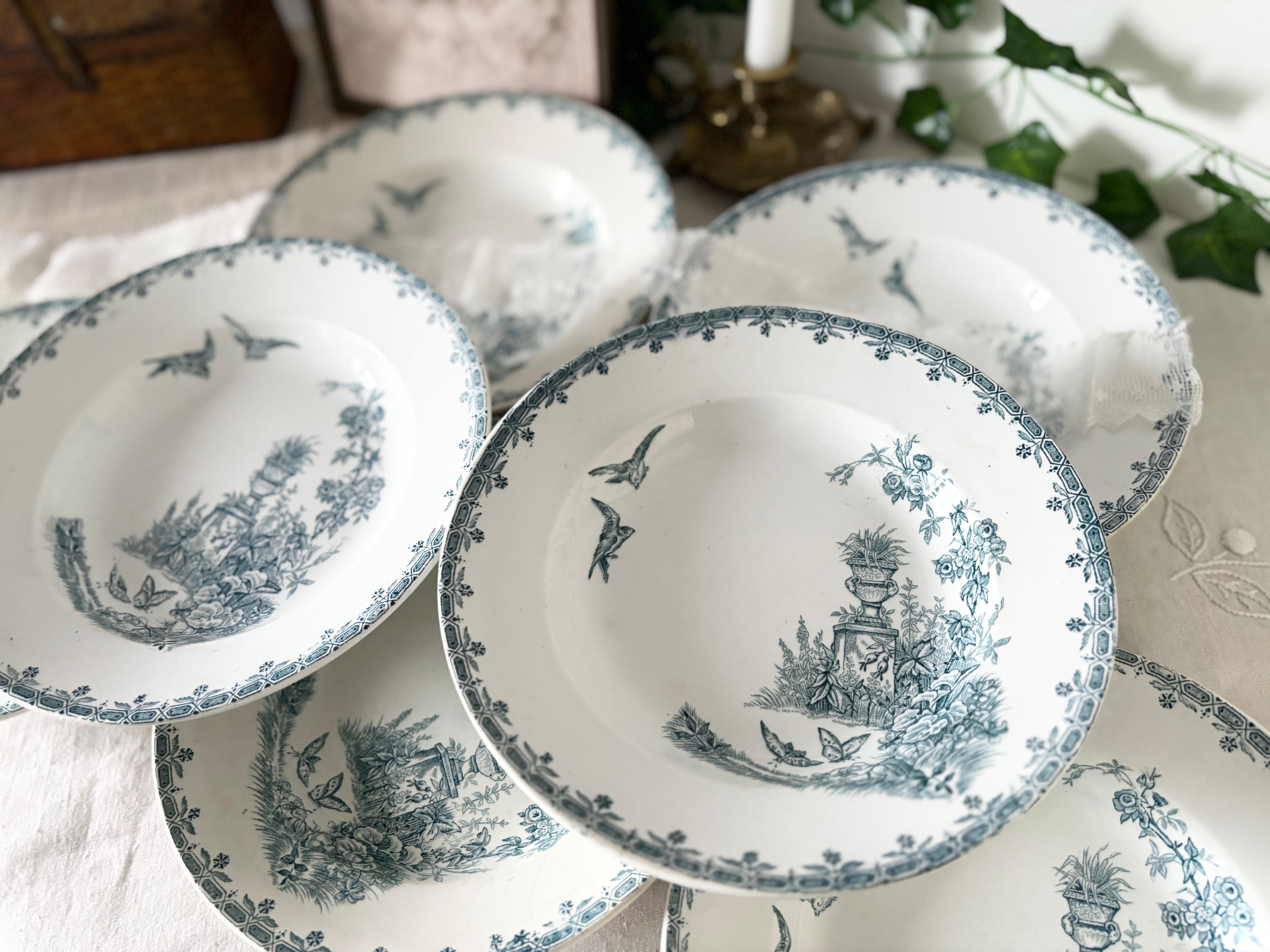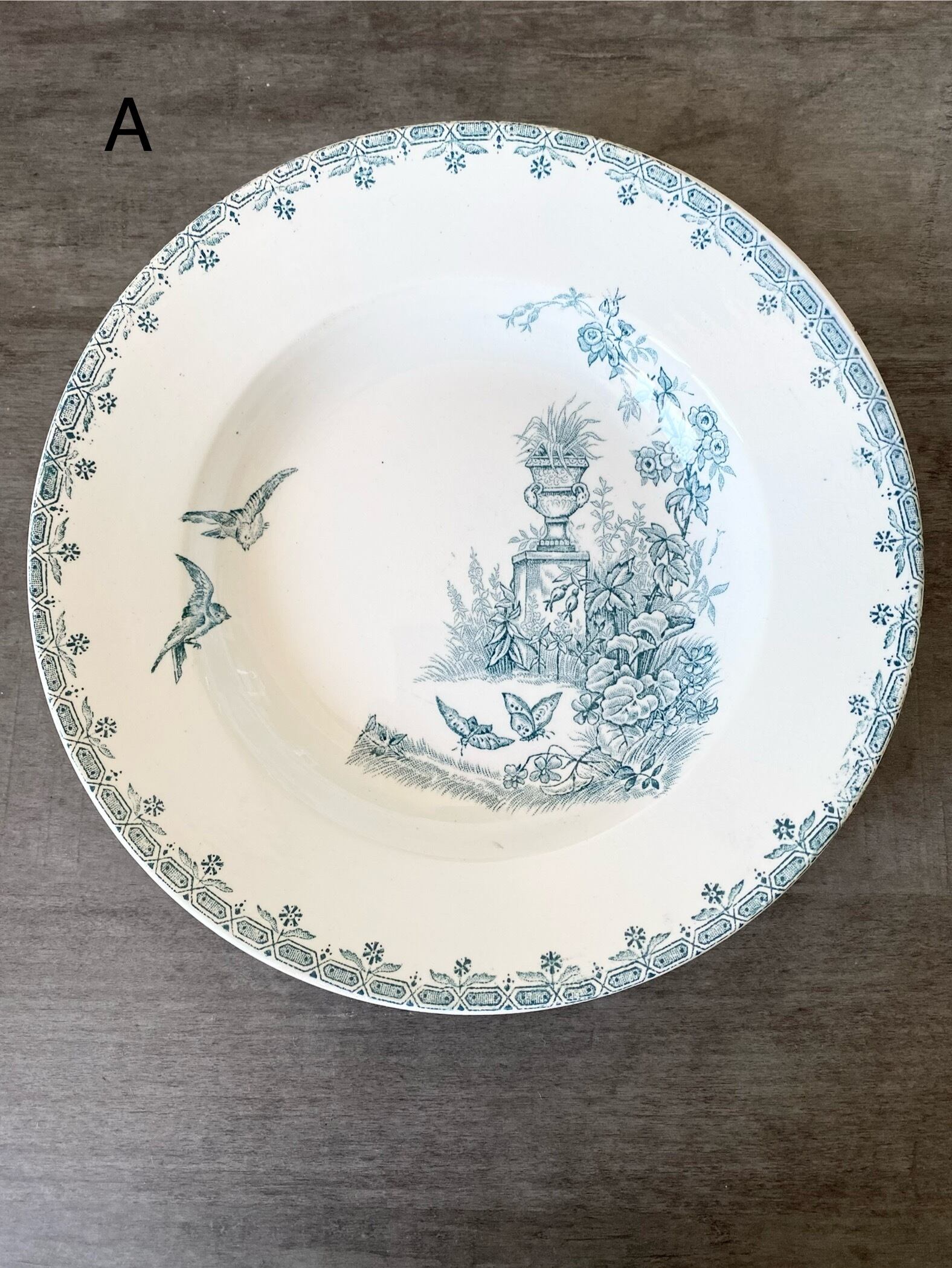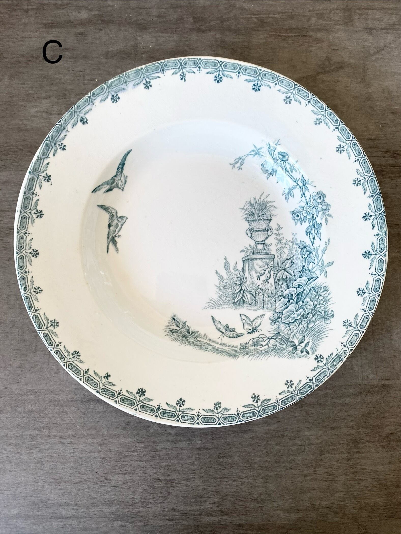 Lot 7 Terre de fer Deep plates / Rosalia / Vintage e / No back mark / France / Antique / Shabby chic / bird / テールドフェール / 刻印無し / 鳥 / フランス / アンティーク
