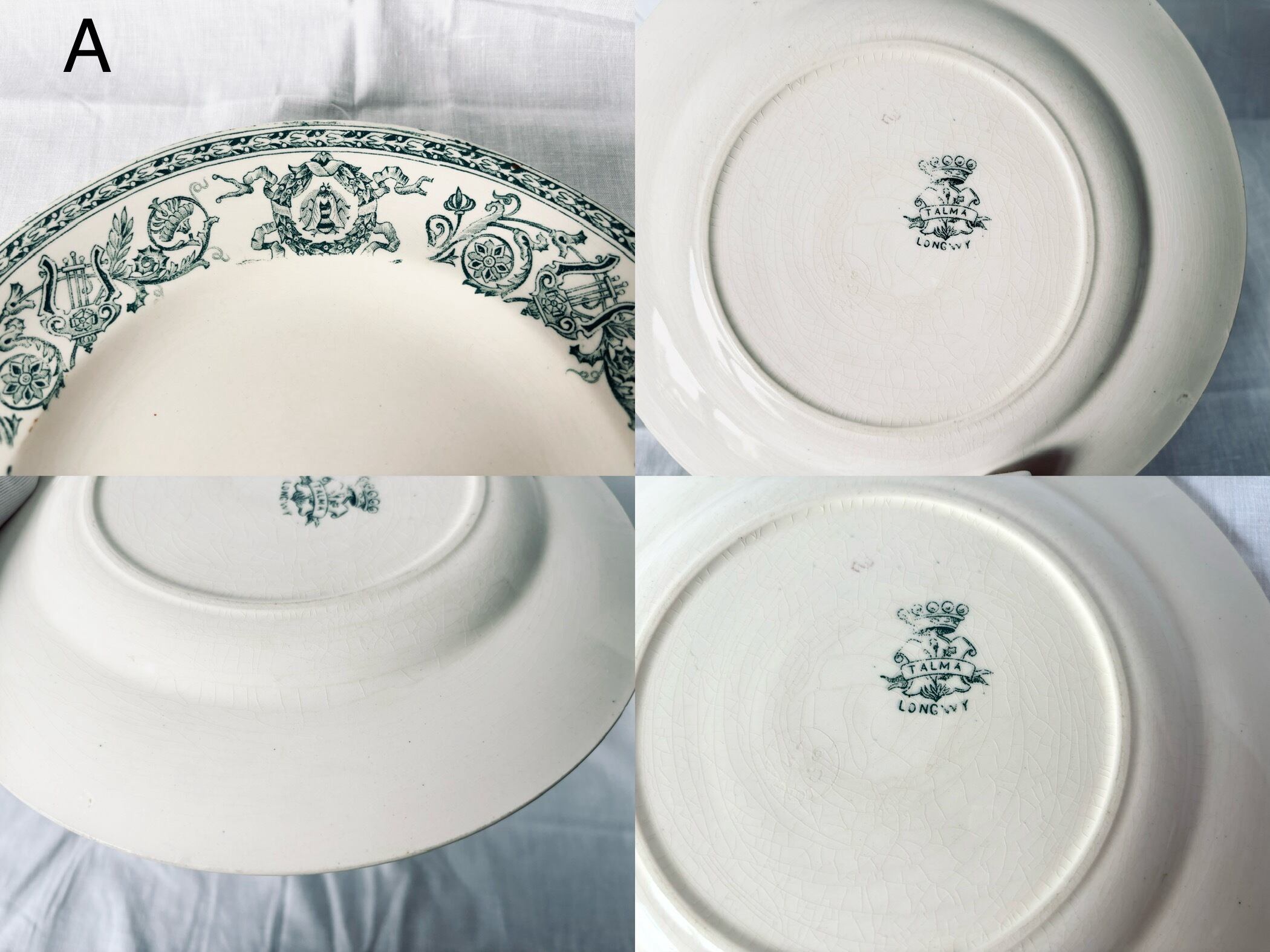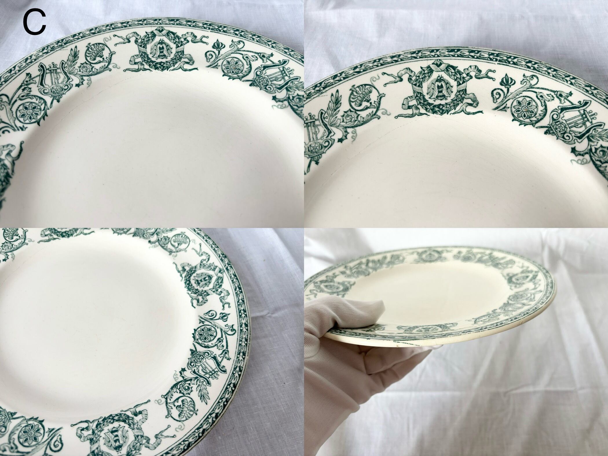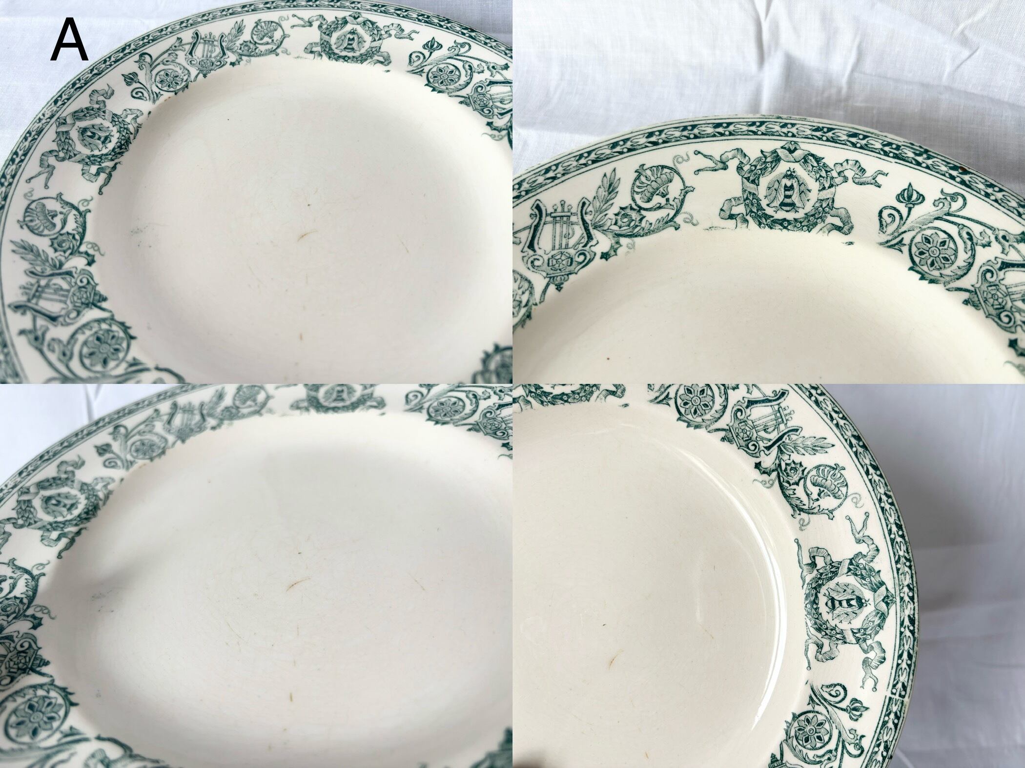 こちらの商品はどのプレートにも、経年劣化の色褪せ、小さなシミや傷がございます。これらを含めて、アンティークの味わいとしてお楽しみいただける、方向けの商品です。