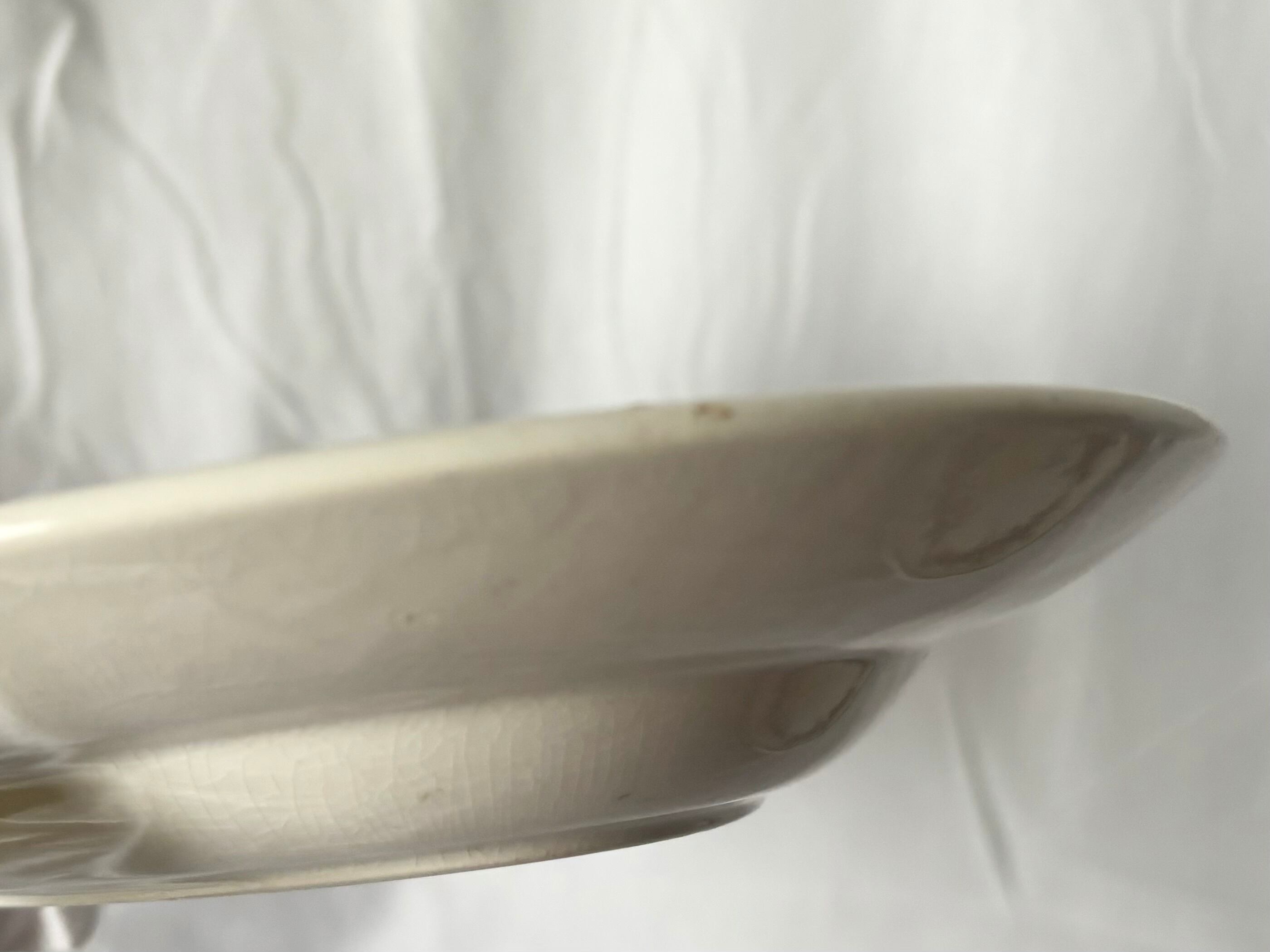 使用感としては、お皿の内側に薄いシミが広がり、絵柄が掠れている部分もあります。横から見ると点々とお皿の縁に小さな傷があります。裏側には刻印があり、特に片側が薄いシミに覆われています。お皿の縁に点々と茶色い傷があります。お皿全体にクレイジングが広がっています。