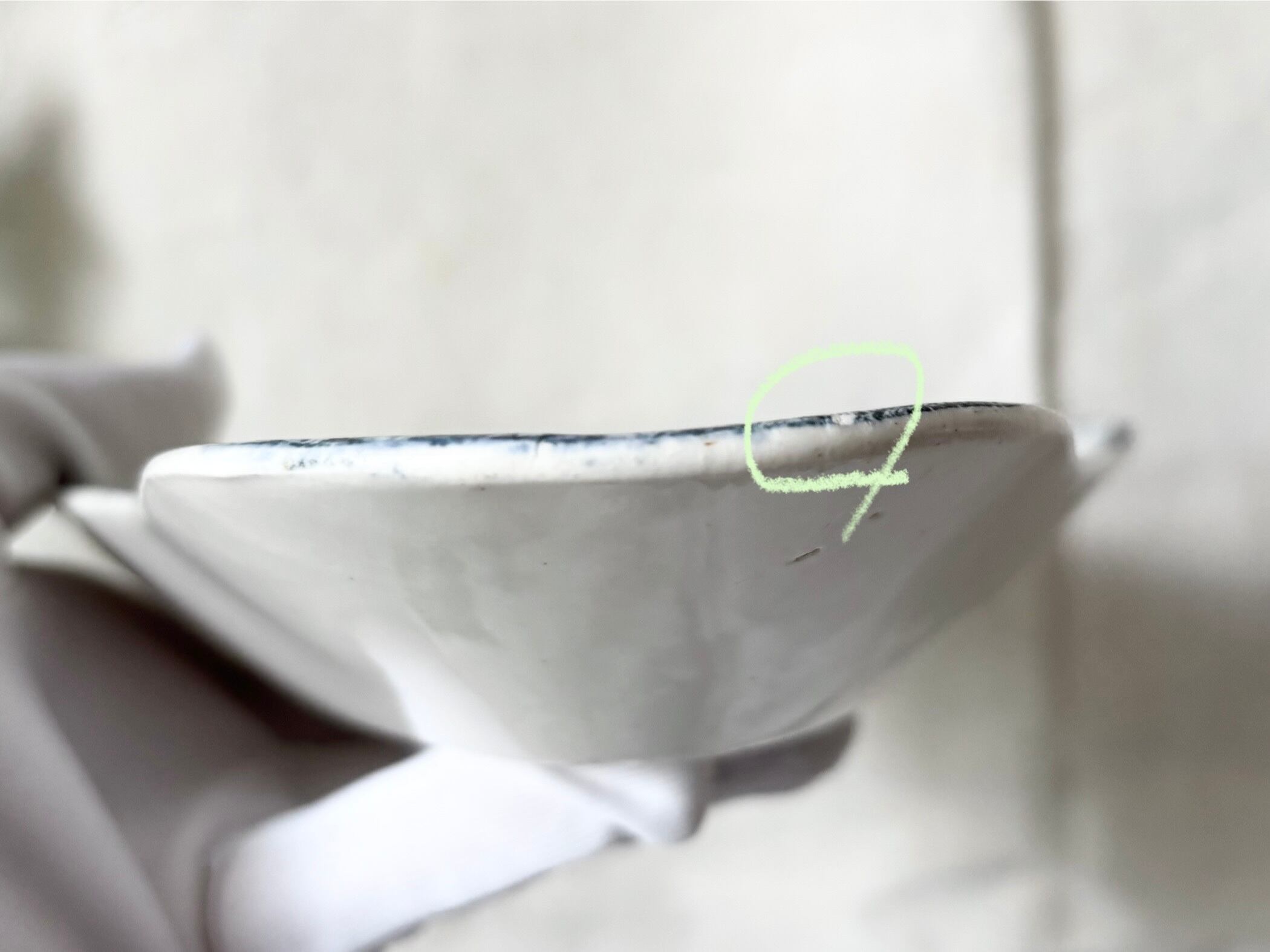 アイテムのコンディションとしては、部分的に貫入があり、器の内側、鳥の側にシミが一箇所あり、若干のカトラリー跡と小傷、僅かな色飛びと鳥の反対側の側面に、点々と突起がございます。リムの端に極小さな傷が一箇所あります。絵柄が掠れている部分があります。また、裏側にも小傷がいくつかあり、刻印が少しぼやけていますが、大変艶があり、アンティークとしてとても良い状態です。