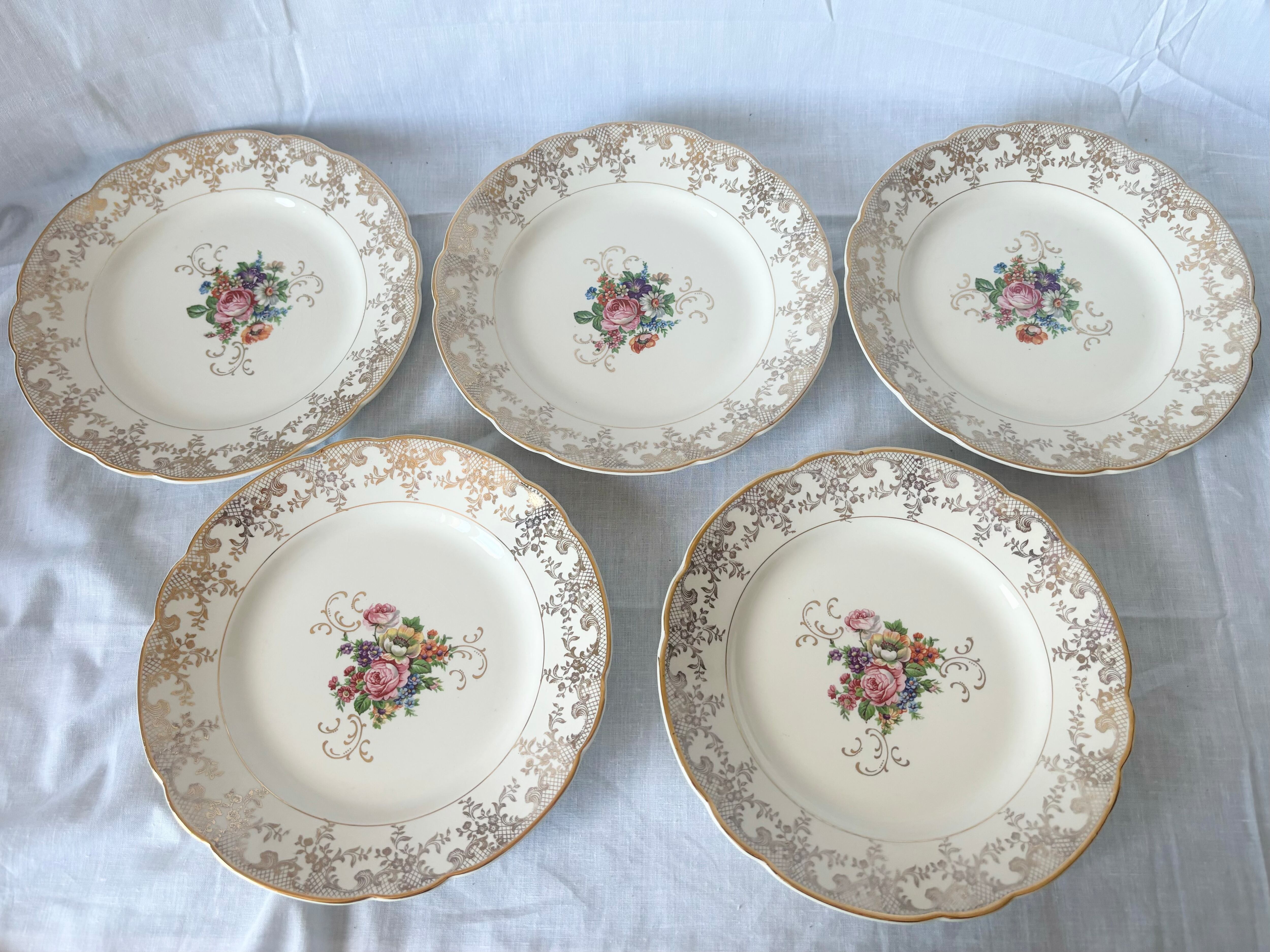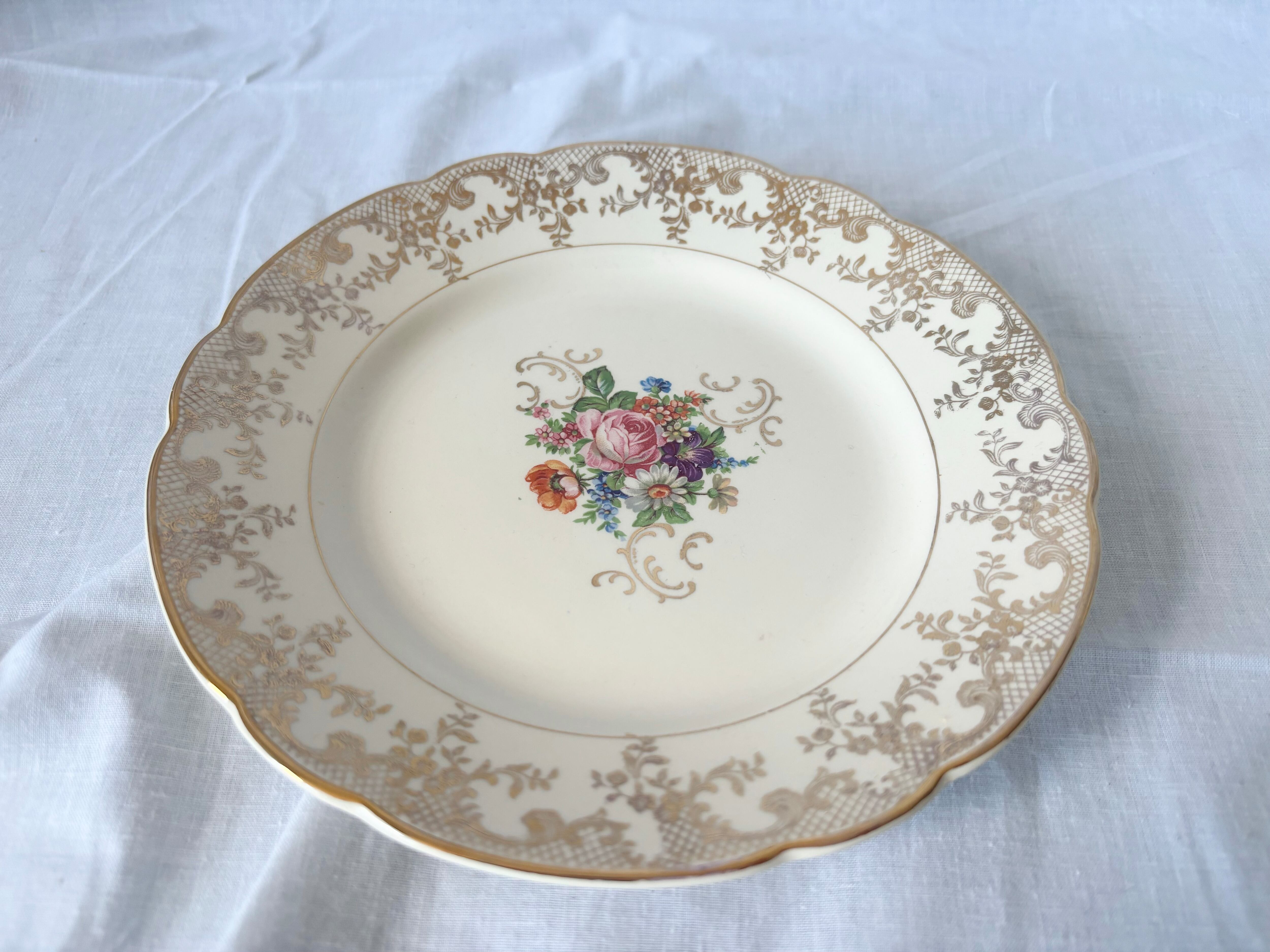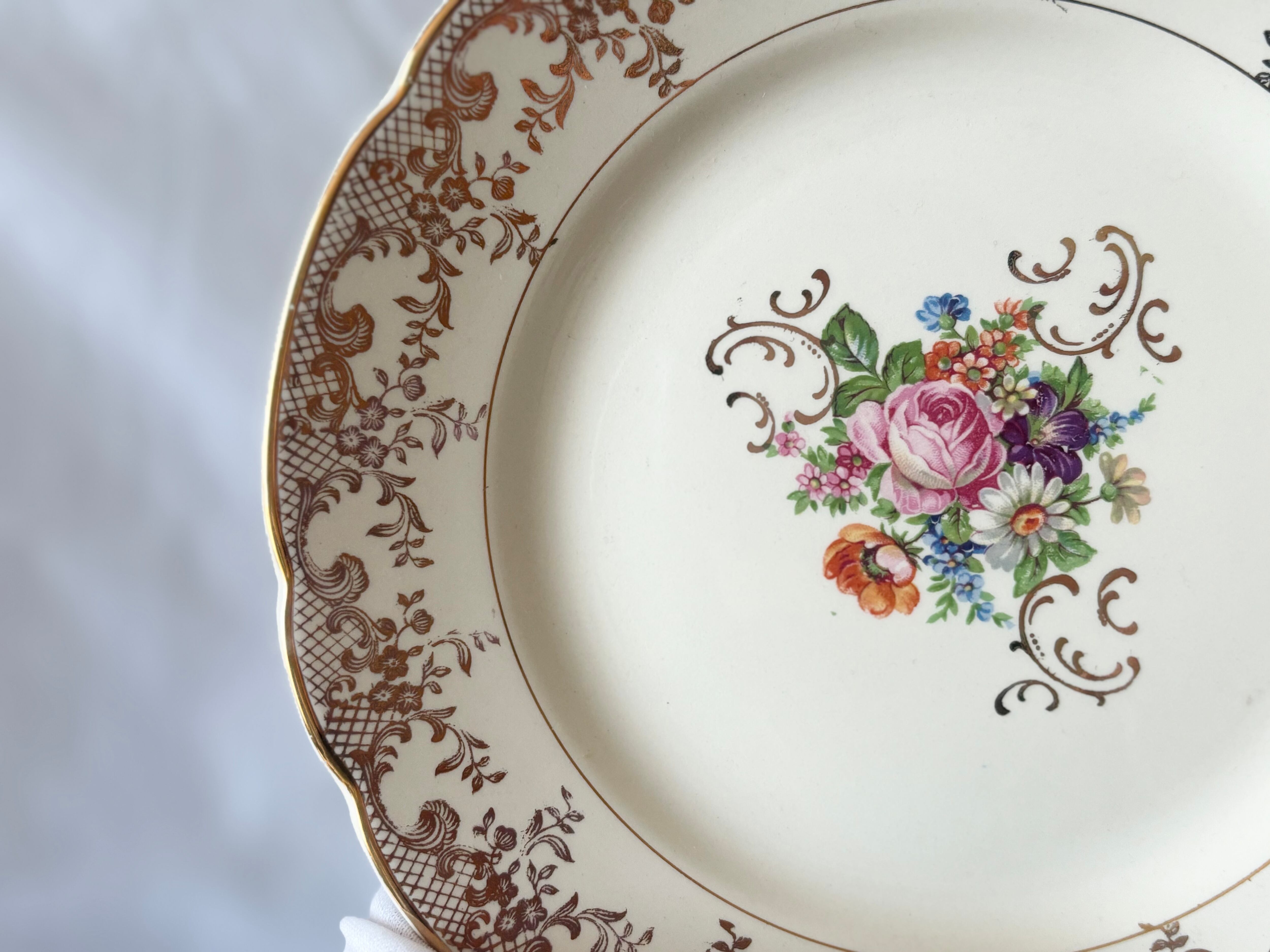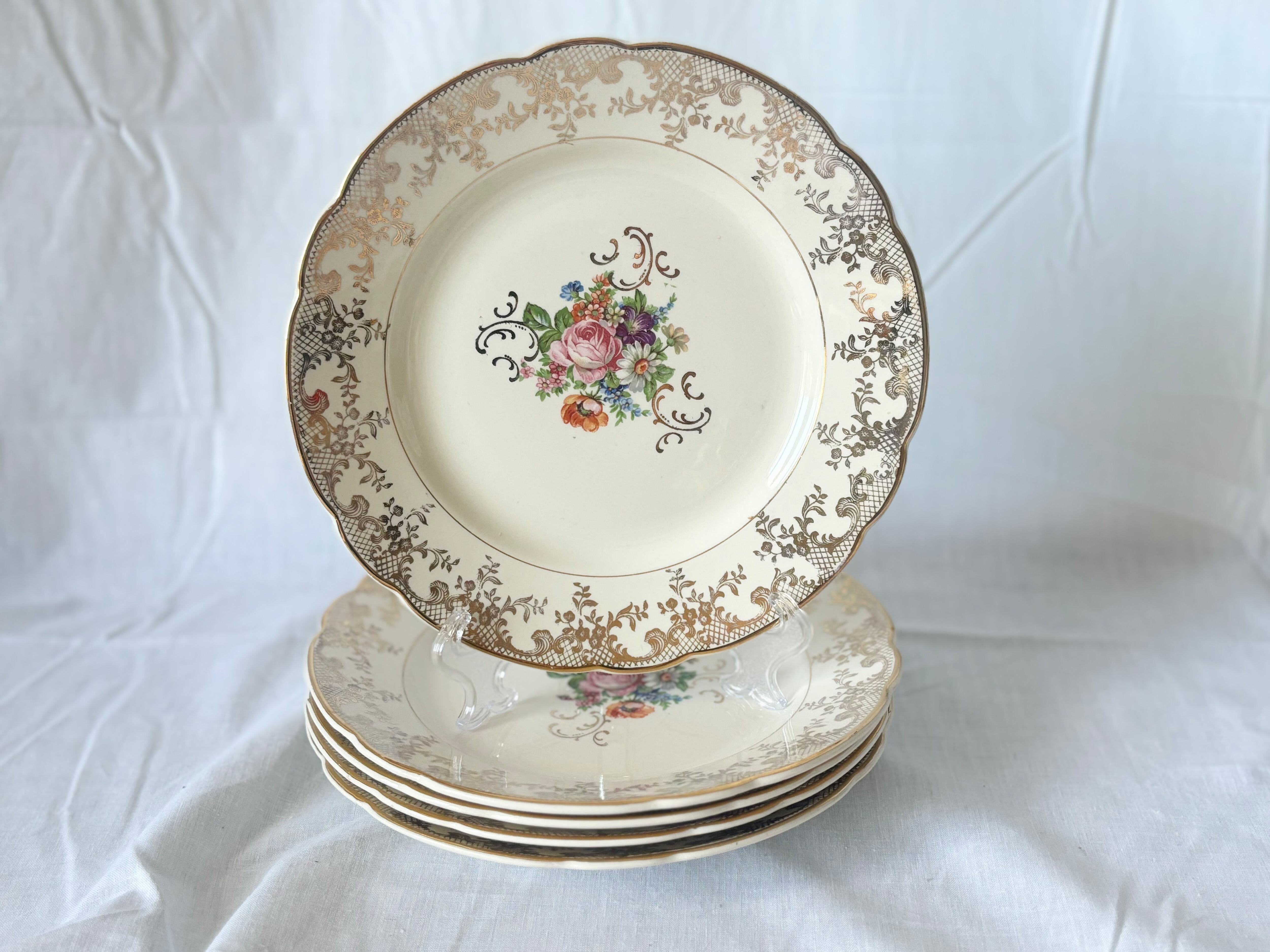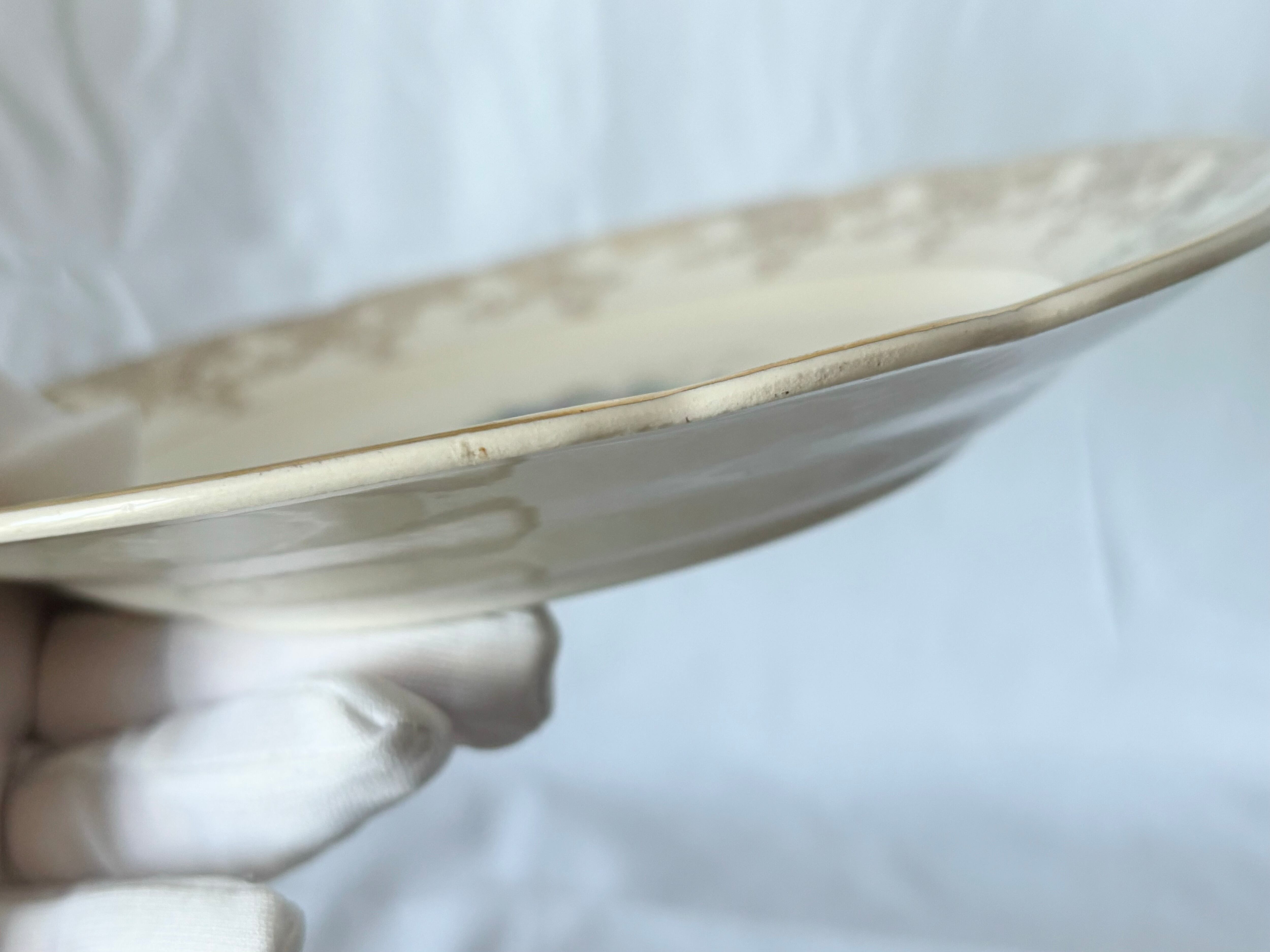 お皿によって、写真でご確認いただけるように、絵柄やリムのゴールド、及び刻印が掠れていたり、クレイジングがあるものや、擦れたような軽い跡があるアイテムがございますが、総じて、光沢が美しく、コンディションの良い商品です。