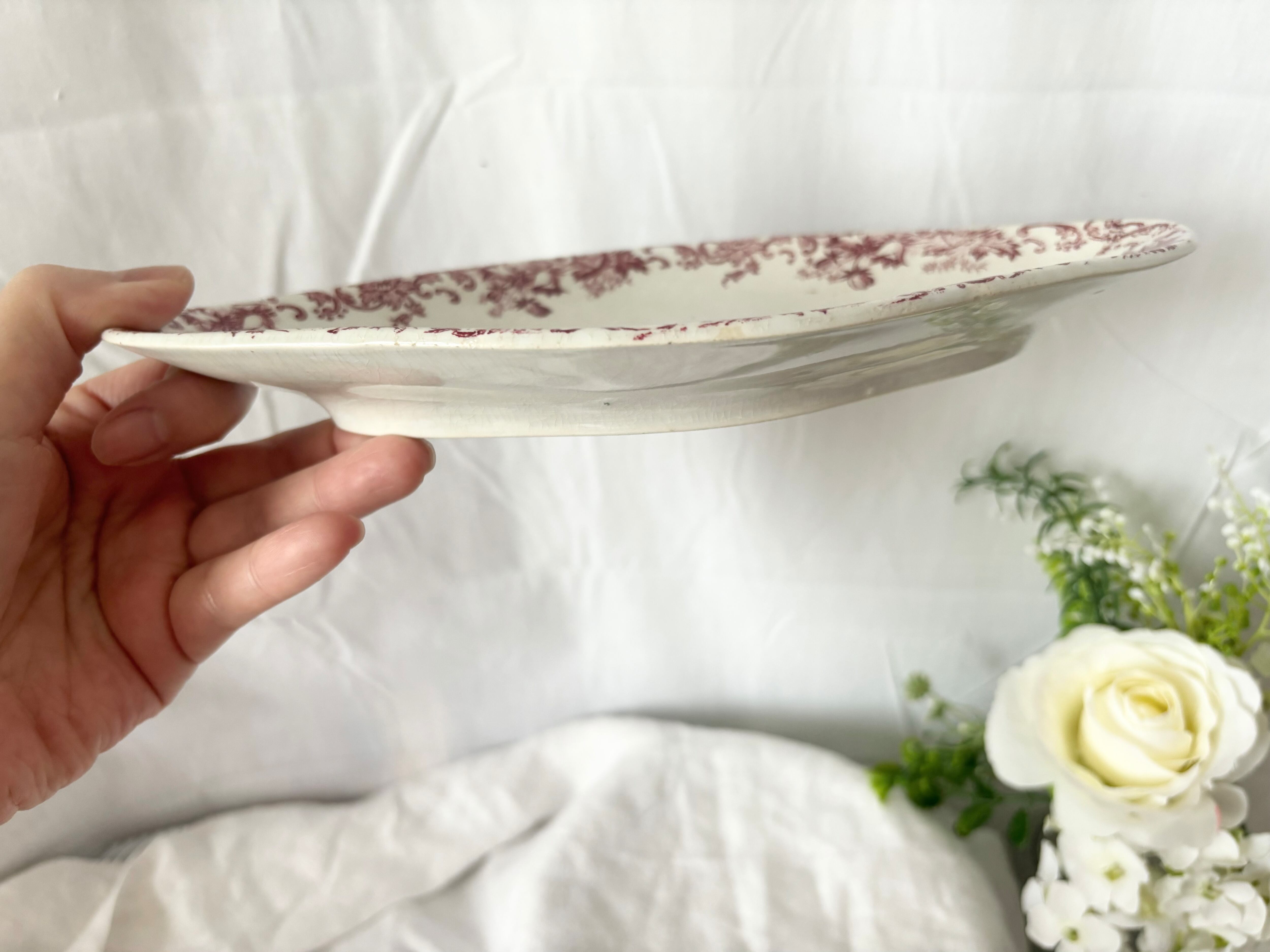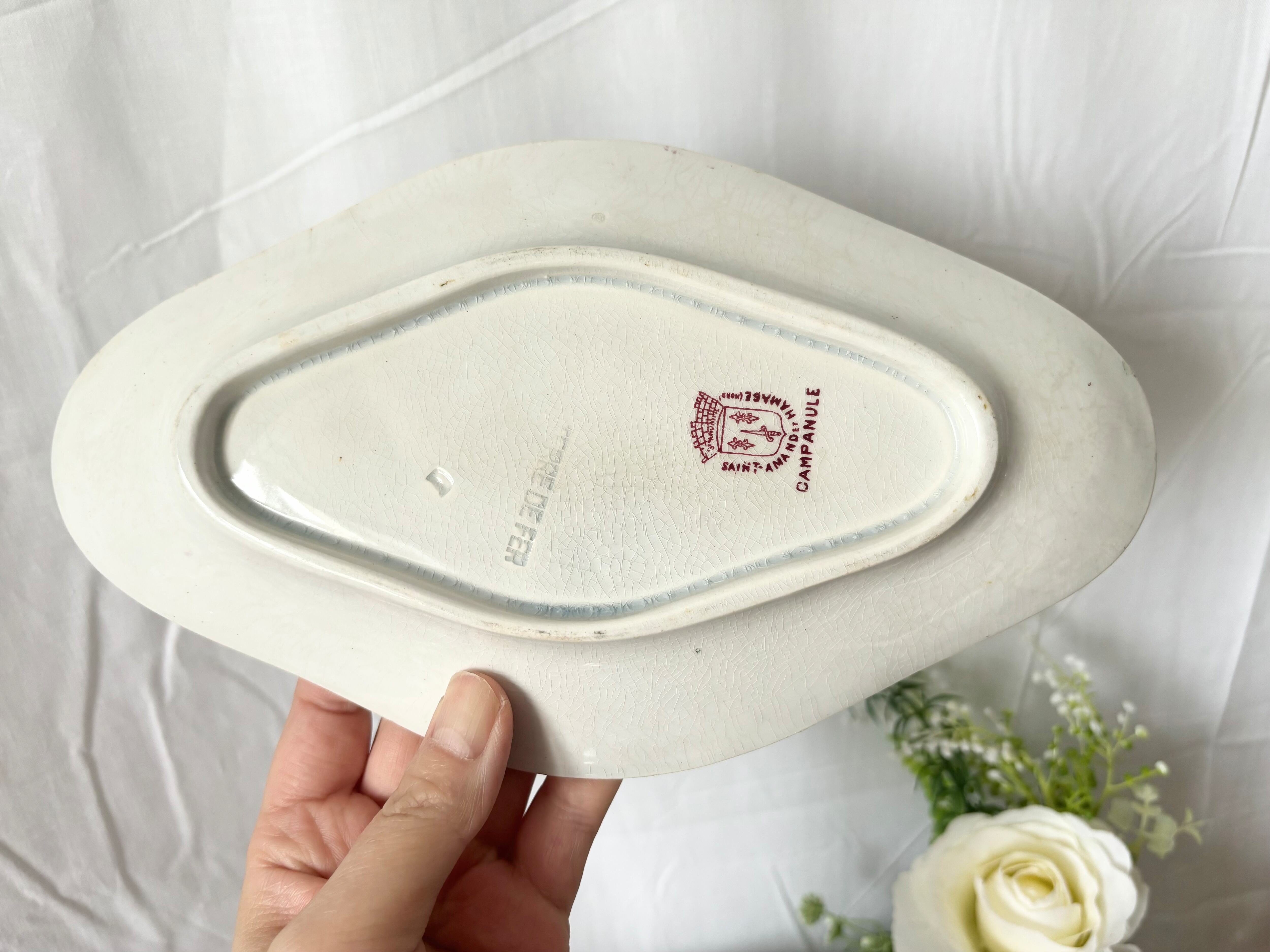 お皿の中央にかけてクレイジングが広がり、お皿全体に、うっすらと、経年劣化の色褪せが確認できます。側面から見ると、小さなシミが確認できます。裏側にもクレイジングが広がり、うっすらと白いライン状のシミが見えますが、アンティークのお品として、艶があり、とても良い状態といえます。