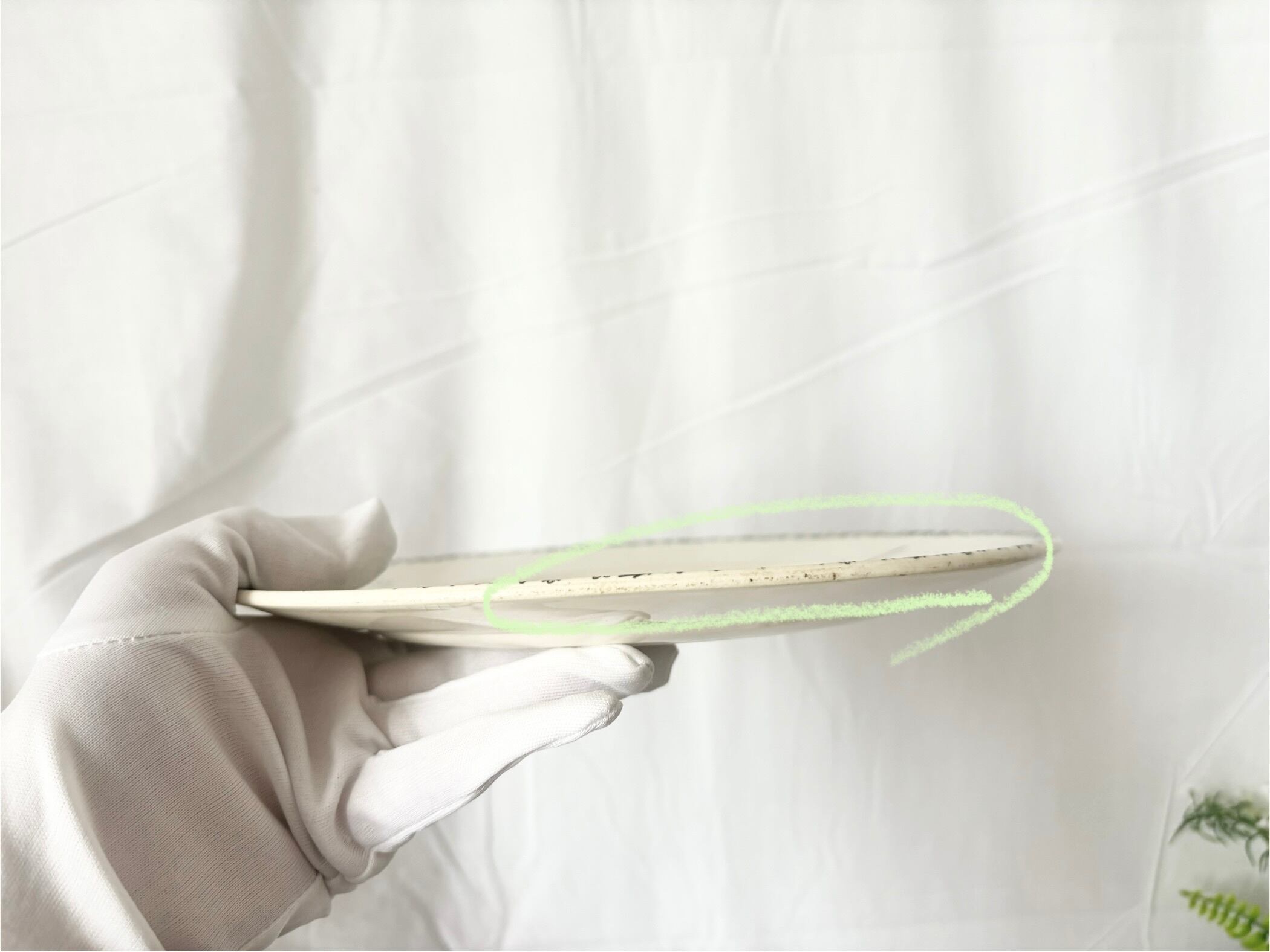 横から見ると、お皿の端にプツプツと小さなキズがあります。裏側は、お皿のリムの一部にクレイジングが広がっています。小さなキズが数点、または制作時についたと思われる小さな茶色味がかった突起がございます。