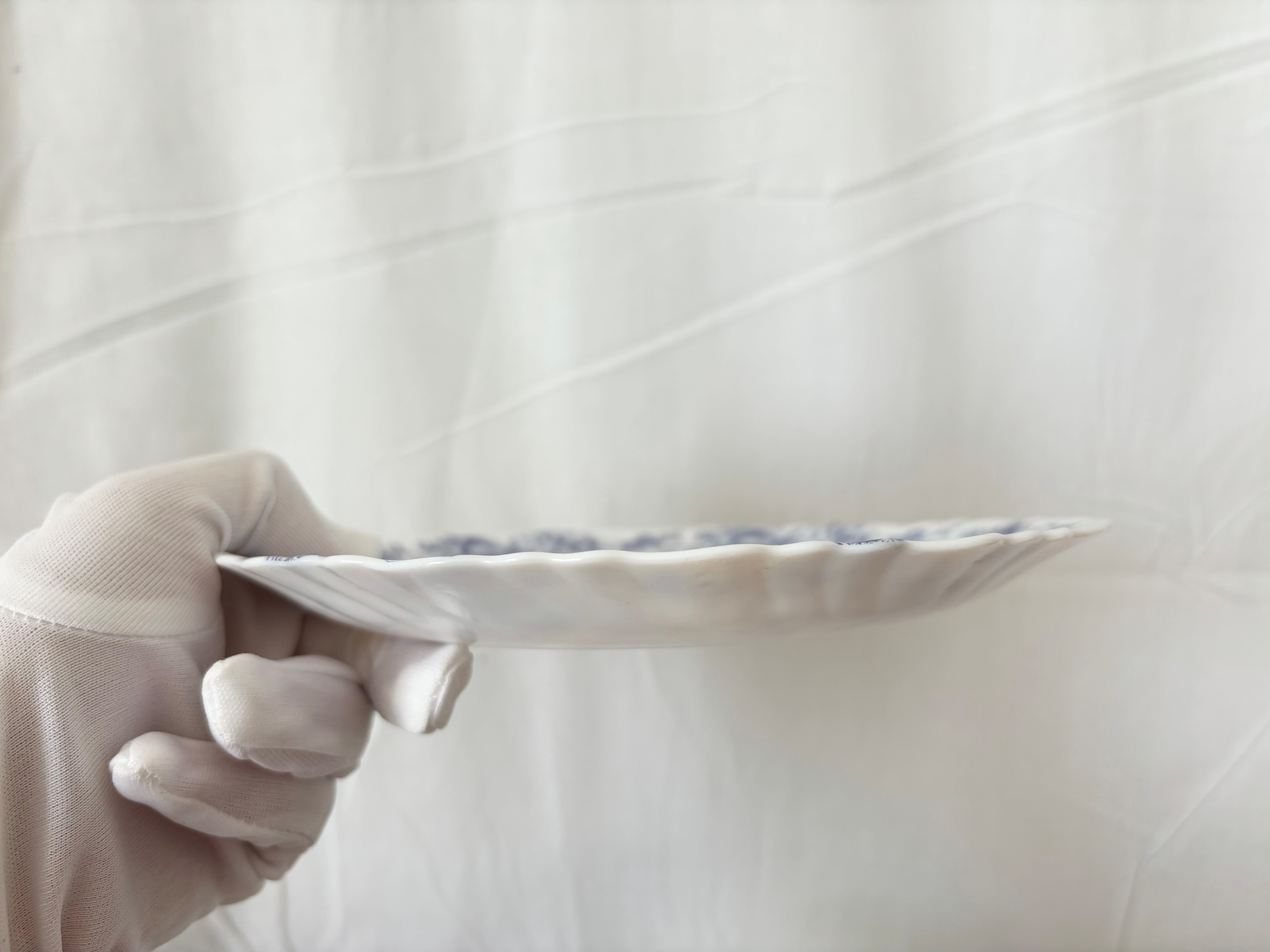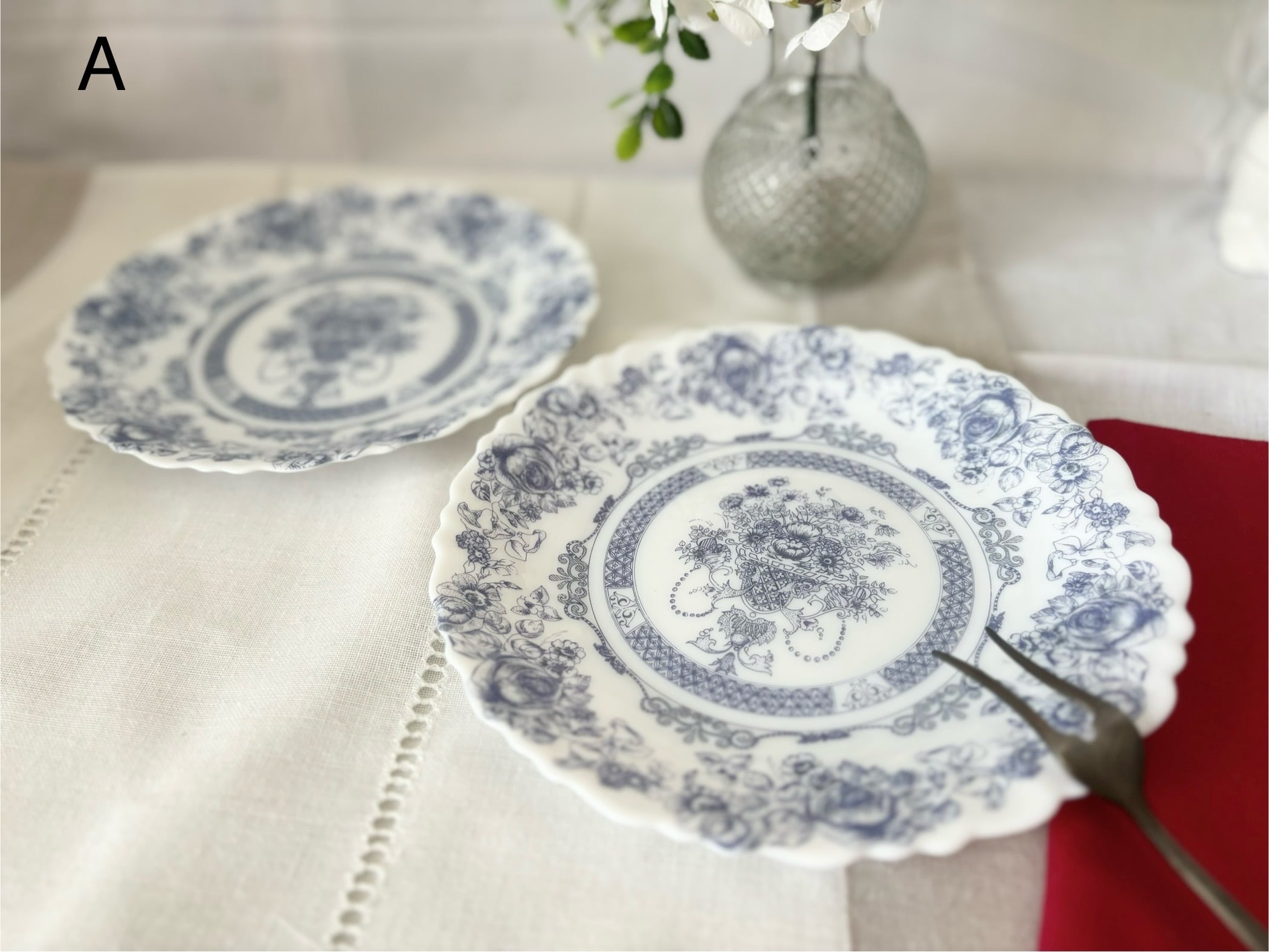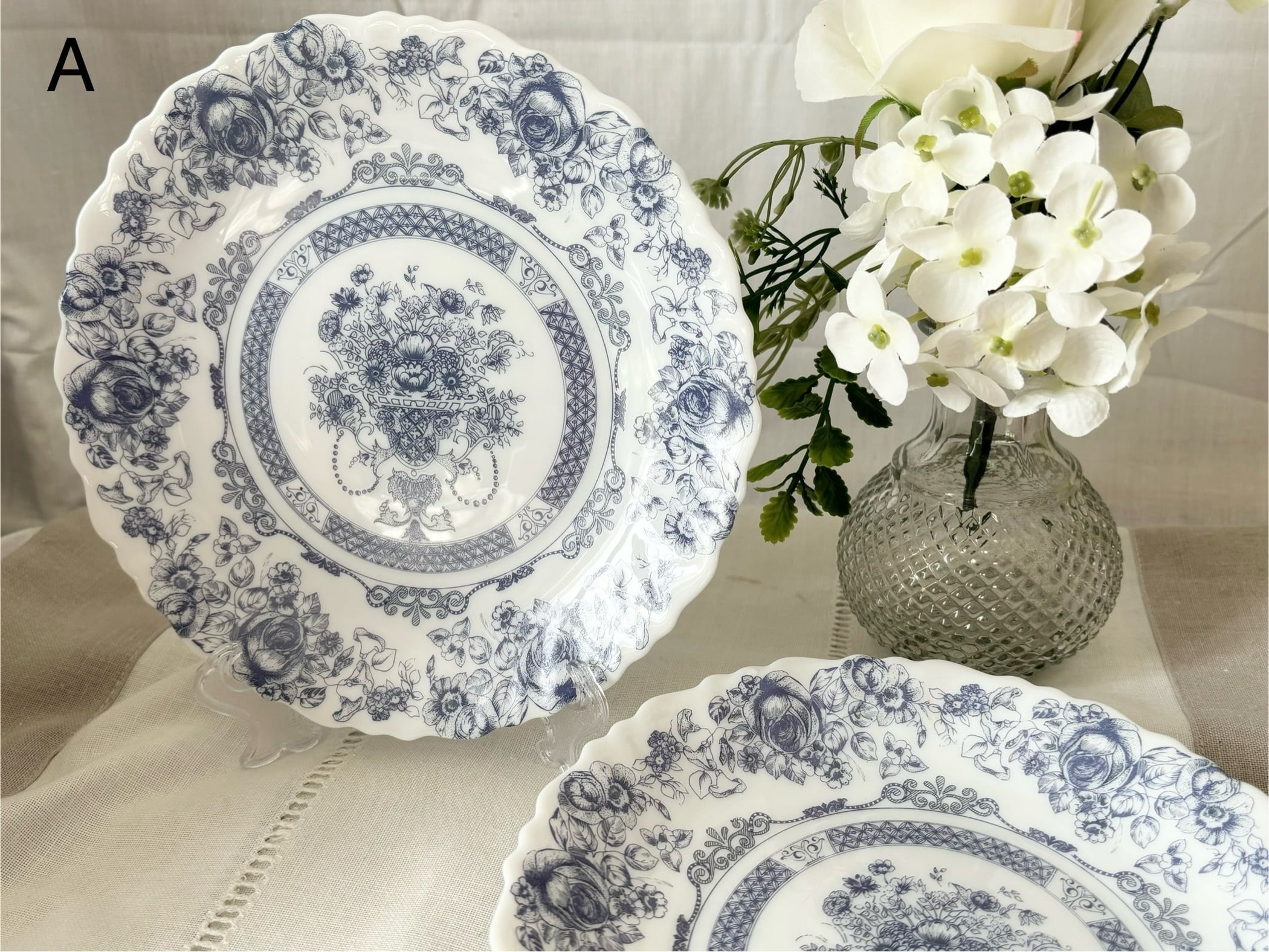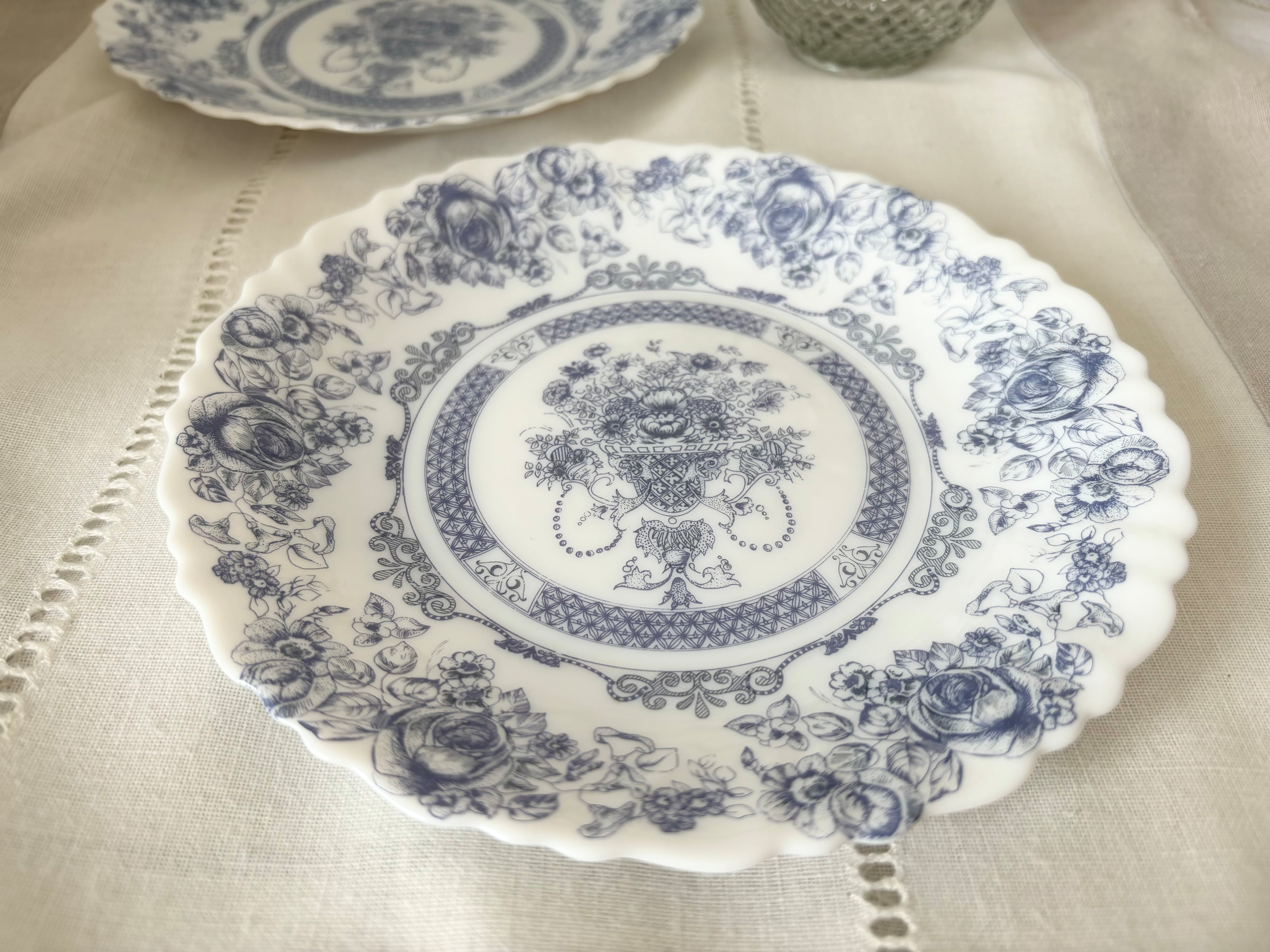 70年代アンティーク、Arcopal (アルコパル)のミルクグラス製、青いガーランドが美しい、花リムのデザートプレート二枚セットです。表示のお値段は、二枚セットのお値段になります。