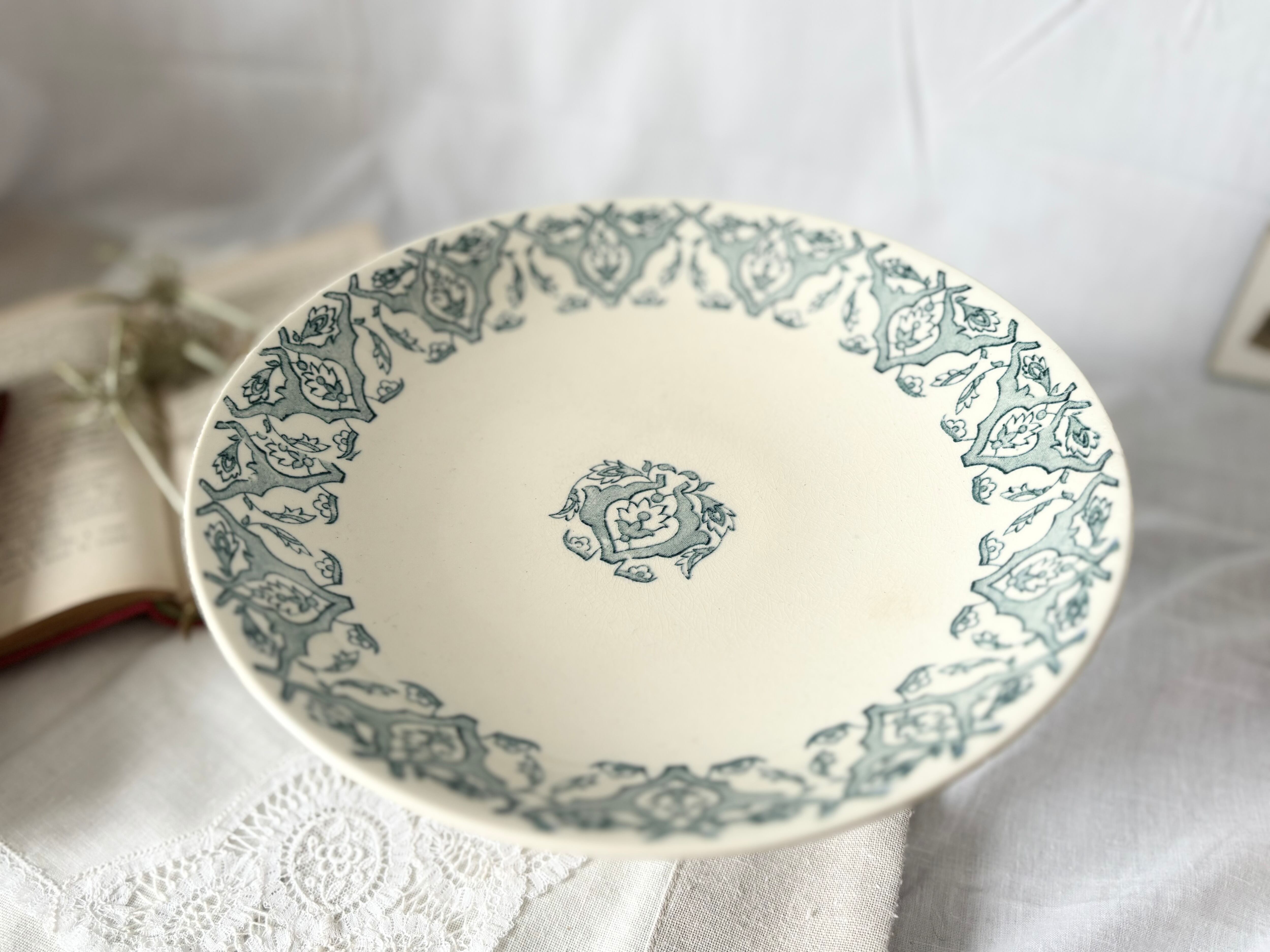 アイボリーの美しく輝く表面に、青みがかった緑。地中海の木々と、大きな花で、ギリシャ神話思い起こさせる様な、力強いパターンかが施されています。