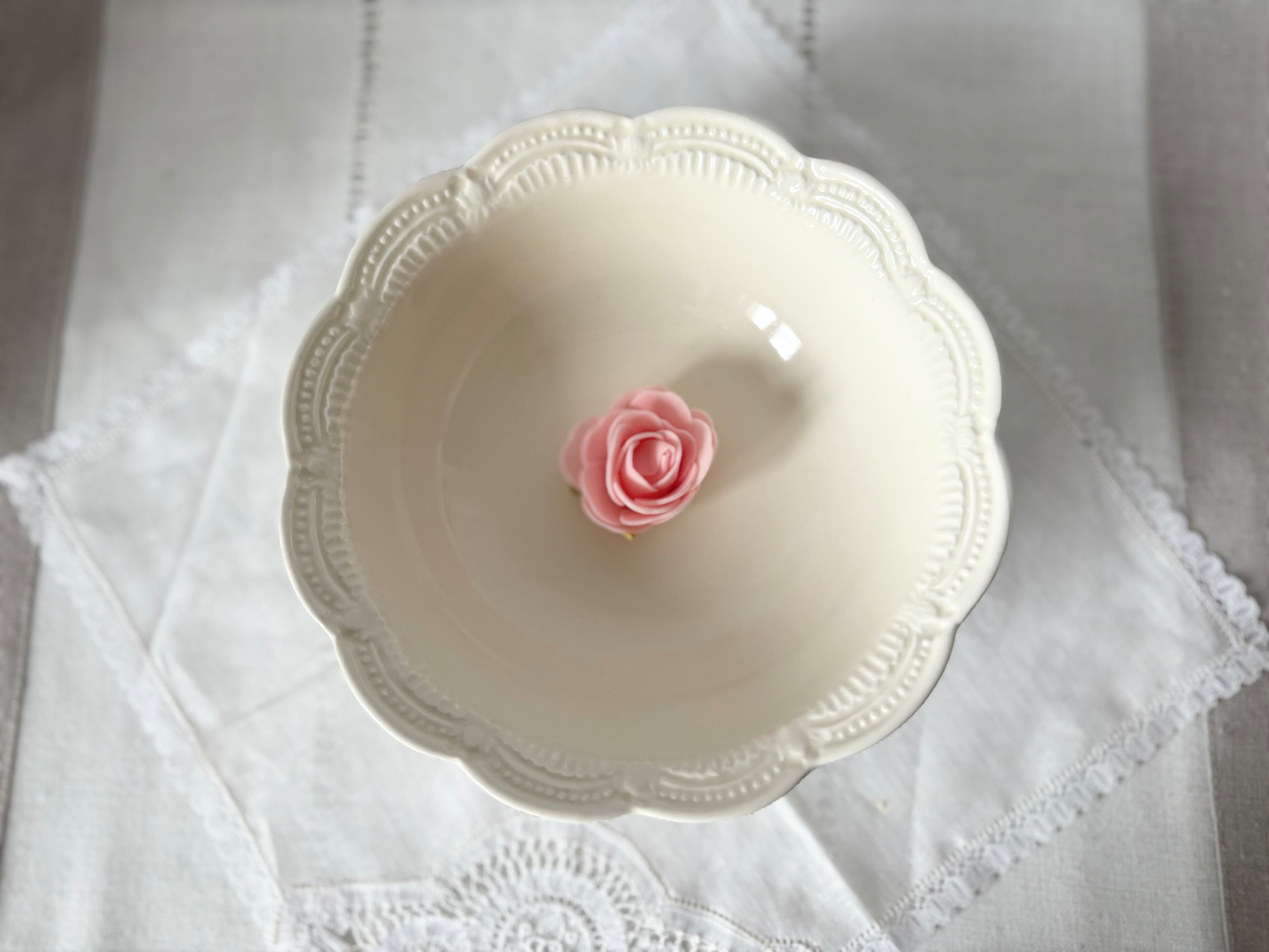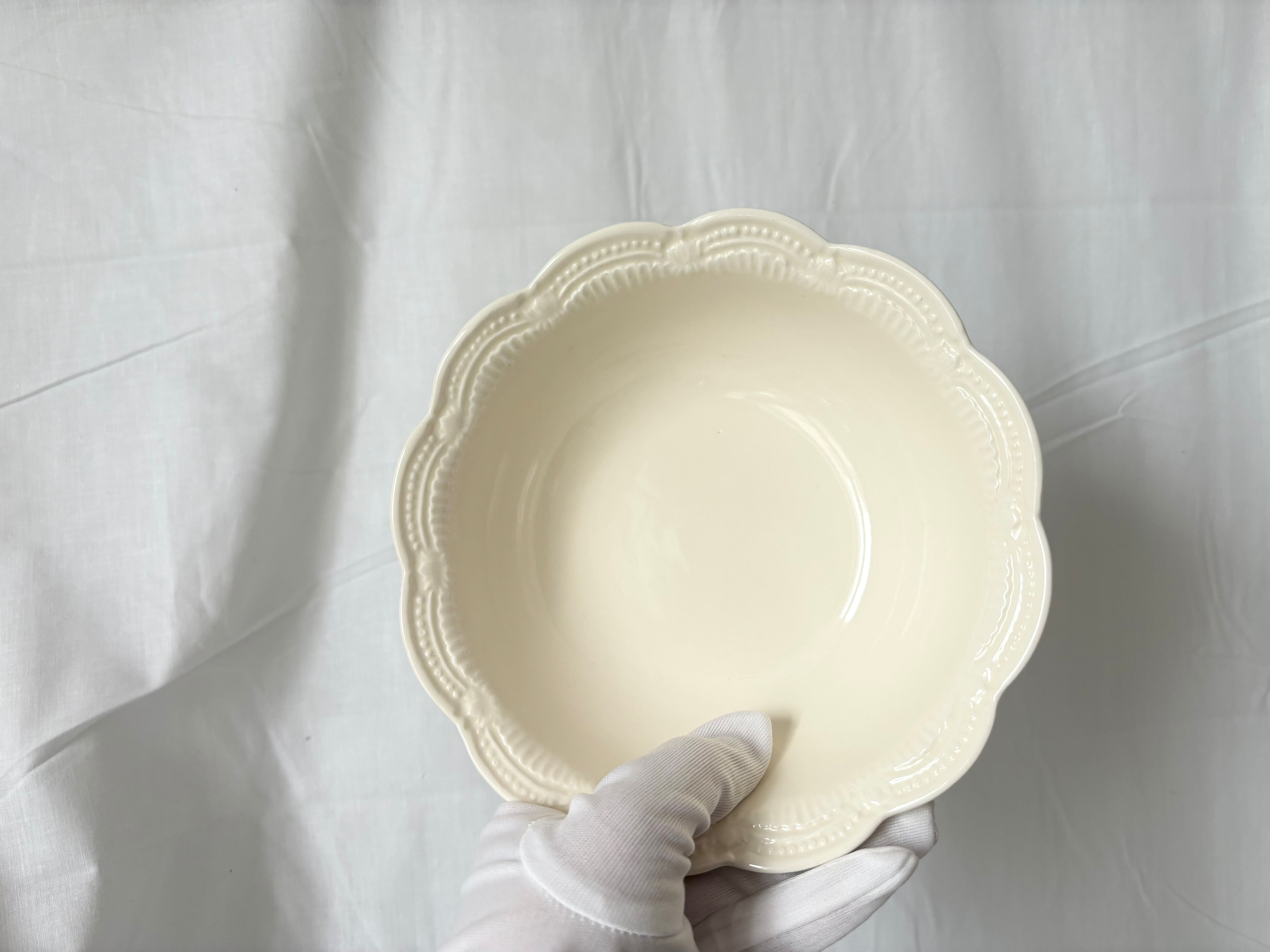 リムに施された細かな彫刻が可憐で美しく、大変艶やかなお皿。フェミニンな印象のこのボウル、重さは500グラムあり、しっかりとした安定感があり、上質で、耐久性もあるお品だとわかります。