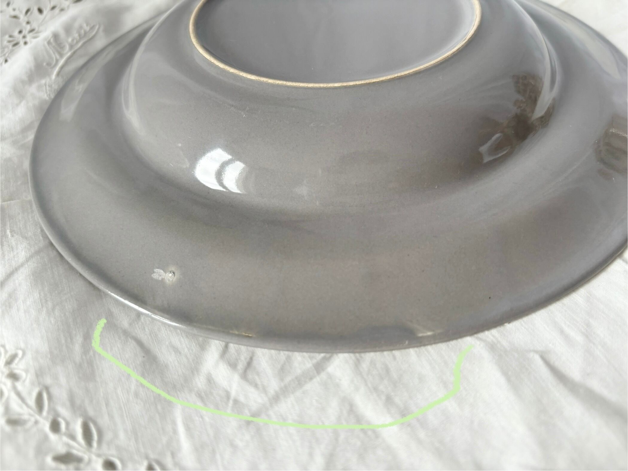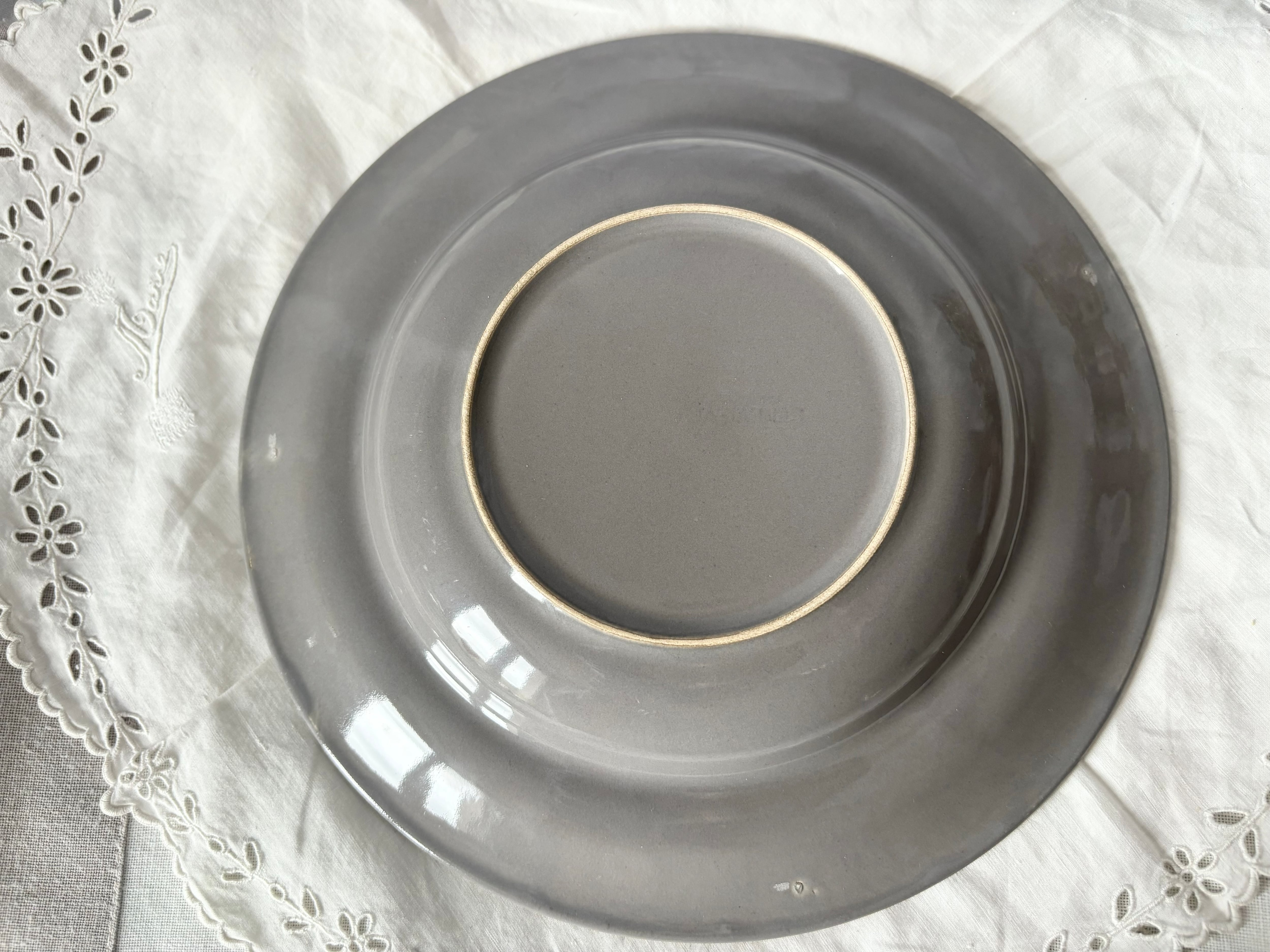 極僅かなカトラリー跡があります。裏にお皿の制作時にできたと思われる突起が見当たります。裏側のリムにグレーの色むらがあり、白っぽい部分があります。裏に極薄い刻印がございます。