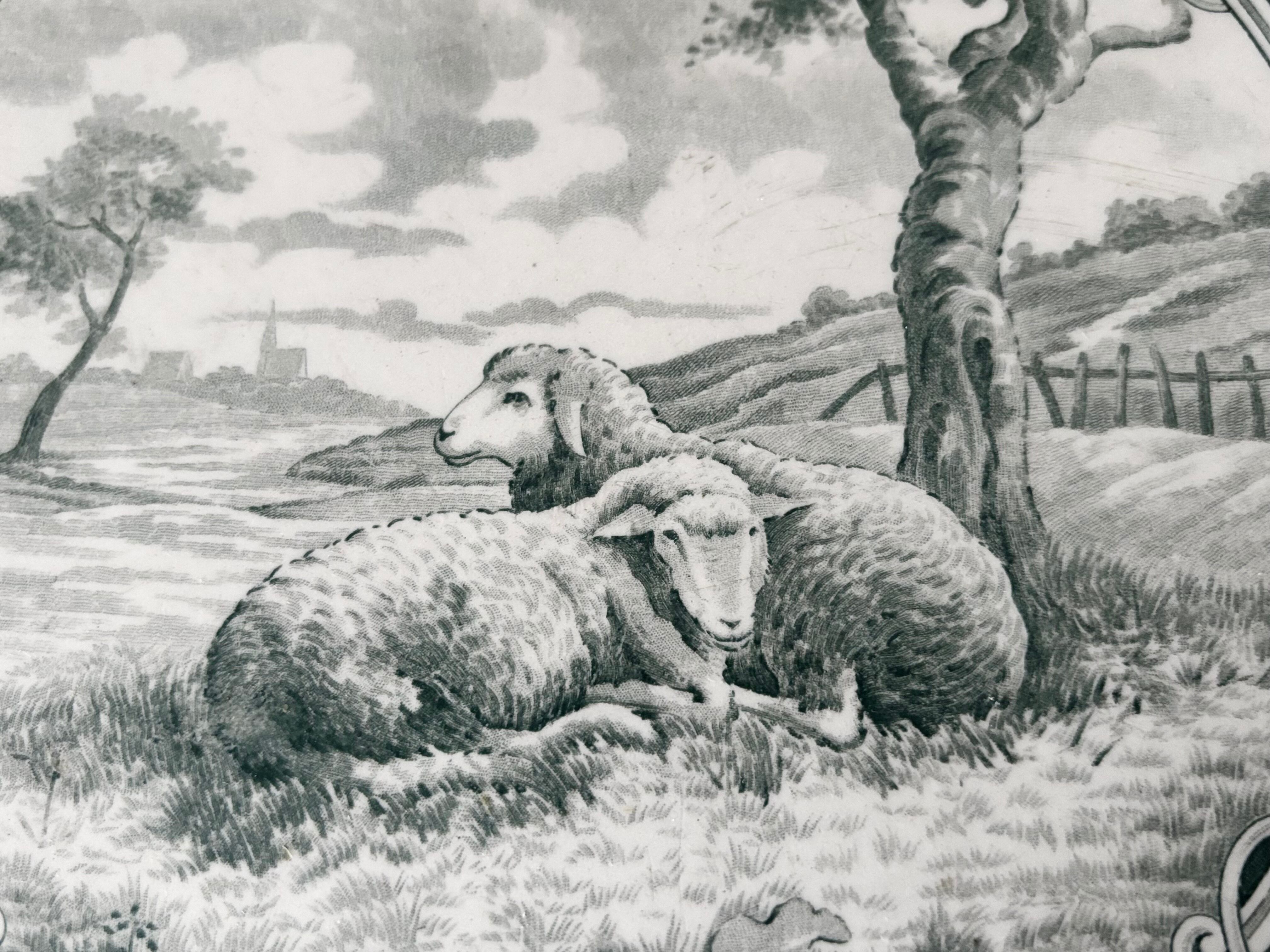 深い緑で描かれた、花のフレーム。その輪の中に、長閑な草原の風景が広がっています。仲睦まじい二頭の羊が木の下に横たわり、遠くには教会のある集落が見えます。
