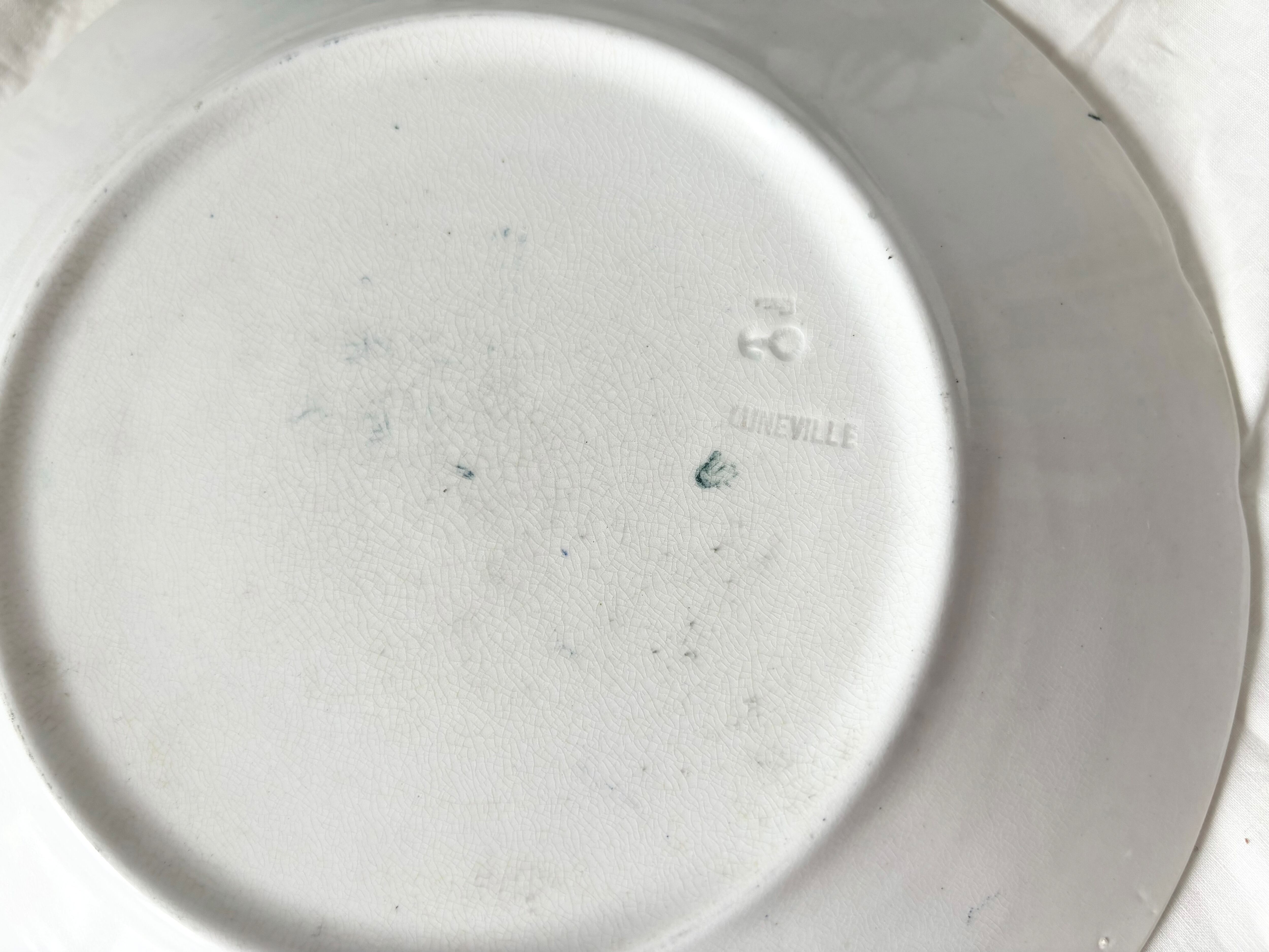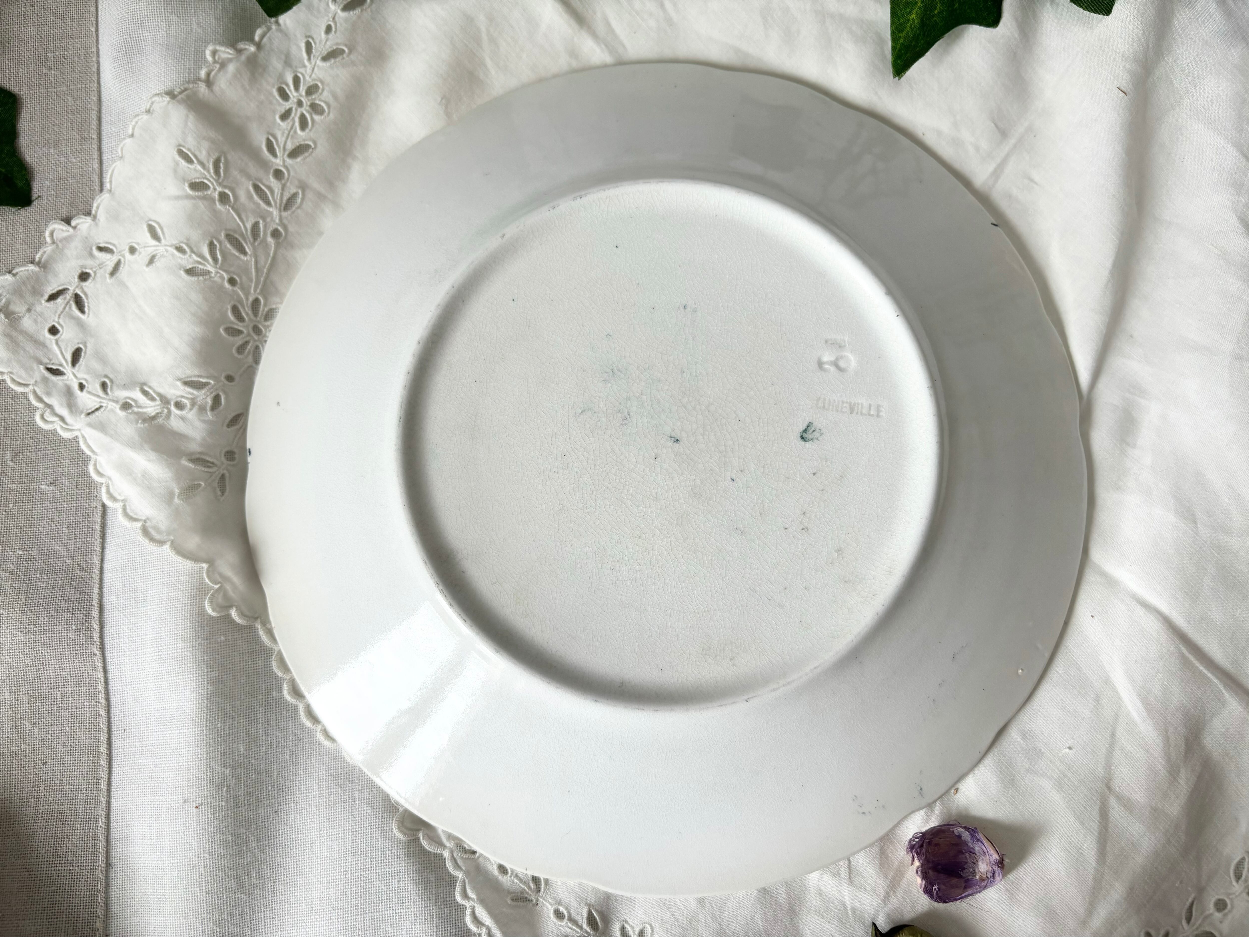 アイテムのコンディションとして、お皿の中央から、細かいクレイジングが広がっています。お皿の表面に、細かく薄い傷がございます。絵柄に掠れがあり、リムの一部に経年劣化の色褪せと、色飛びが確認できます。裏側に色飛びが多くみられます。裏にLunevilleの刻印があります。