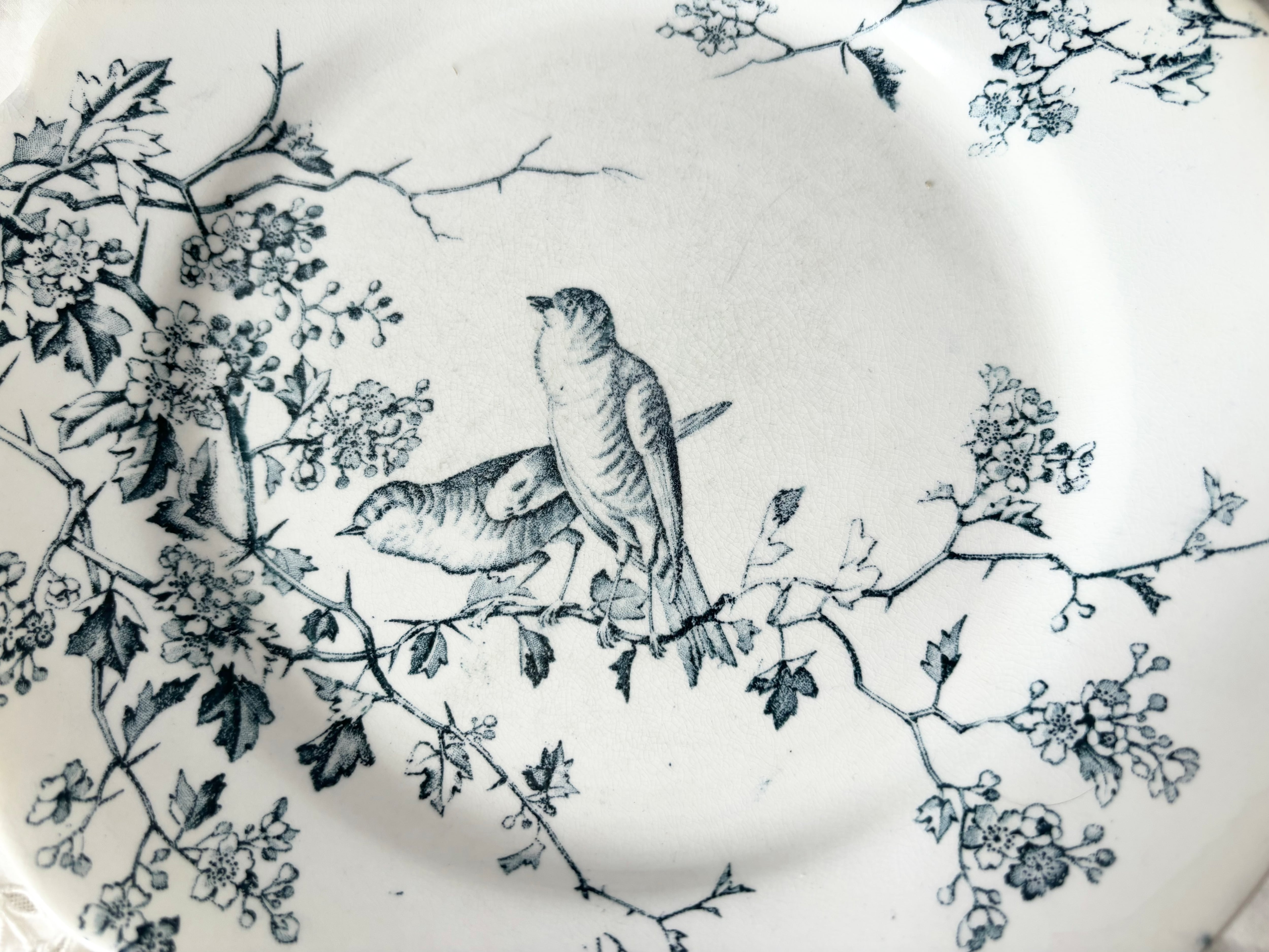 デザインには、19世紀後半から20世紀初頭にかけての自然主義の特徴と、ジャポニズムの嗜好が盛り込まれています。線と点とで、桜の小枝と、花に話しかけているかの様な、可愛らしい小鳥達の姿が、濃淡を伴って、克明に描かれ、プレートの花リムも、どこか、桜の花の形を思わせる様な、デザインです。