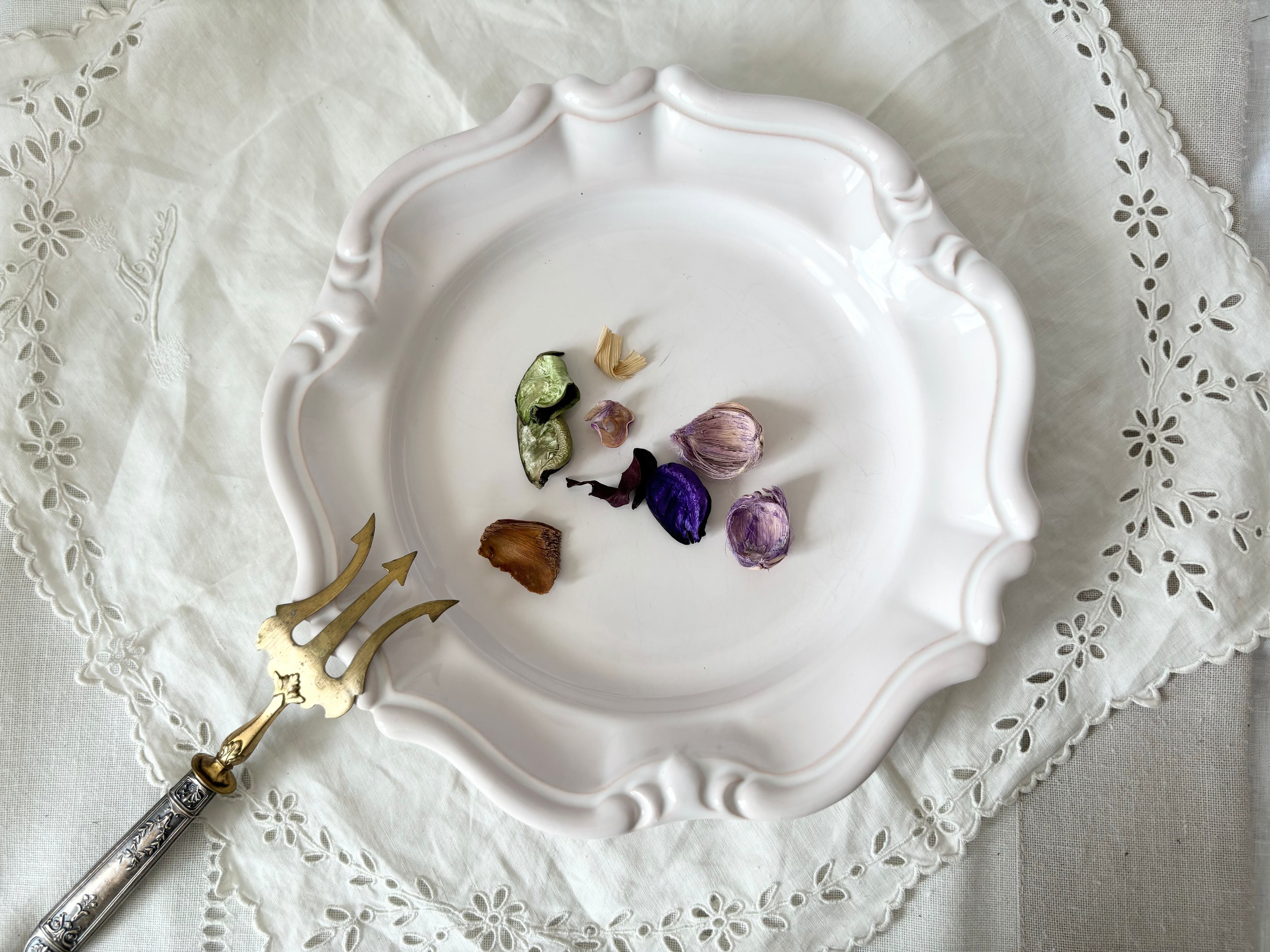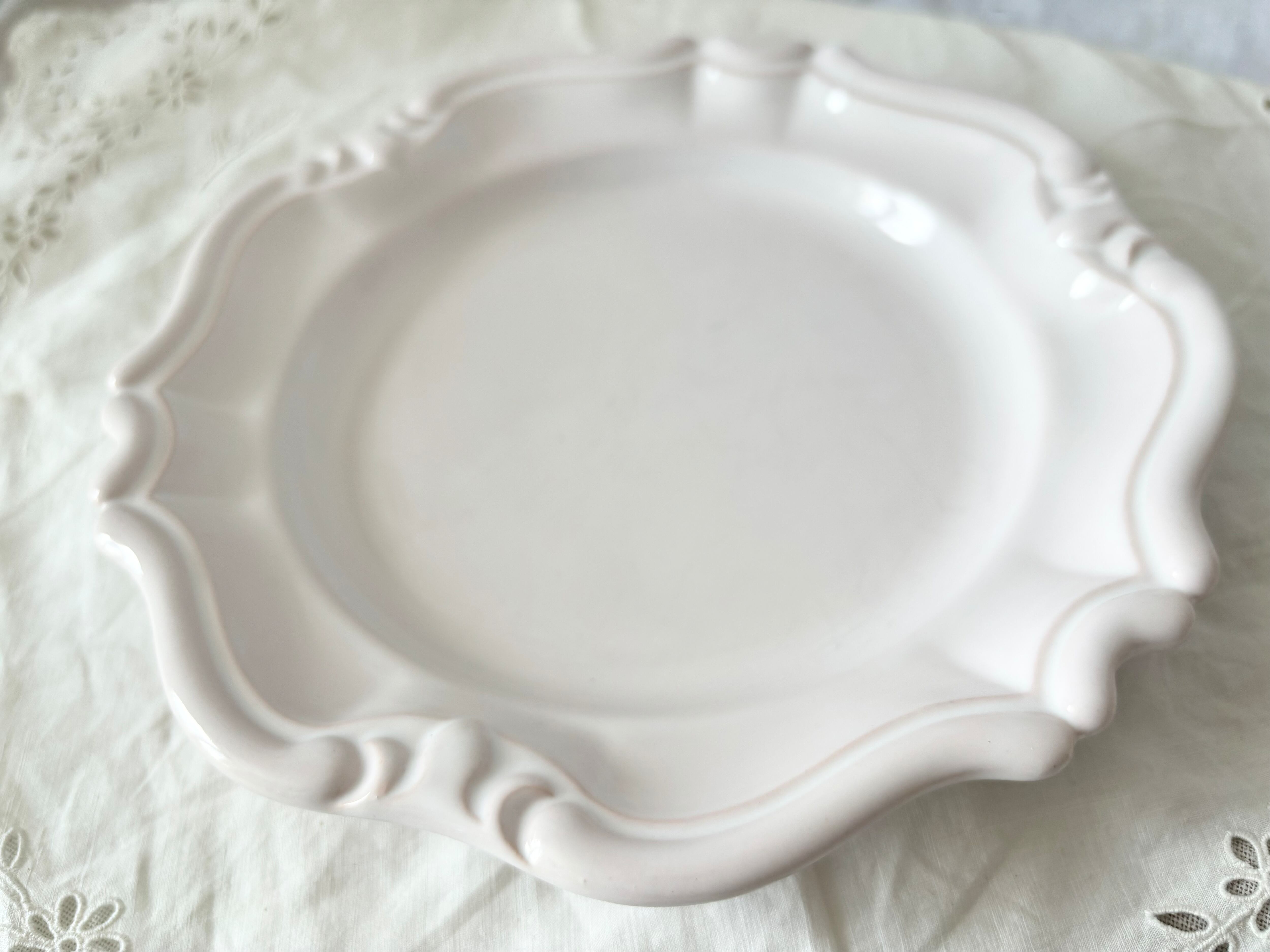 お皿に厚みがあり、リムに施された彫刻の掠れ具合も美しい、大変艶やかなお皿です。白い釉薬のアイテムですが、南仏焼き特有のベースとなる陶器の土色が透けているため、ほんのりピンクがかっているのが、特徴です。