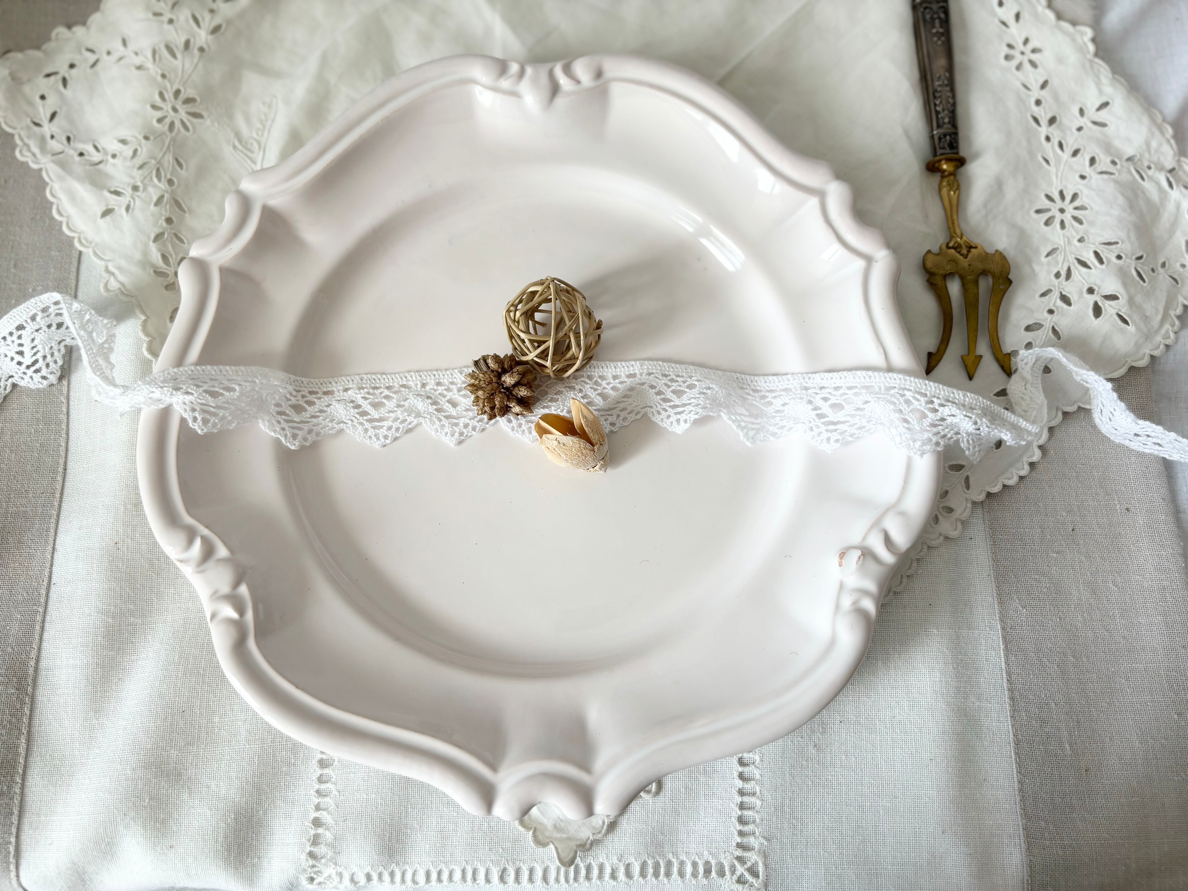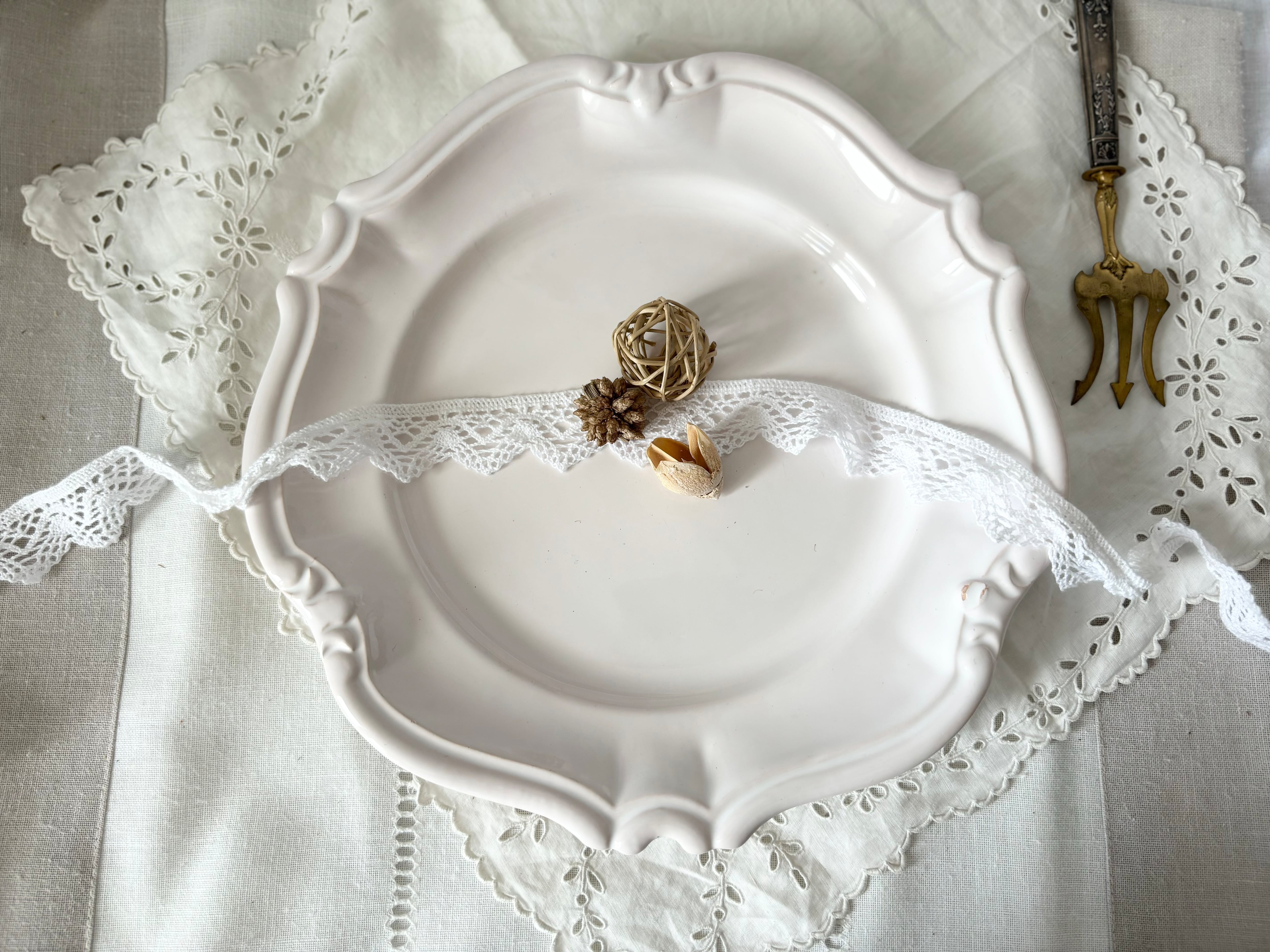 お皿に厚みがあり、リムに施された彫刻の掠れ具合も美しい、大変艶やかなお皿です。白い釉薬のアイテムですが、南仏焼き特有のベースとなる陶器の土色が透けているため、ほんのりピンクがかっているのが、特徴です。