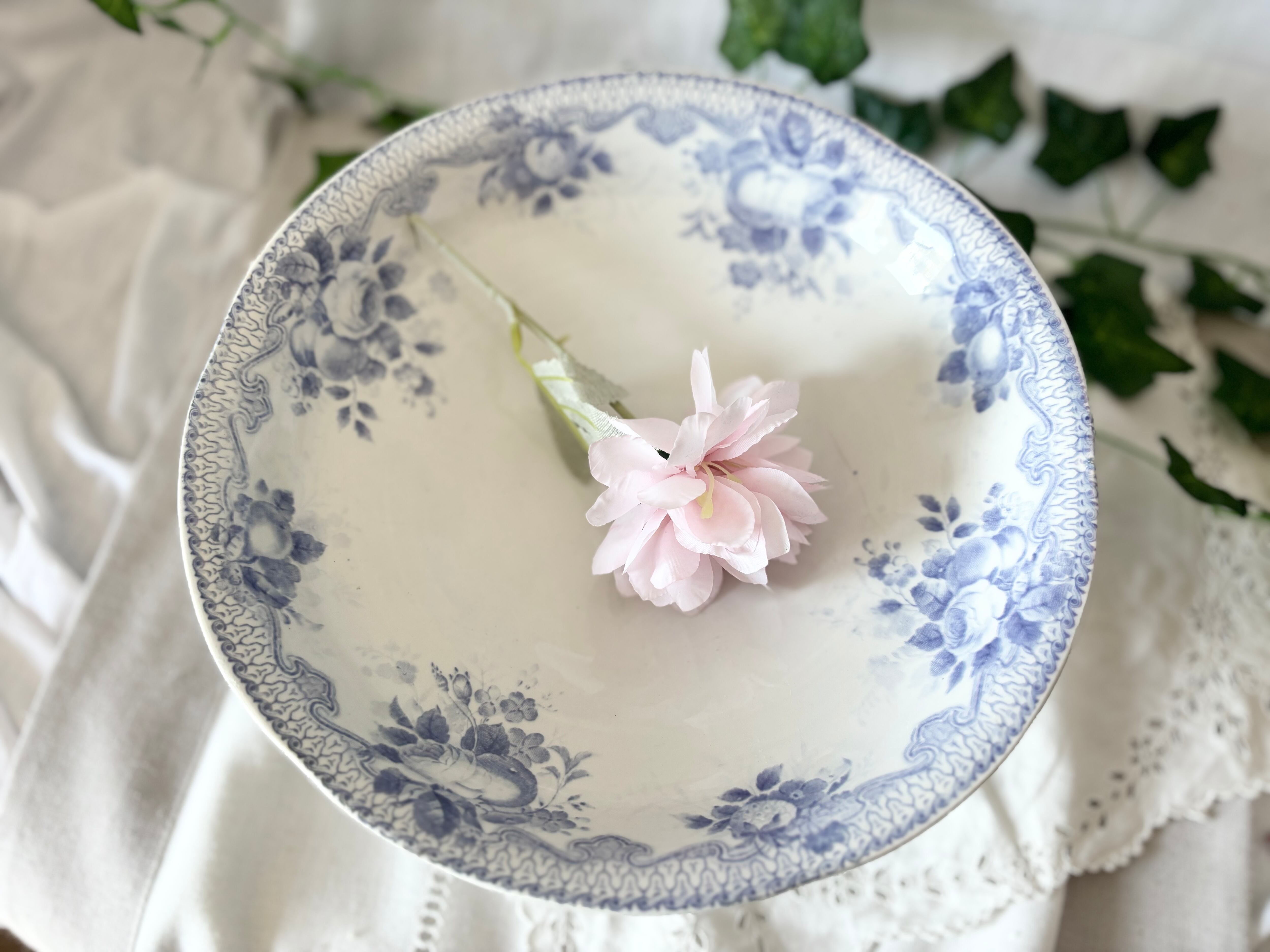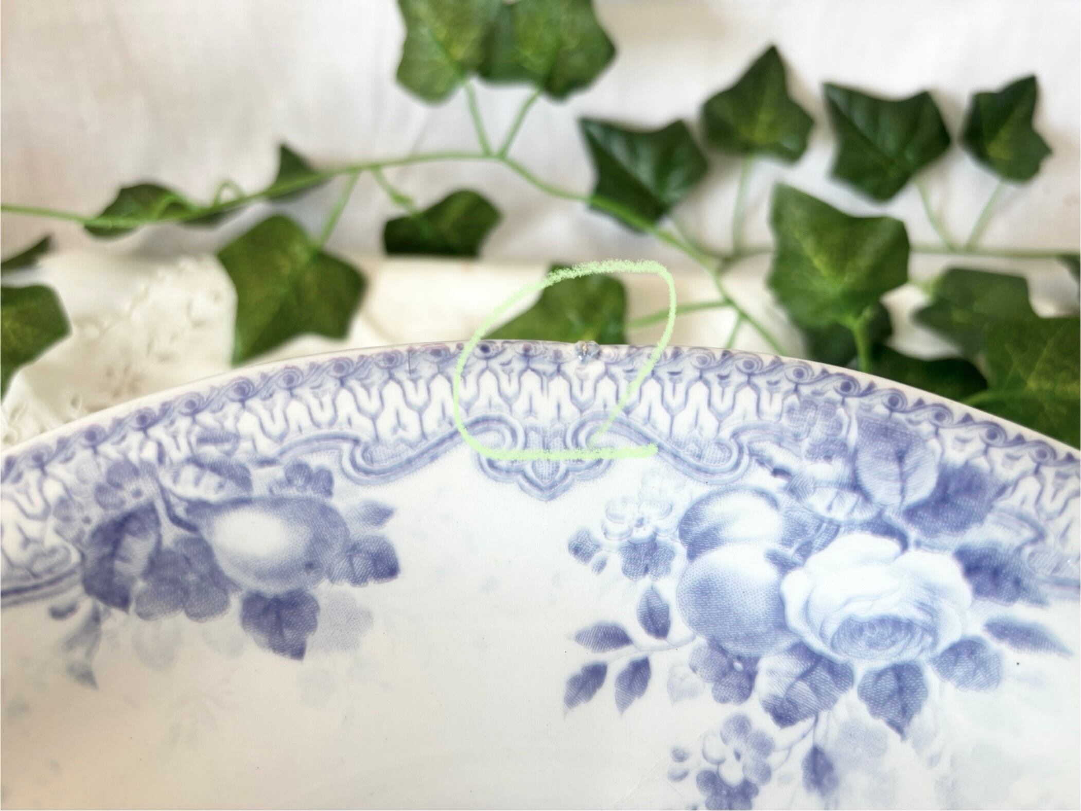 アイテムのコンディションとして、器の内側に、Y字型のヘアラインのひびがあり、裏まで貫通しています。器の縁に、1箇所、エナメルが固まった様な突起がございますが、それ以外は特筆すべきダメージも無く、この時代のアンティークのお品としては、大変状態の良い物と言えます。