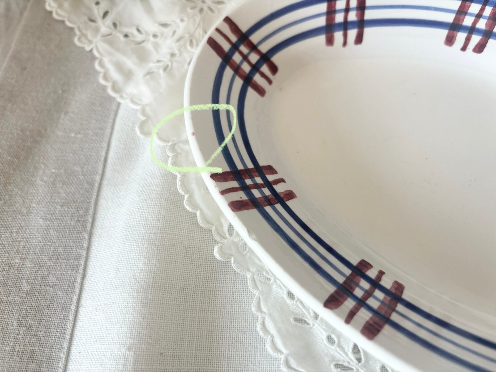 バスク地方の伝統的なカラーやパターンが取り入れられた、このラヴィエは、お皿の端に小さな傷としみ、がございますが、それ以外は特筆すべき大きなダメージも無く、キラキラと輝いて、大変良い状態のお品物と言えます。