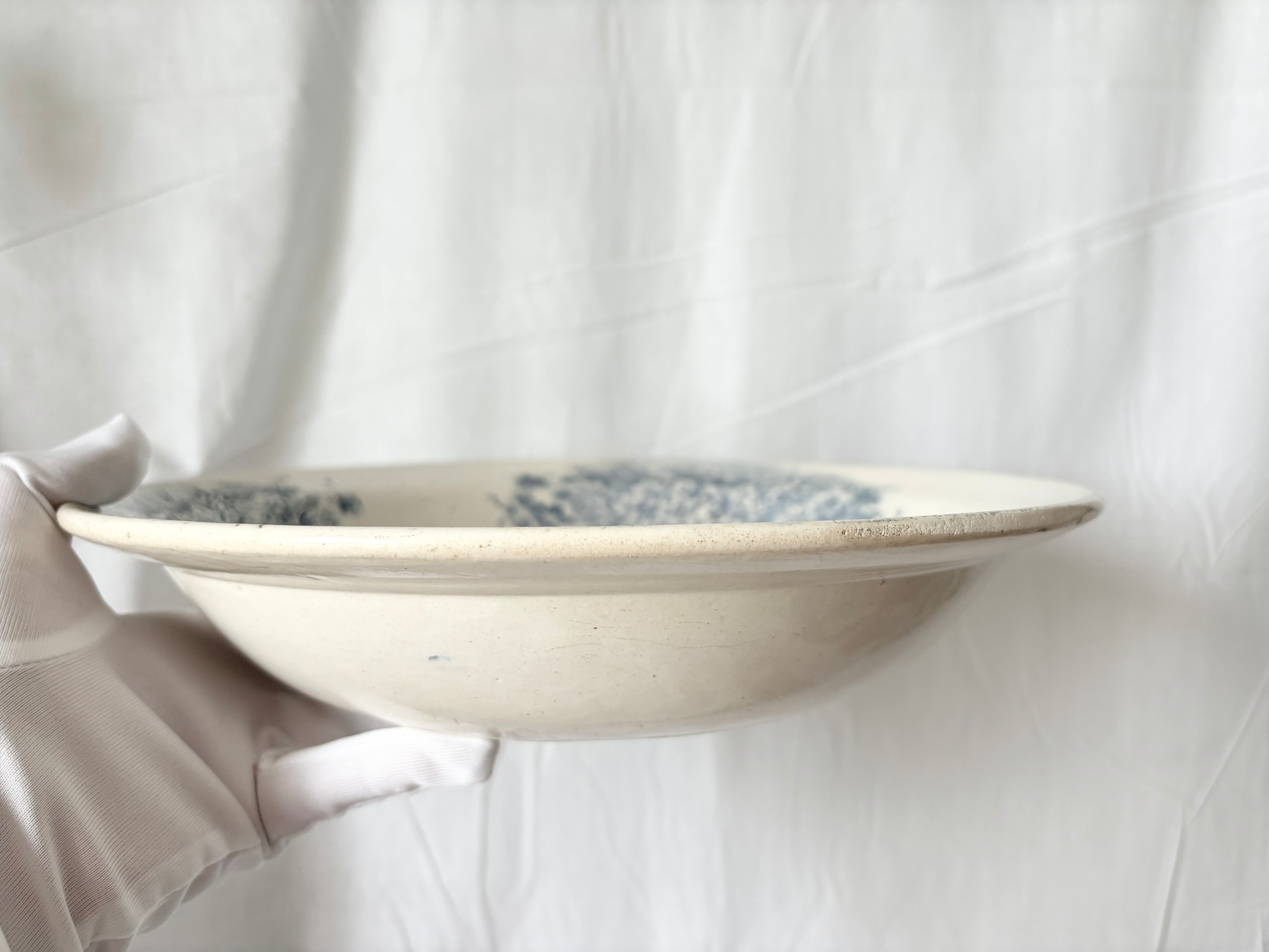 アイテムのコンディションとして、ボウル全体に経年劣化の色褪せと共に、クレイジングが広がっています。ボウルの底に小さな傷が散在しています。絵柄に掠れや途切れ、滲みがございます。絵柄の濃い部分と薄い部分で色味が違います。