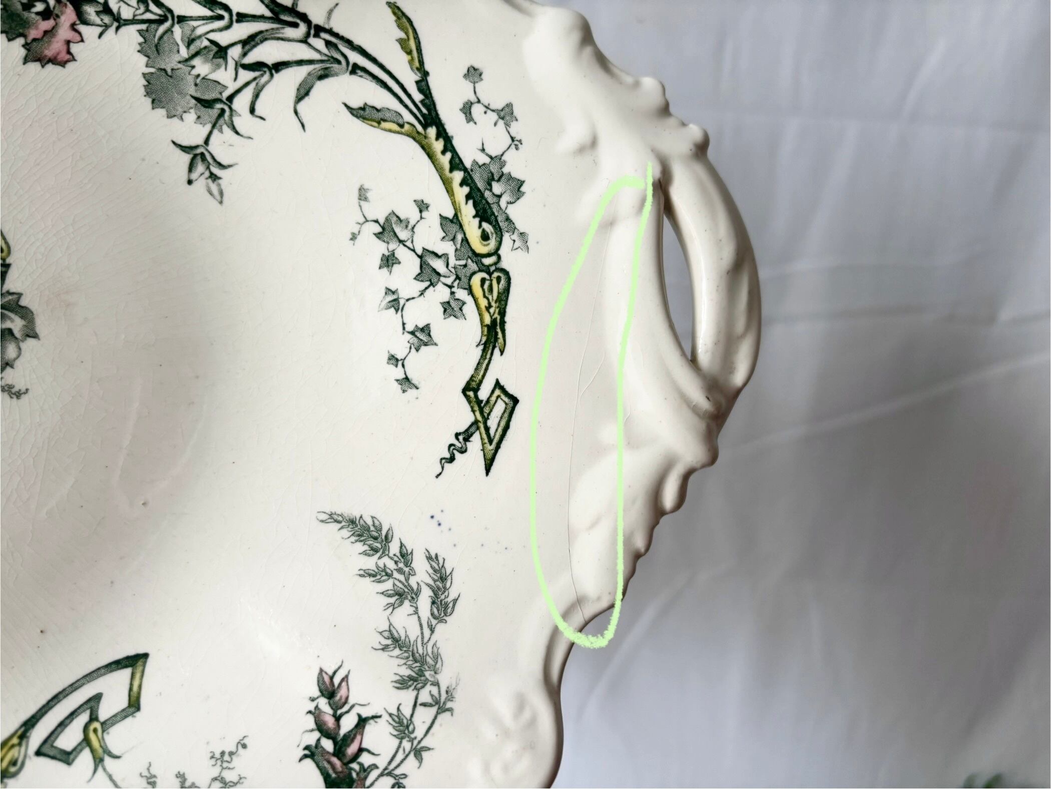 アイテムのコンディションとして、アイテム全体にクレイジングが広がり、器の表面に小さな軽い傷と、薄く小さな点々のシミ、一本裏まで貫通するひびがございます。また、片側のハンドルにも裏まで貫通するひびがございます。横から見ると、器の縁に点々とした小傷が確認できます。裏側にもう一本、表に貫通していない軽いひびがございます。足の裏が薄茶に変色しています。