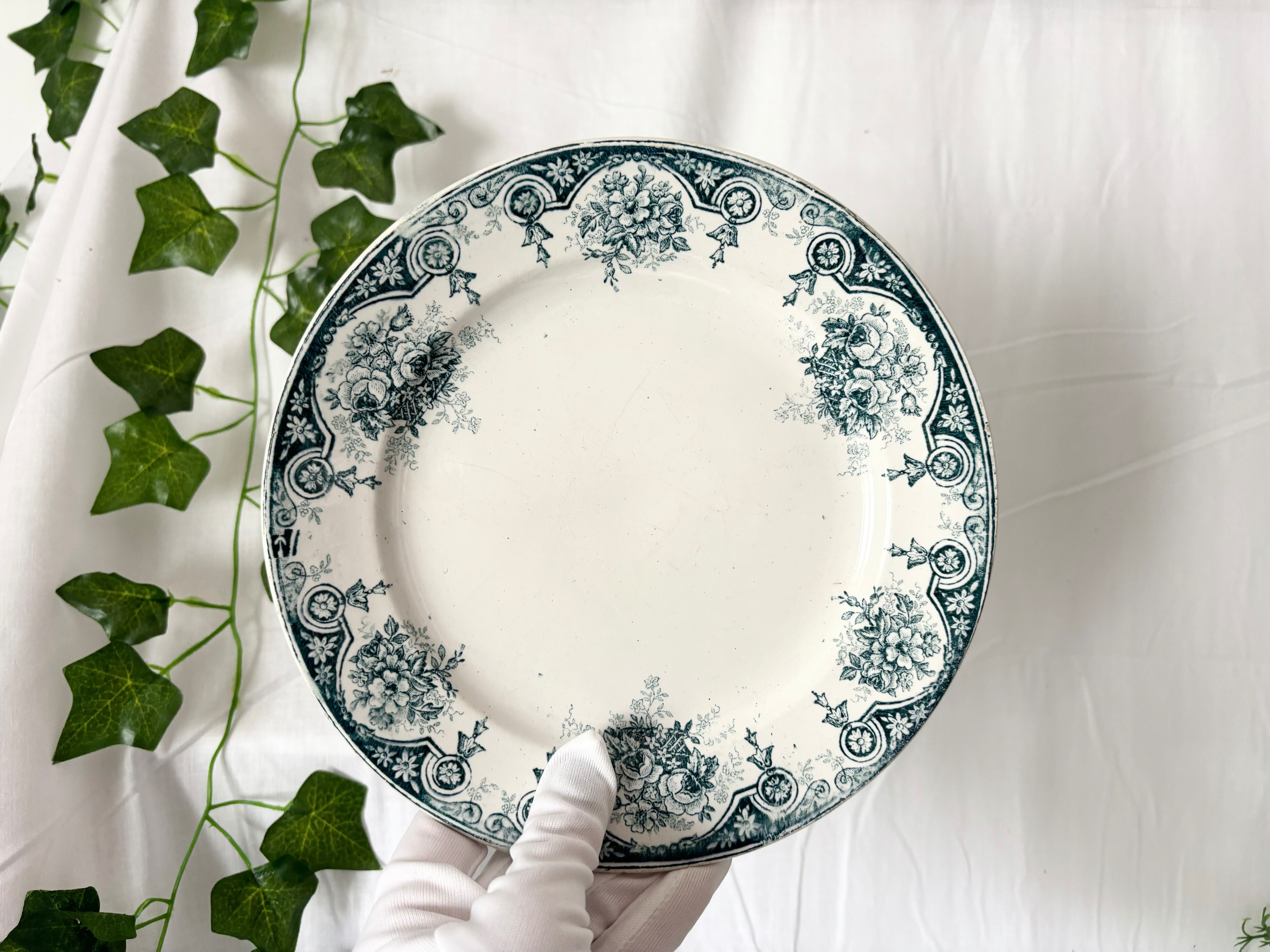 アイテムのコンディションとして、絵柄に掠れがございます。また、お皿の表面にカトラリー傷と小さな鉄粉のような点々が数カ所確認できます。お皿を横から見ると、縁に小さな傷があり、ザラついた部分もございます。