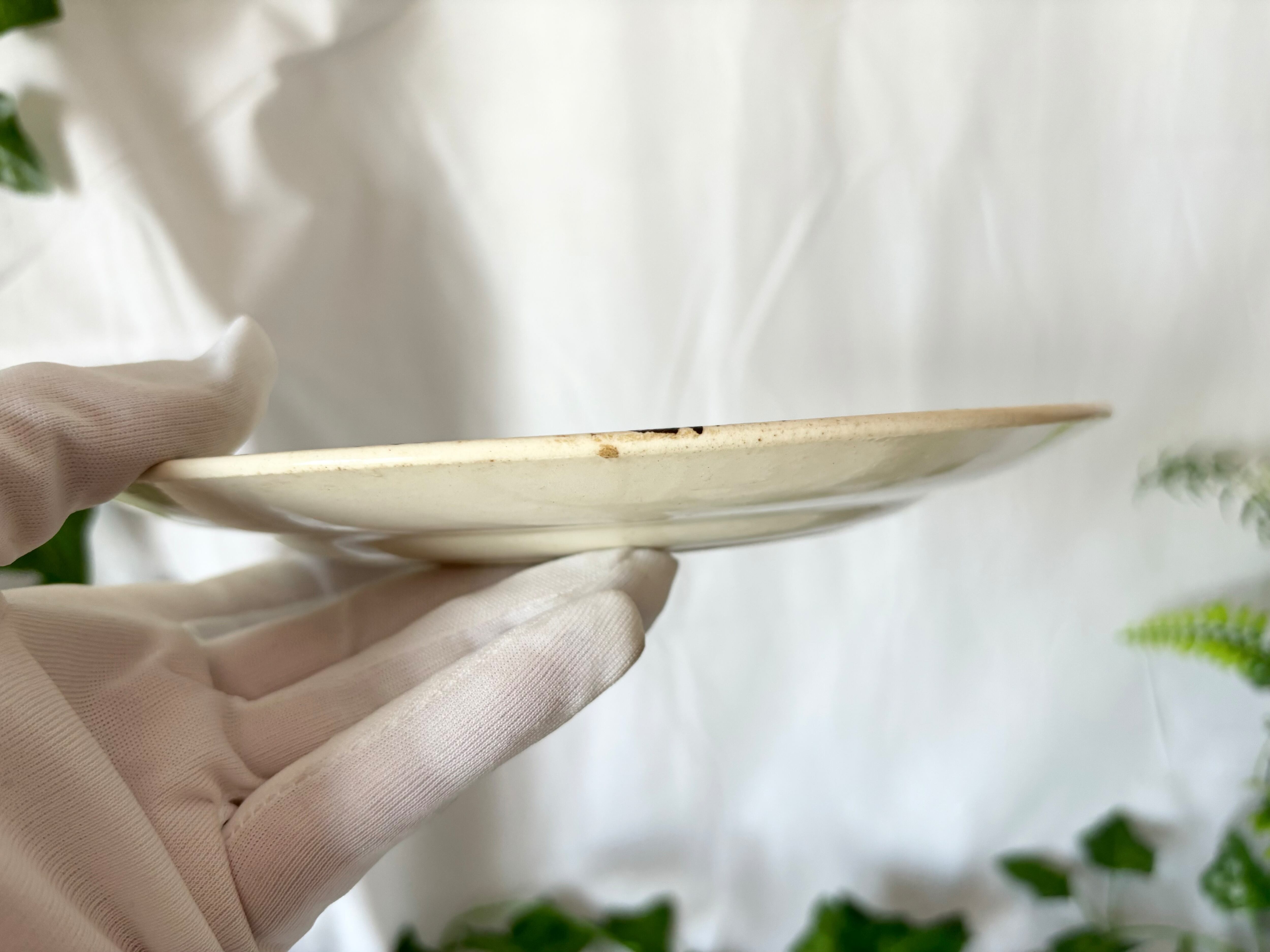 お皿の表面にカトラリー跡がほんの少し確認できます。極小さなシミがございます。横から見ると小傷と、茶色く変色した部分がございます。お皿の裏、リムに軽い色飛びと、小さなコの字形の傷がございます。また、お皿制作時にできた突起、小傷と極小さな鉄粉のような点々はありますが、アンティークのお品として、大変良い状態のお品と言えます。