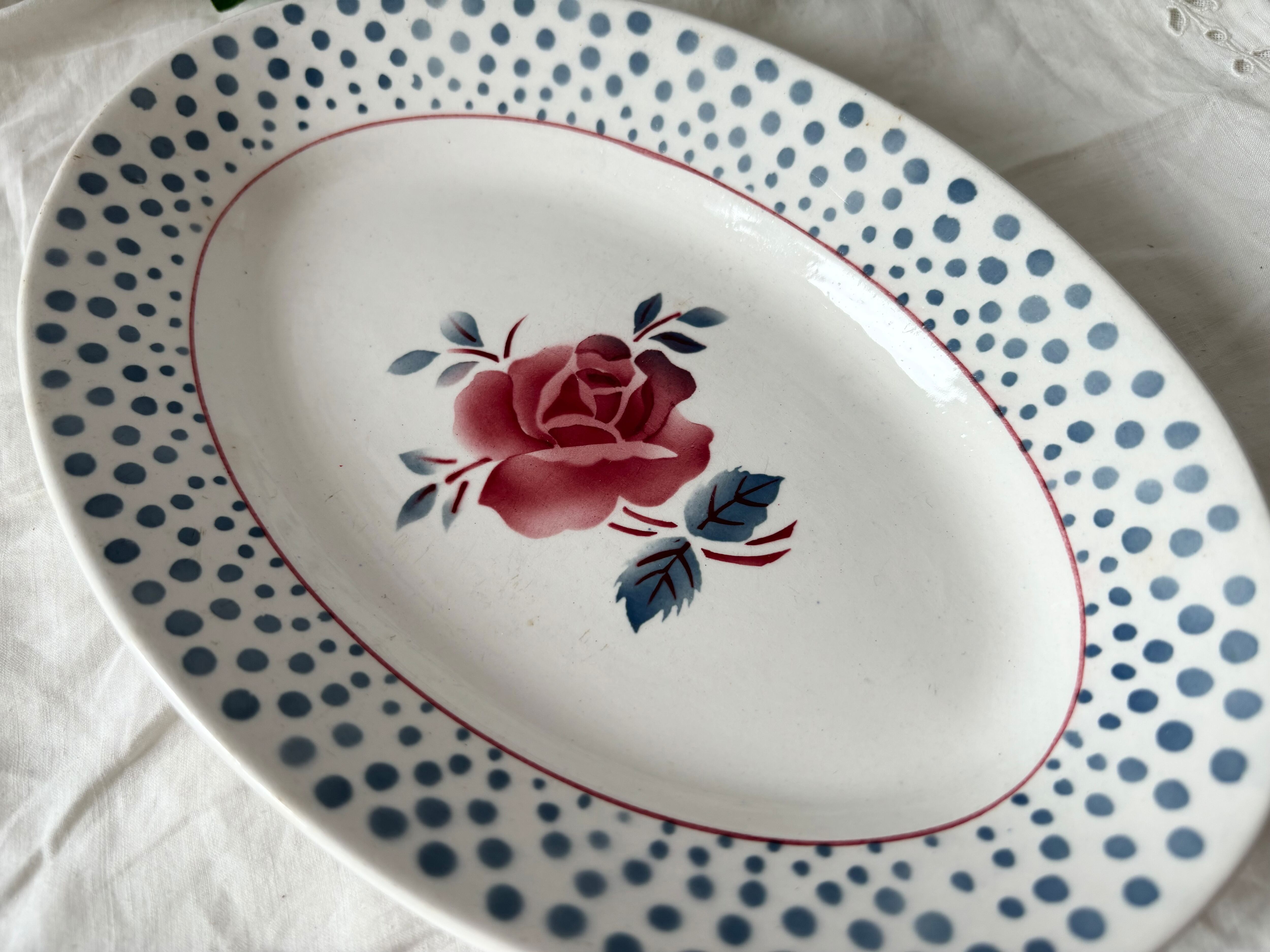 フランス、DIGOIN のSarregueminesより、赤い薔薇とビビットなドット柄が印象的な、RENEシリーズのラヴィエをご紹介いたします。