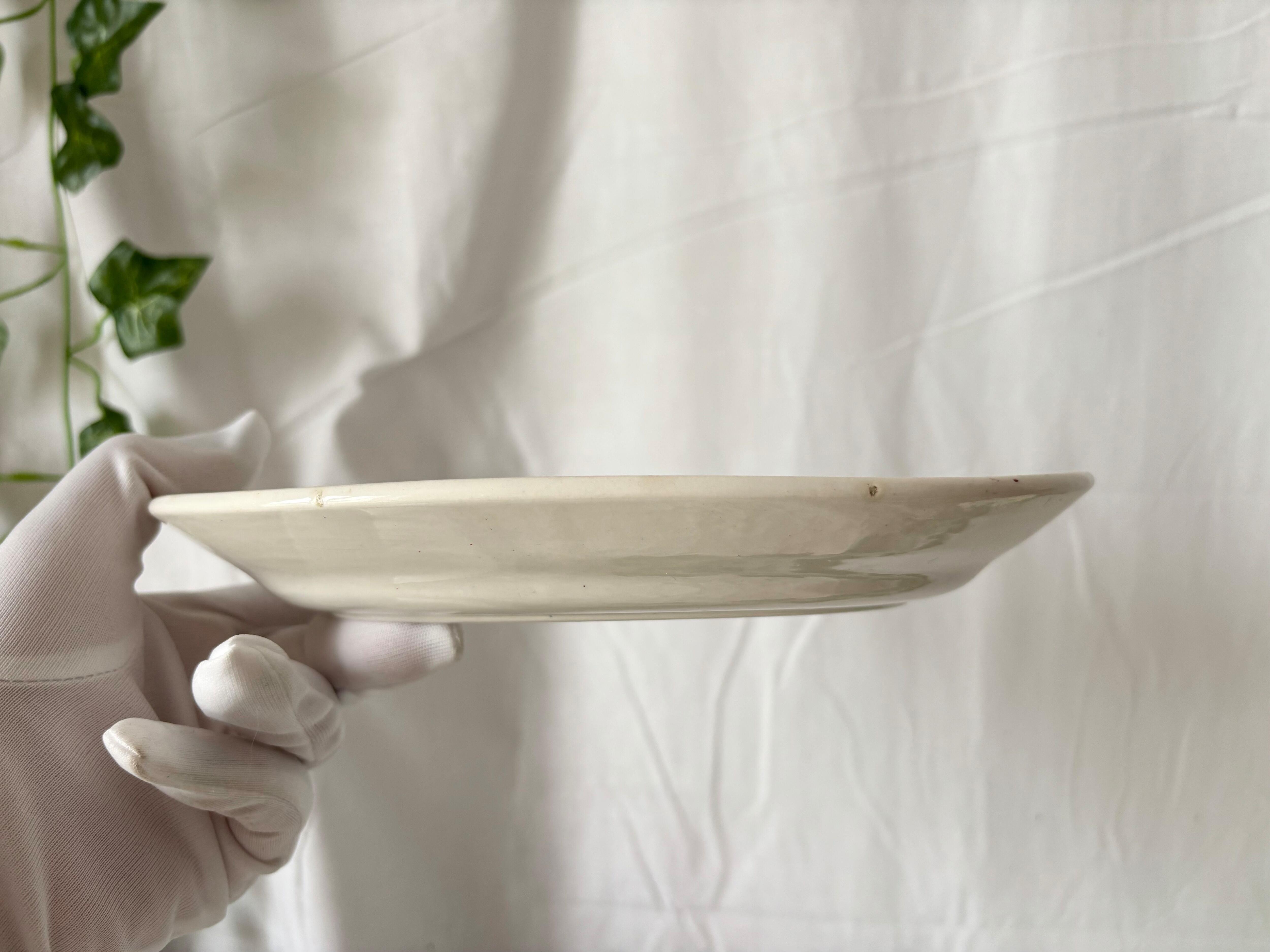 お皿の状態として、小さなカトラリー跡が多くみられます。お皿の縁に、製造時にできたと思われる小さな傷と赤い小さな色とびがございます。裏側のリムにも、突起状の茶色っぽい傷があり、刻印が掠れていますが、艶があり、アンティークとして、良い状態のお品といえます。