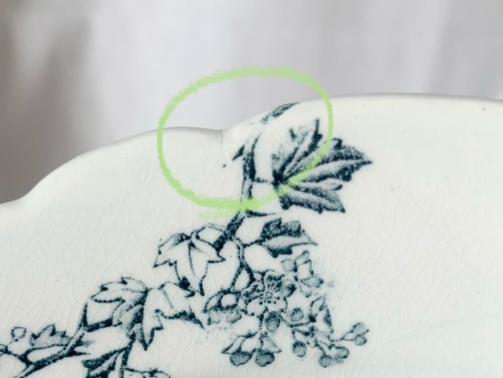 アイテムのコンディションとして、お皿の中央から、細かいクレイジングが広がっています。絵柄に掠れと、色飛びが数カ所ございます。裏側に色飛びが多くみられます。裏側のリムに細かい点々の傷がライン状に連なっている物と、小さなライン状のヒビが隣り合っている箇所がございます。この小さなヒビは、わずかにですが、表面からも確認できます。裏にLunevilleの刻印があります。