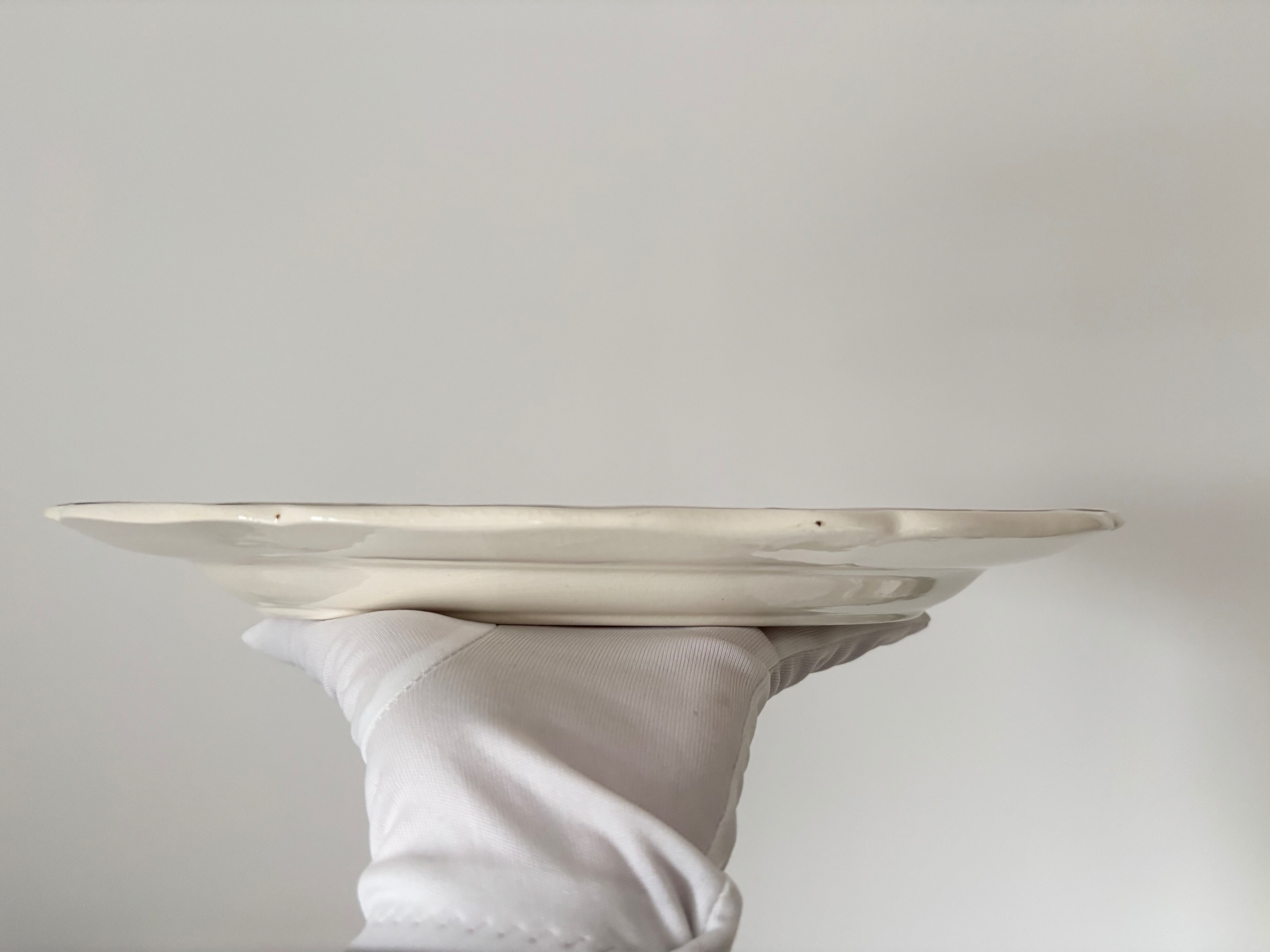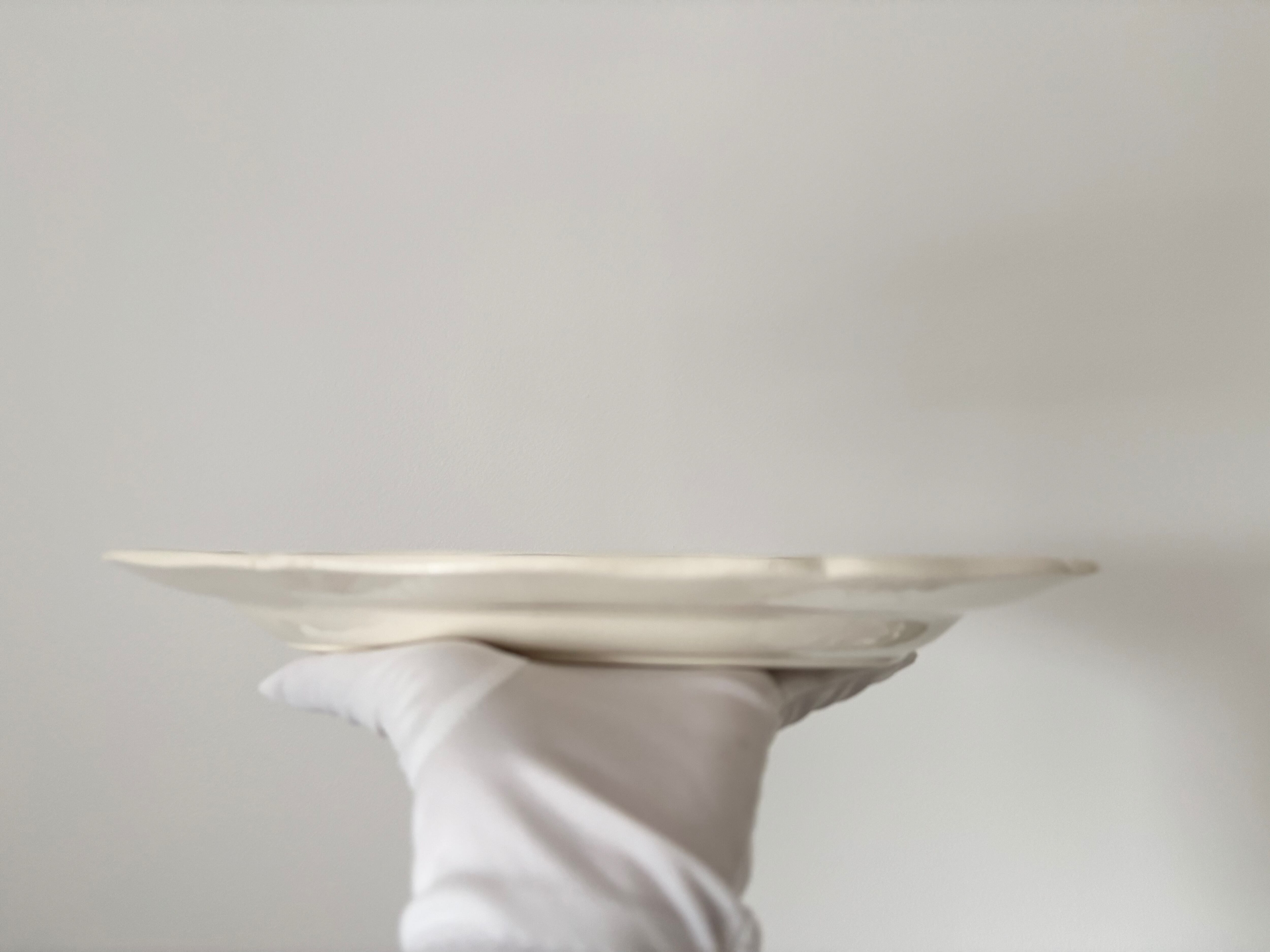 光にかざすと分かる程度のカトラリースクラッチがあります。表面の釉薬には艶が残っており、エナメルに多少の気泡がございます。
