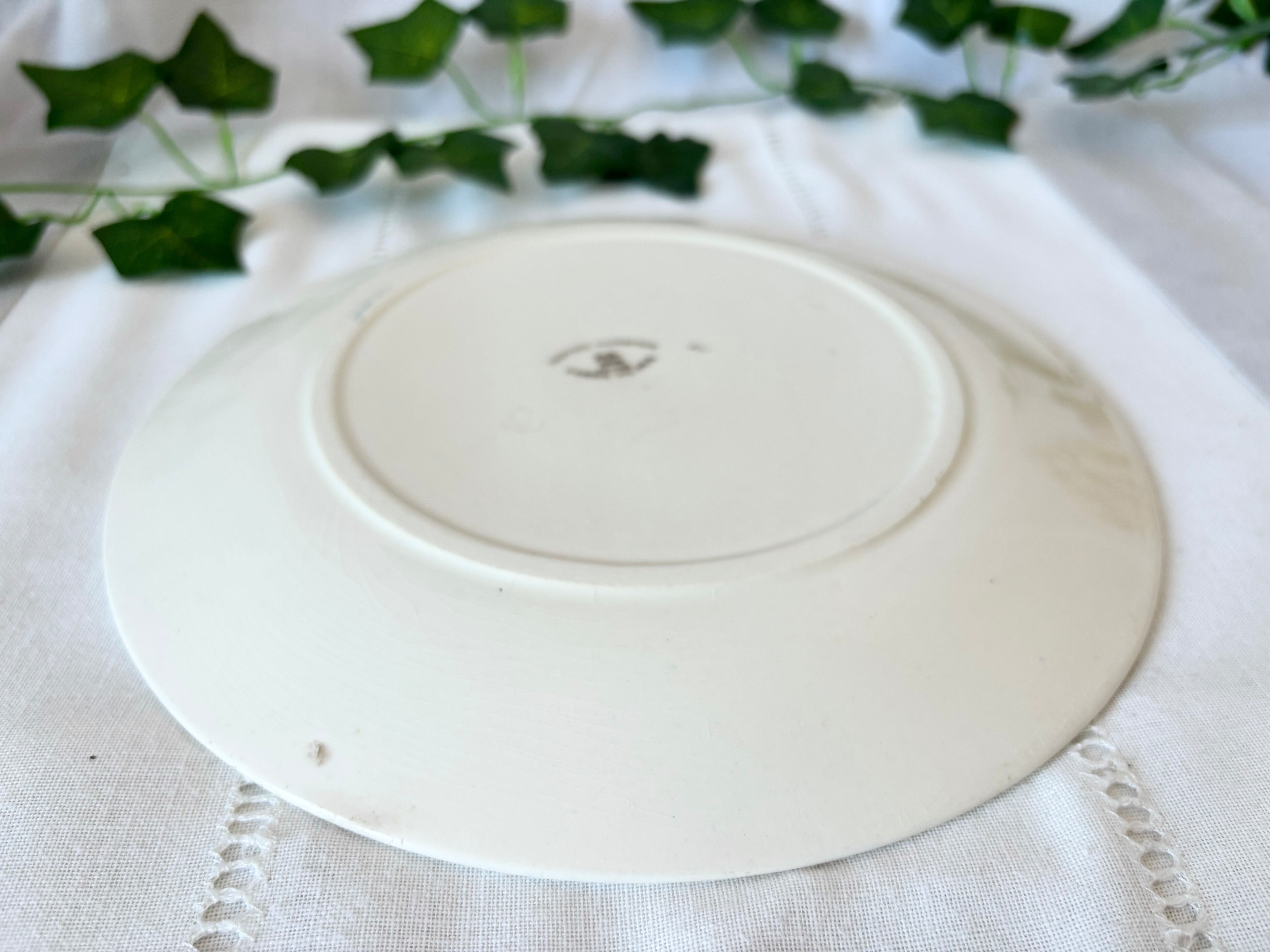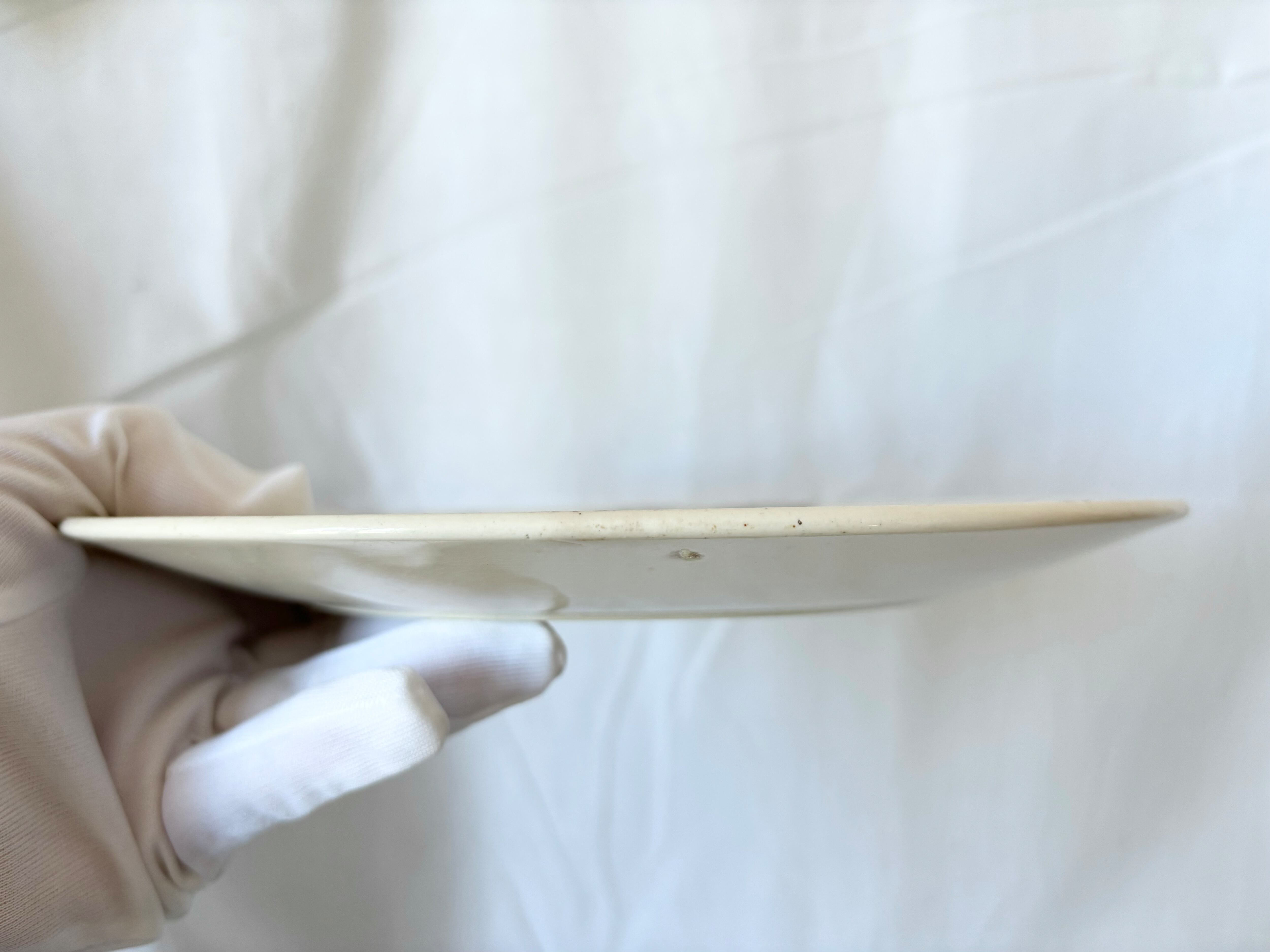 アイテムのコンディションとして、お皿全体に美しくクレイジングが広がっています。お皿の表面にカトラリー跡が認められます。中央とリムに青系の色飛びの様な点が見られます。お皿を横から見ると、制作時にできたと思われる突起と、小さな傷がいくつかございます。裏側にも青系の色飛びがあり、制作時にできたと思われる突起がございます。刻印はぼやけていますが、艶やかでアンティークとして良い状態です。