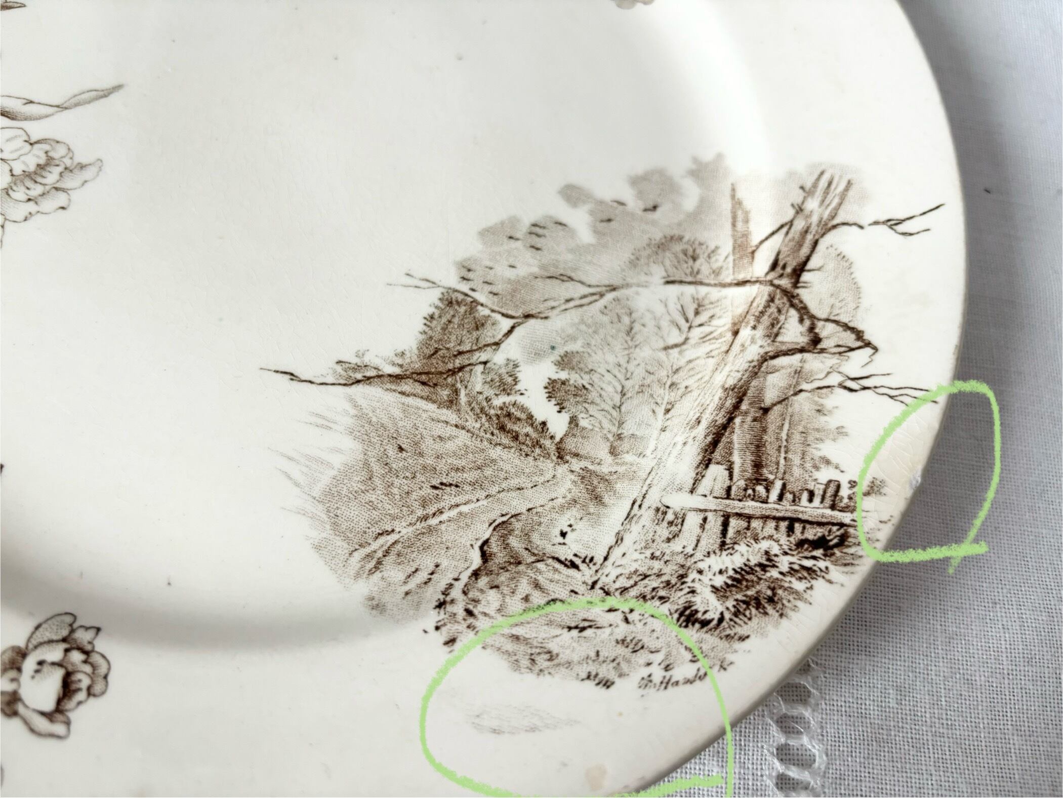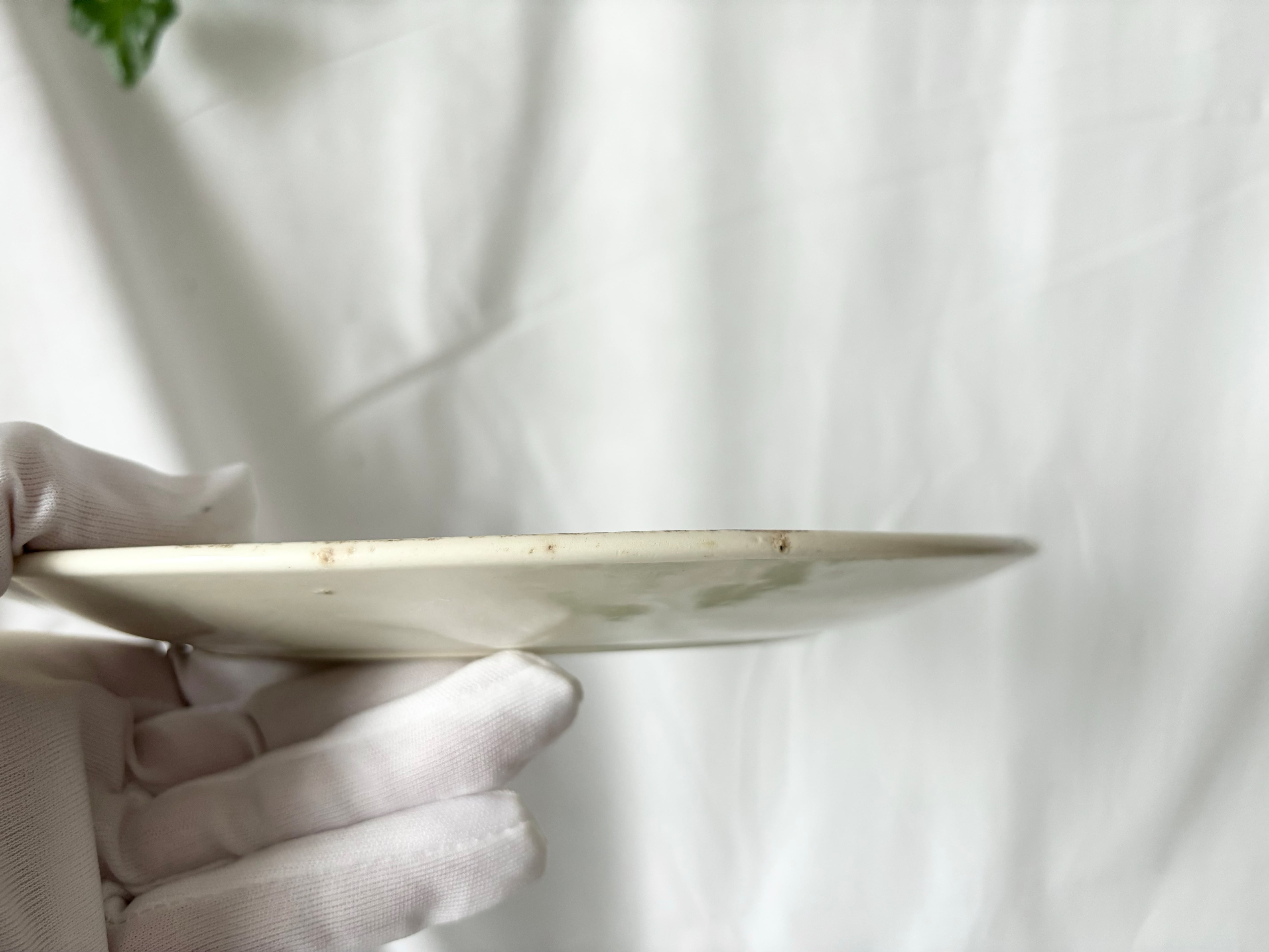 アイテムのコンディションとして、お皿全体に美しくクレイジングが広がっています。お皿の表面にカトラリー跡と小さな点々としたグレーの傷が認められます。絵柄に掠れや途切れた箇所を認められます。リムにうっすらとしたシミの一群があり、写真に印した様に、小傷とエナメルの塗り残し、や小さなシミがございます。お皿を横から見ると、制作時にできたと思われる突起と、小さな傷、薄いシミがいくつかございます。裏側にも制作時にできたと思われる突起と極小さな傷がいくつかございます。刻印の側に茶色い色飛びがあり、刻印は少しぼやけていますが、艶やかでアンティークとして良い状態です。