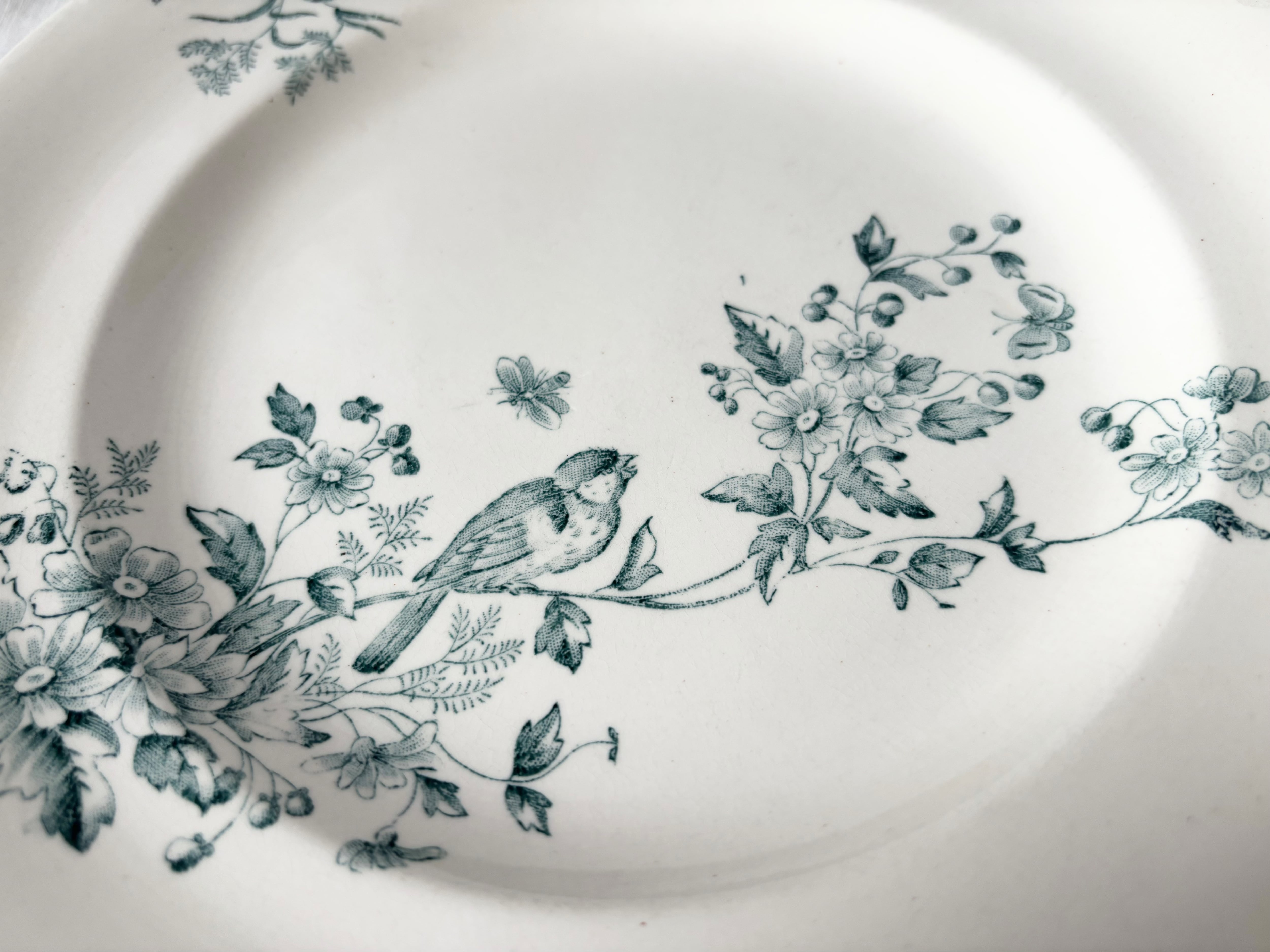 アイテムのコンディションとして、お皿全体に、うっすらとクレイジングが広がっています。表面のリムに一箇所黄色いシミがございます。また、その反対側のリムの一体が、釉薬の塗り具合のせいか、うっすらとグレーがかっています。裏側のリムに何ヶ所か茶色い小さなシミと、グレーがかった変色、小傷が認められます。絵柄や刻印に掠れや途切れもございますが、アンティークのお品として、良い状態を保っています。