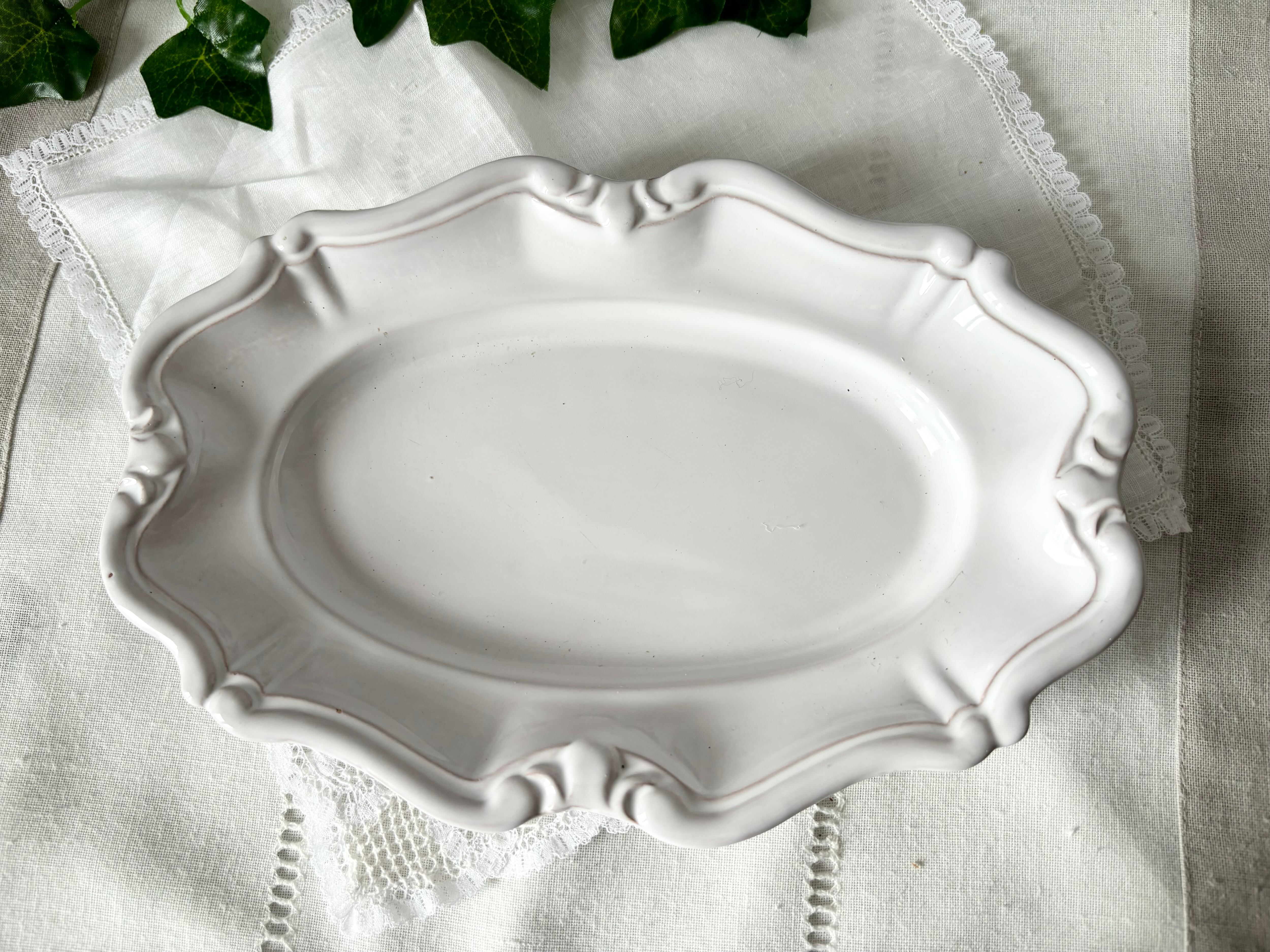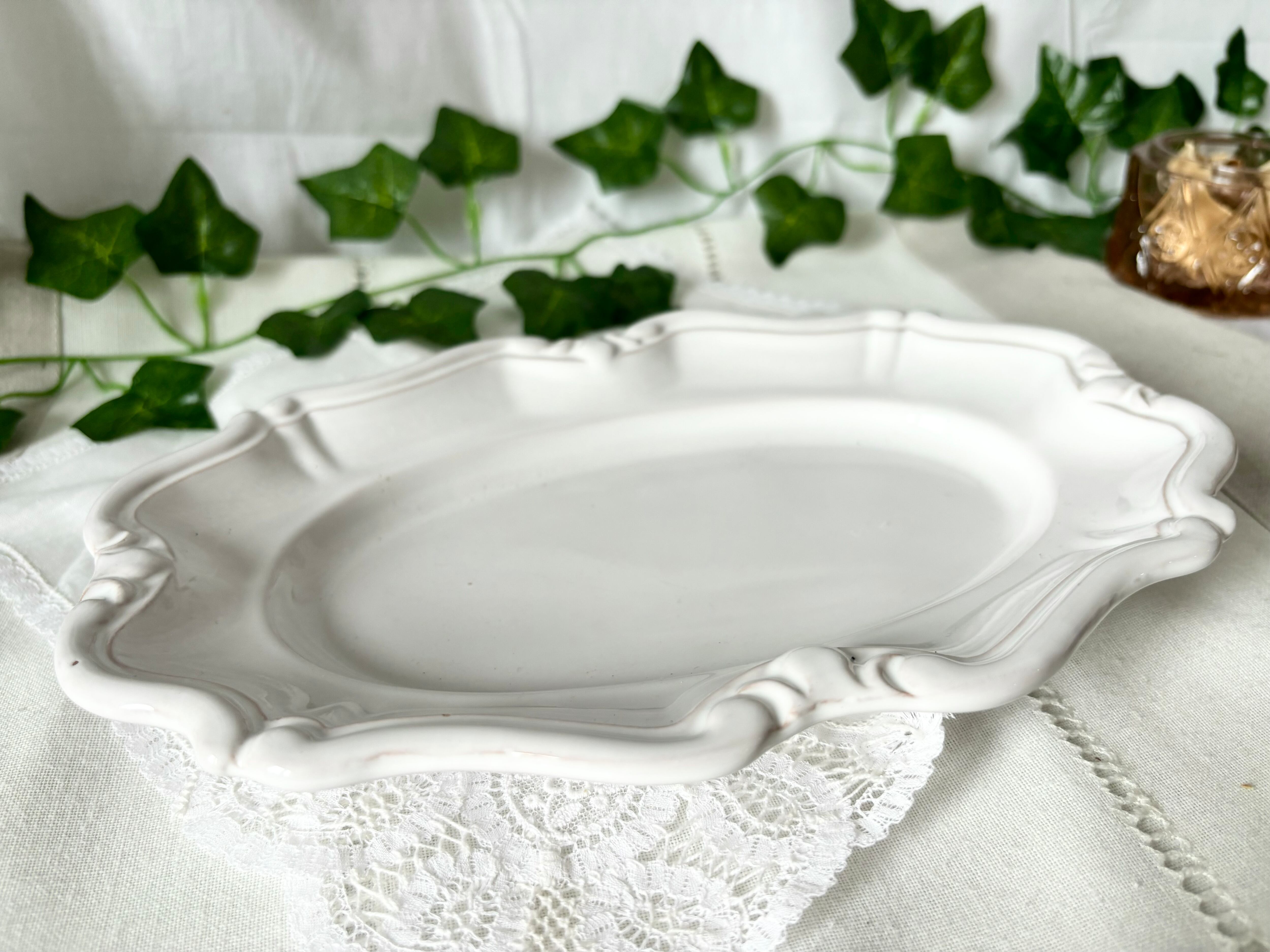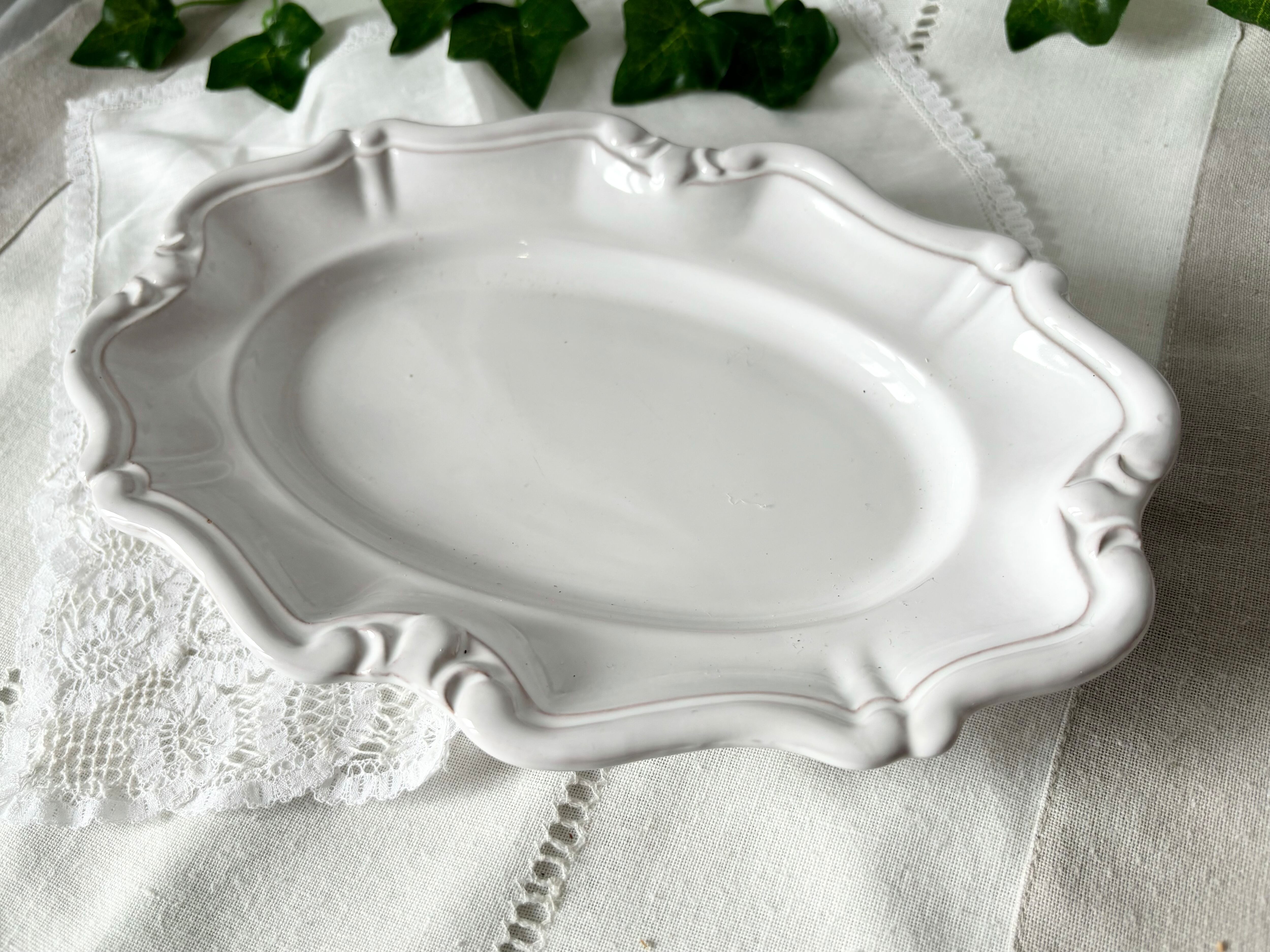 お皿に厚みがあり、リムに施された彫刻の掠れ具合も美しい、大変艶やかなお皿です。白い釉薬のアイテムですが、南仏焼き特有のベースとなる陶器の土色が透けているため、部分的に、ほんのりピンクがかっているのが、特徴です。