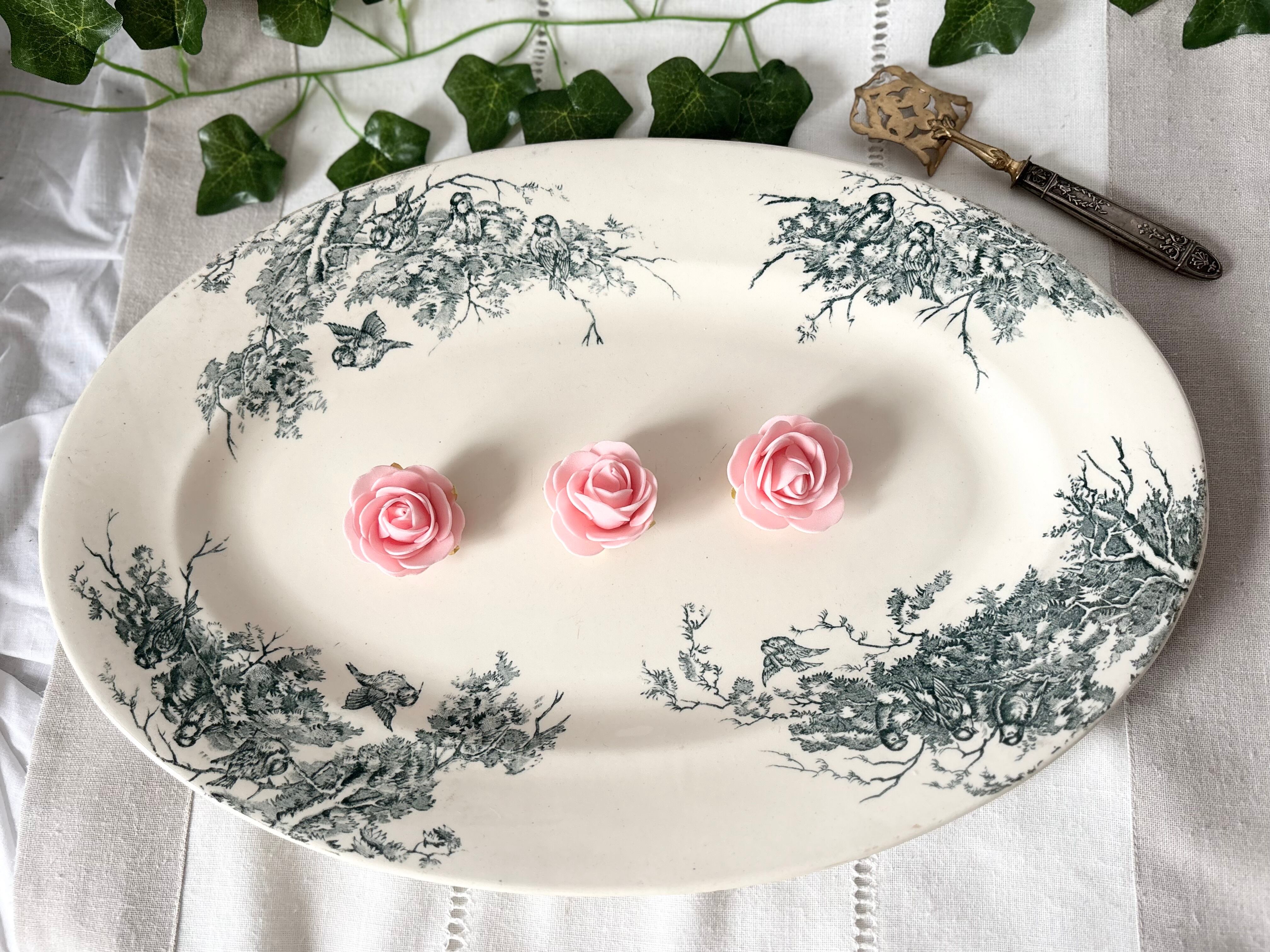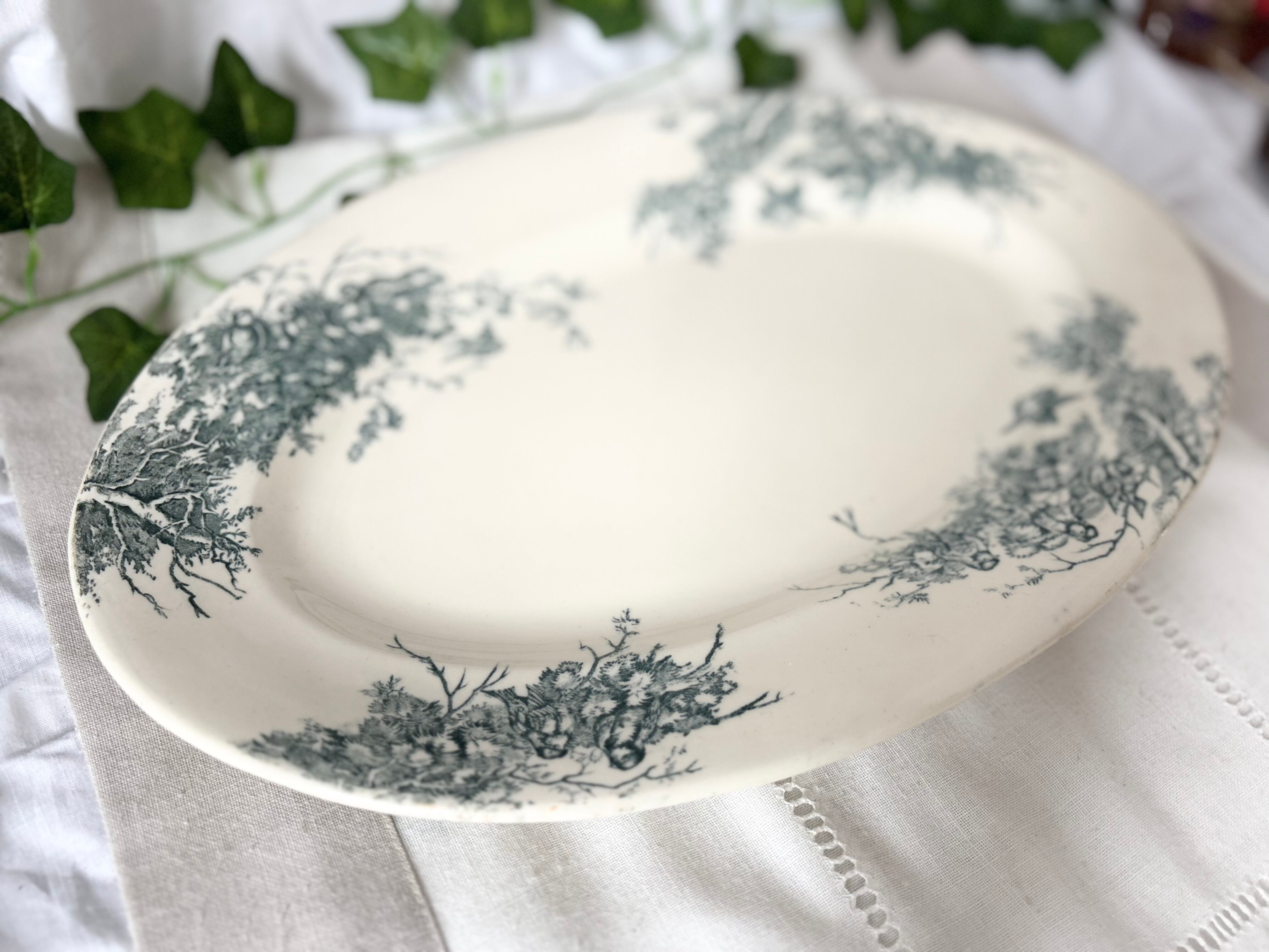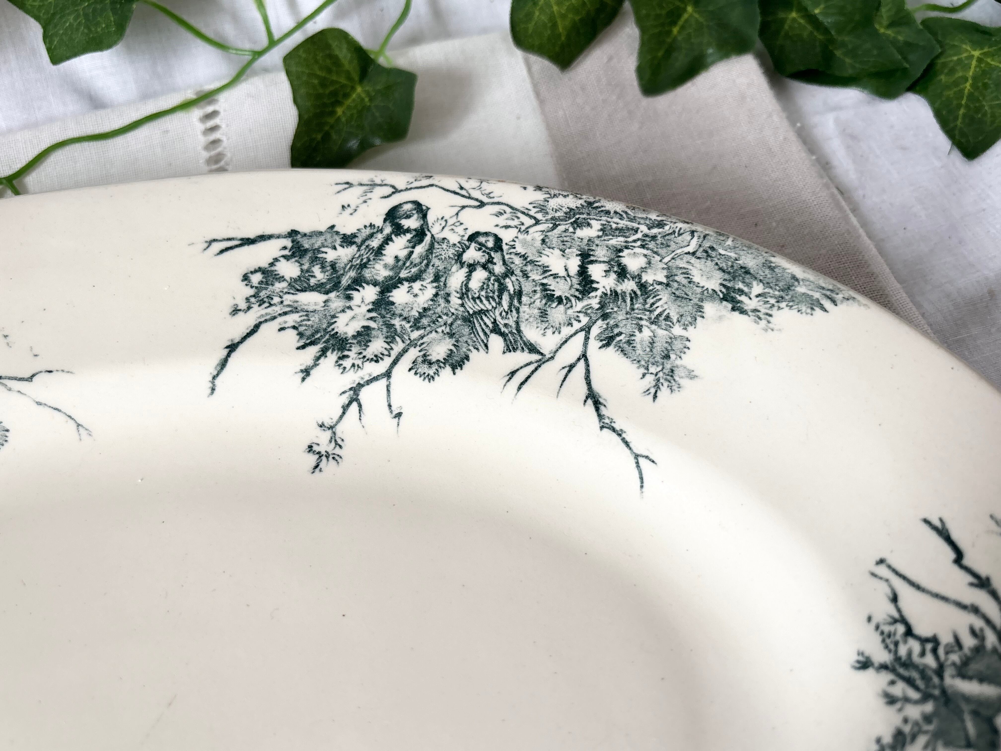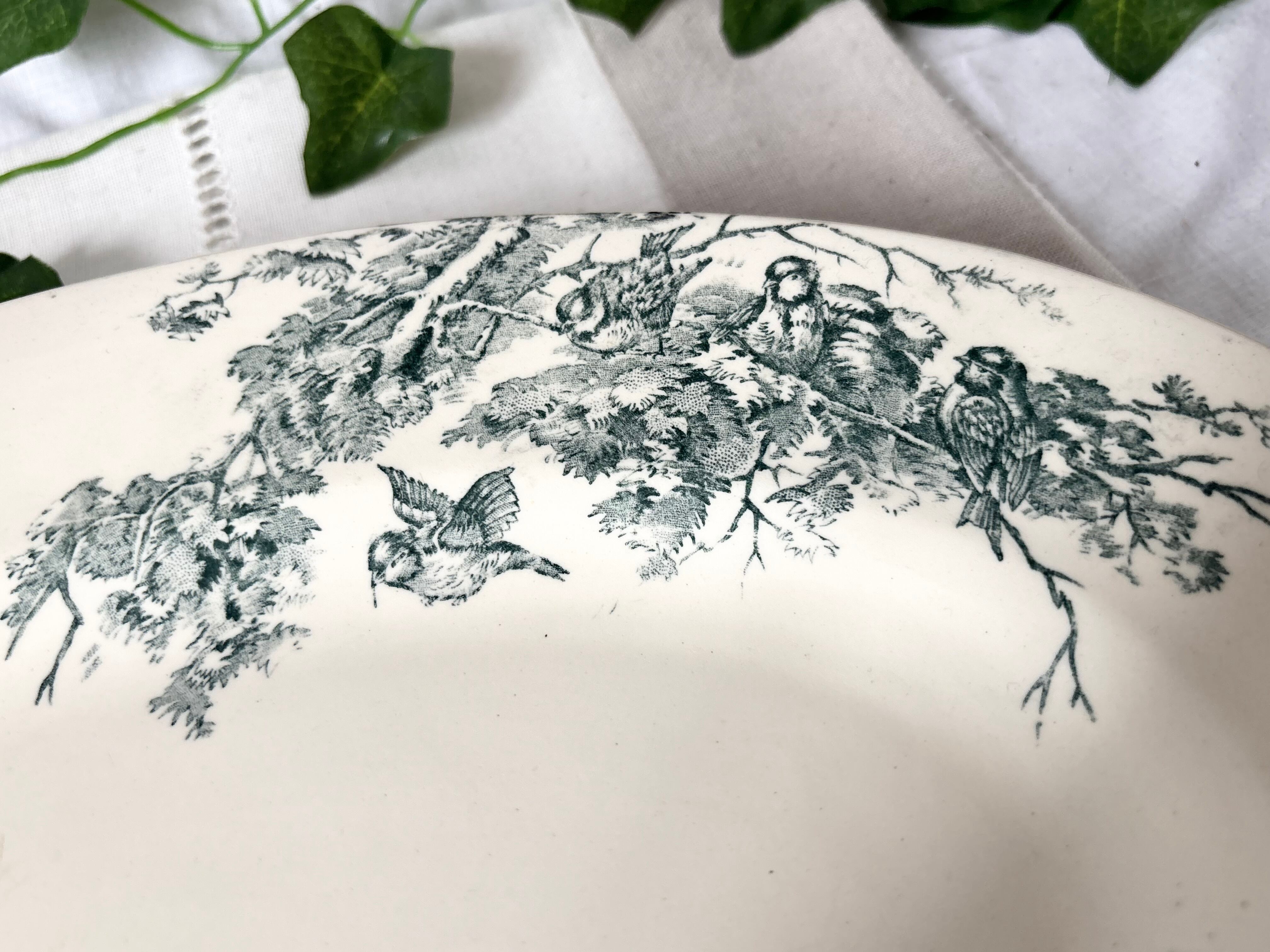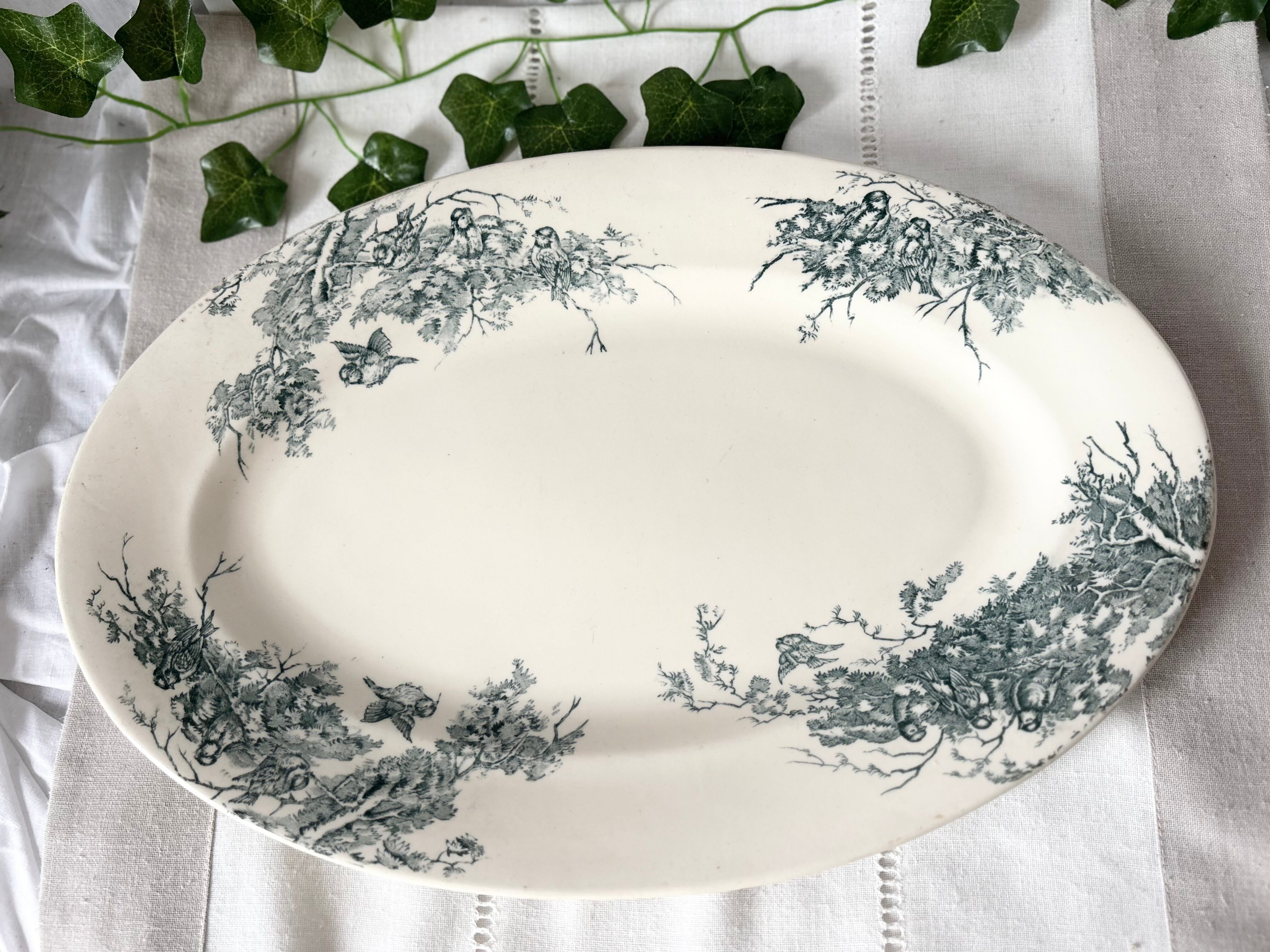 19世紀末から20世紀初頭のフランスより、Salinsのテールドフェール窯で作られた、Linottesシリーズのオーバルプレートをご紹介いたします。