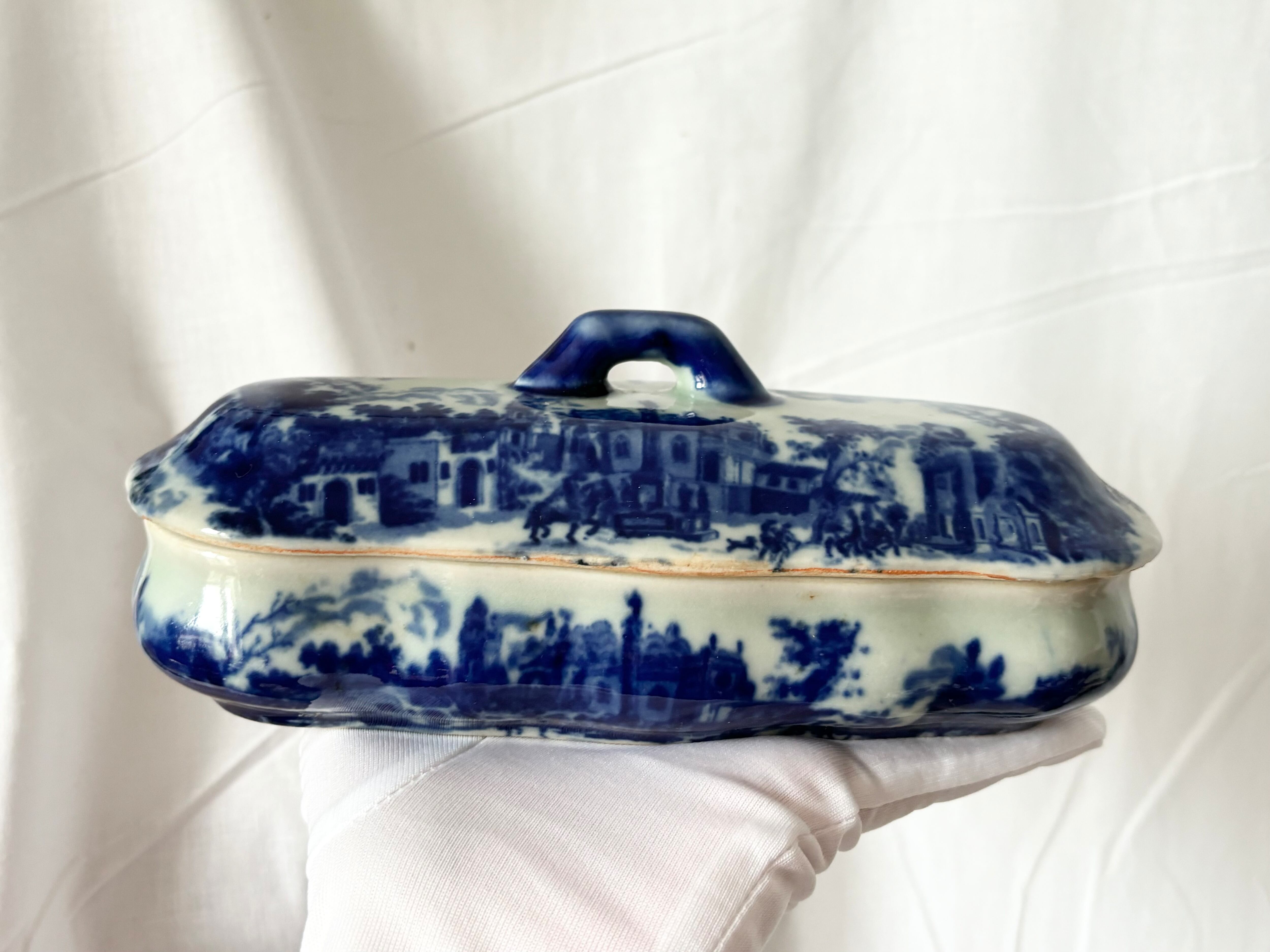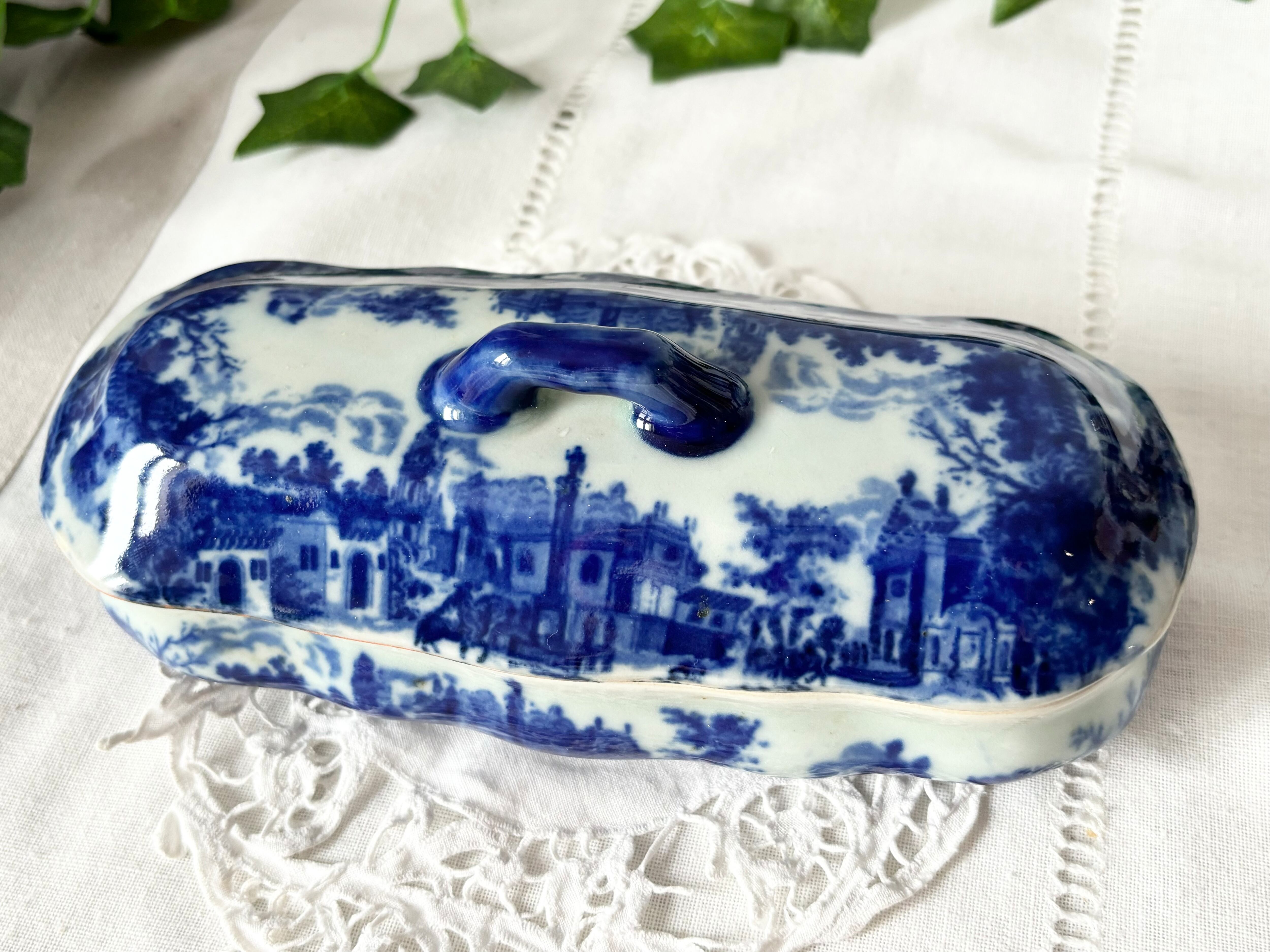 描かれているのは、19世紀頃の緑豊かな、小さな街の広場で、石造りの石像に、見事なファサードを構えた建物が並びます。そこを通りがかった人や馬、犬の姿等が見られ、小さな活気も感じられます。Flow Blue 特有の、じんわりと滲んだ青い釉薬で、これらの情景が、柔らかく、幻想的な世界観を持って表現されているのが、本アイテムの大きな特徴です。