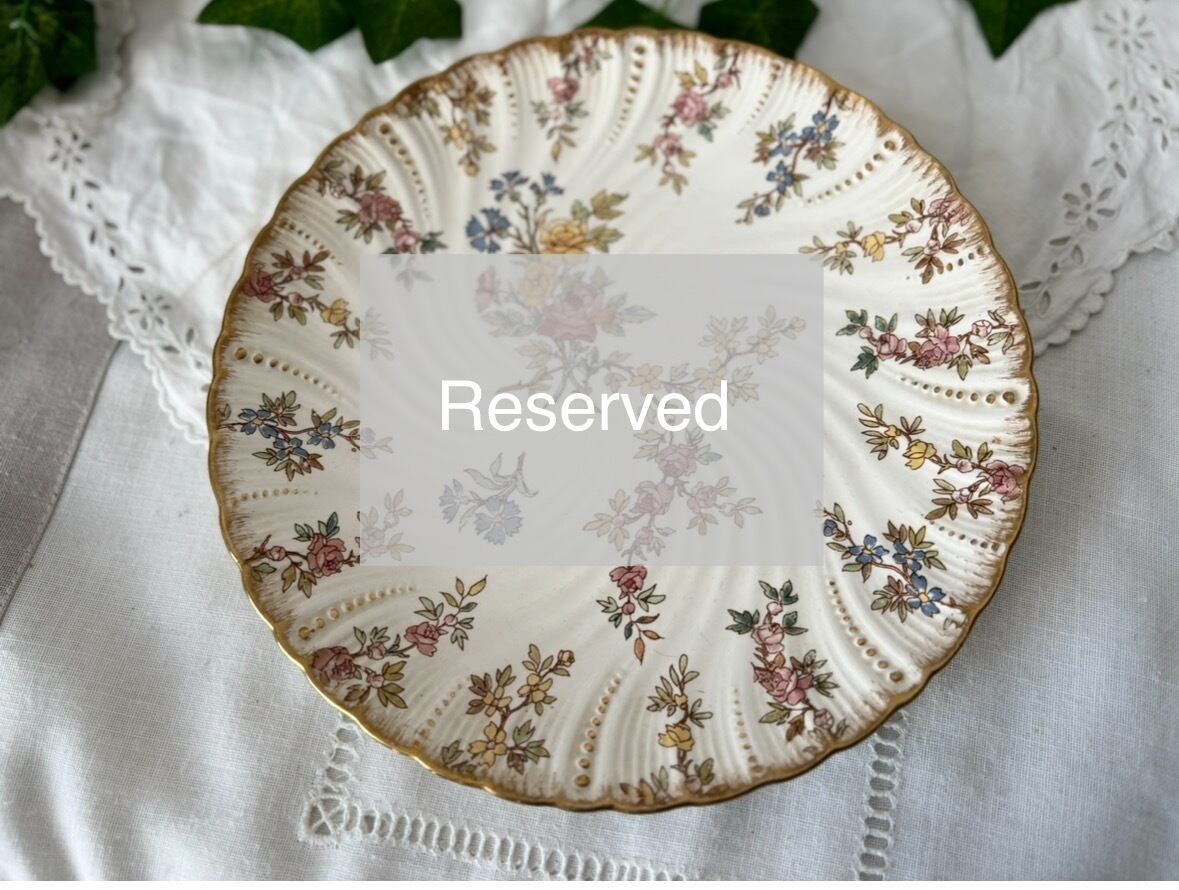 アイテムのコンディションとして、極僅かにカトラリー跡があり、お皿のリムに一部、ぼんやりと茶色がかった極薄い色褪せがございます。絵柄が僅かに掠れています。
