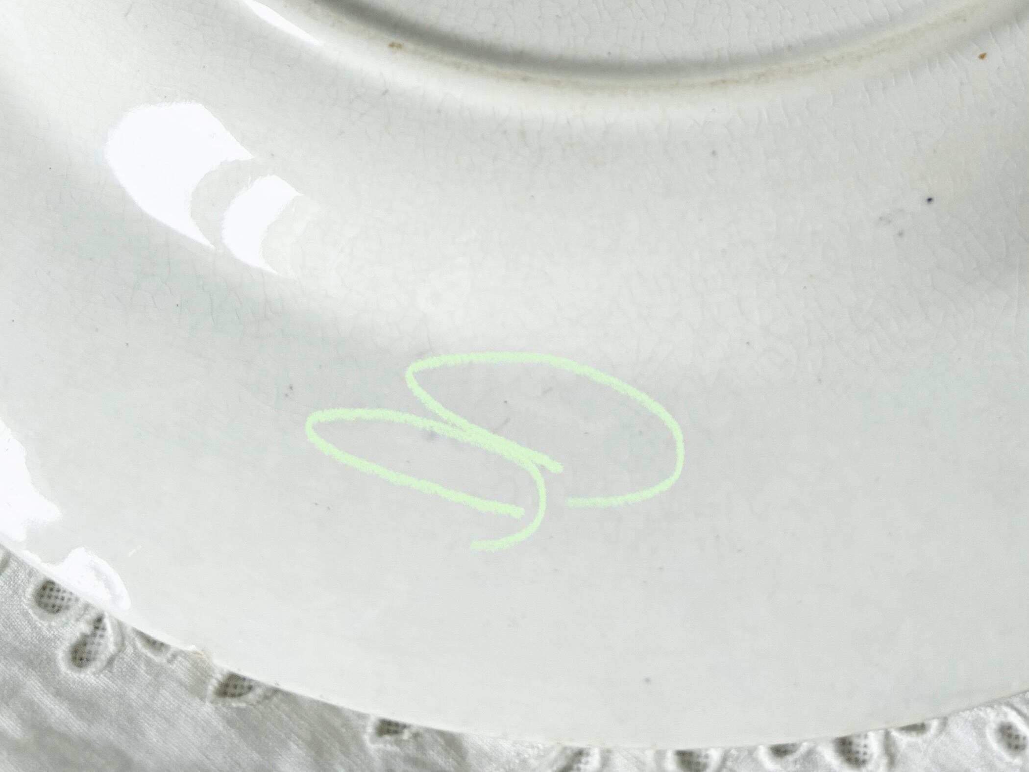裏から見ると、薄く変色したクレイジングが広がっていて、中央にいくつかシミの一群がございます。リムとお皿の膨らみの堺に、表側へは貫通していない、短い軽いヒビがございます。リムに色飛びがあり、刻印に僅かな掠れもありますが、艶やかで、アンティークとして良い状態のお品です。