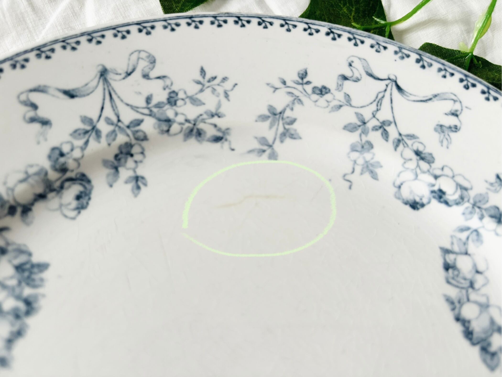 アイテムのコンディションとして、細かくクレイジングが広がっており、その一部が茶色く変色しています。色飛びと絵柄の掠れがみられます。カトラリー跡がございます。