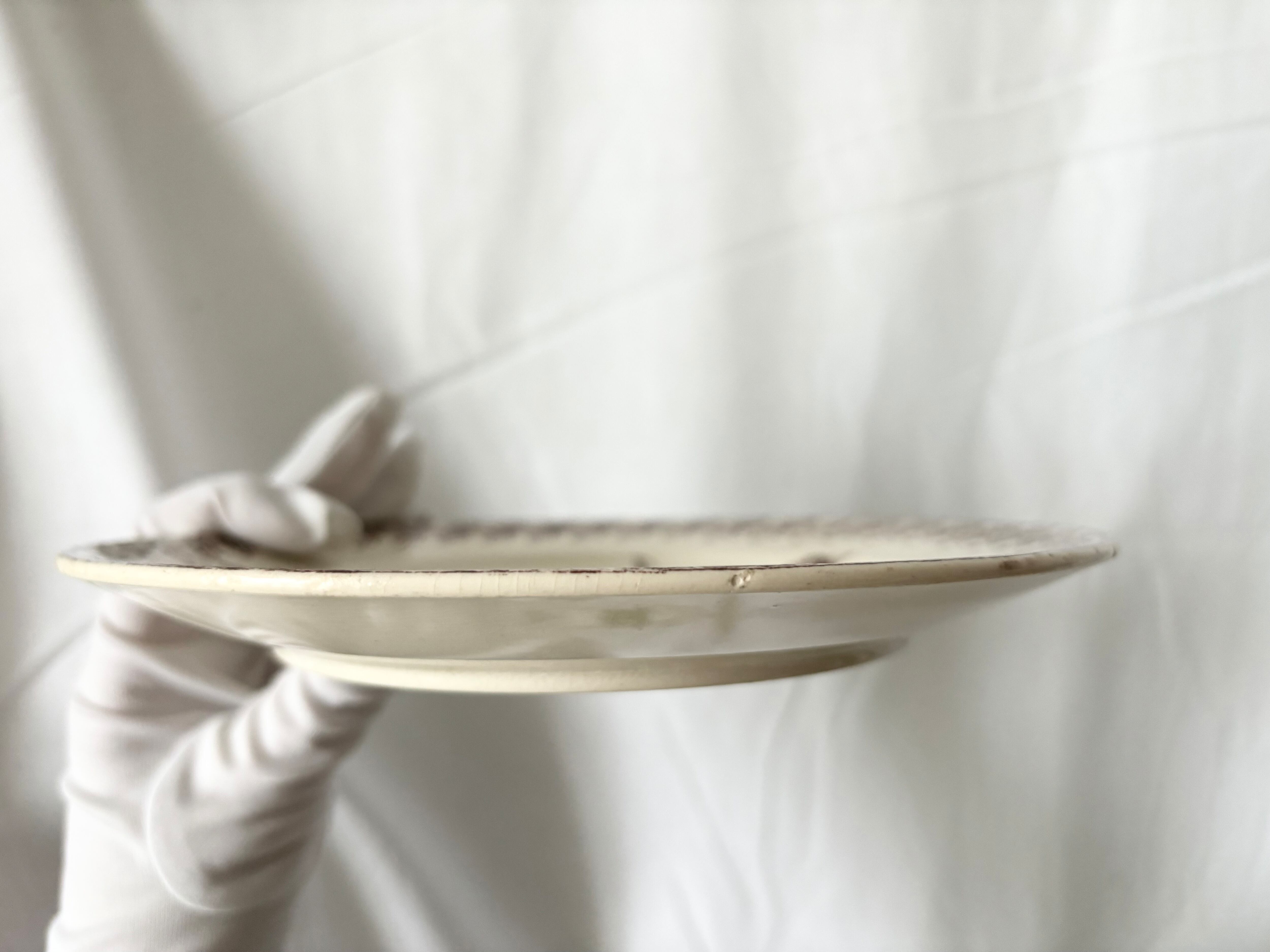 アイテムのコンディションとして、お皿全体にクレイジングがあり、経年劣化の色褪せが認められ、カトラリー跡がございます。絵柄に掠れや途切れがございます。